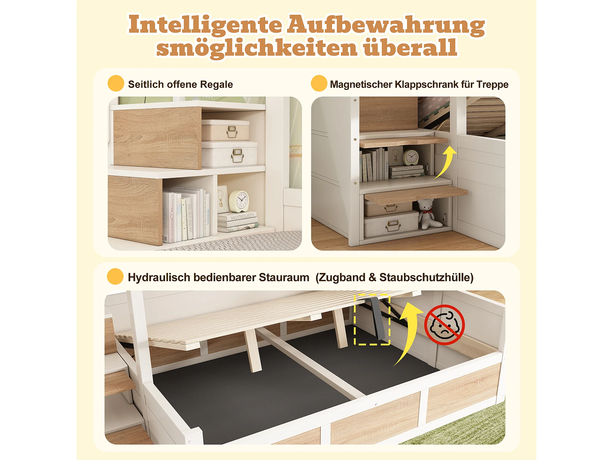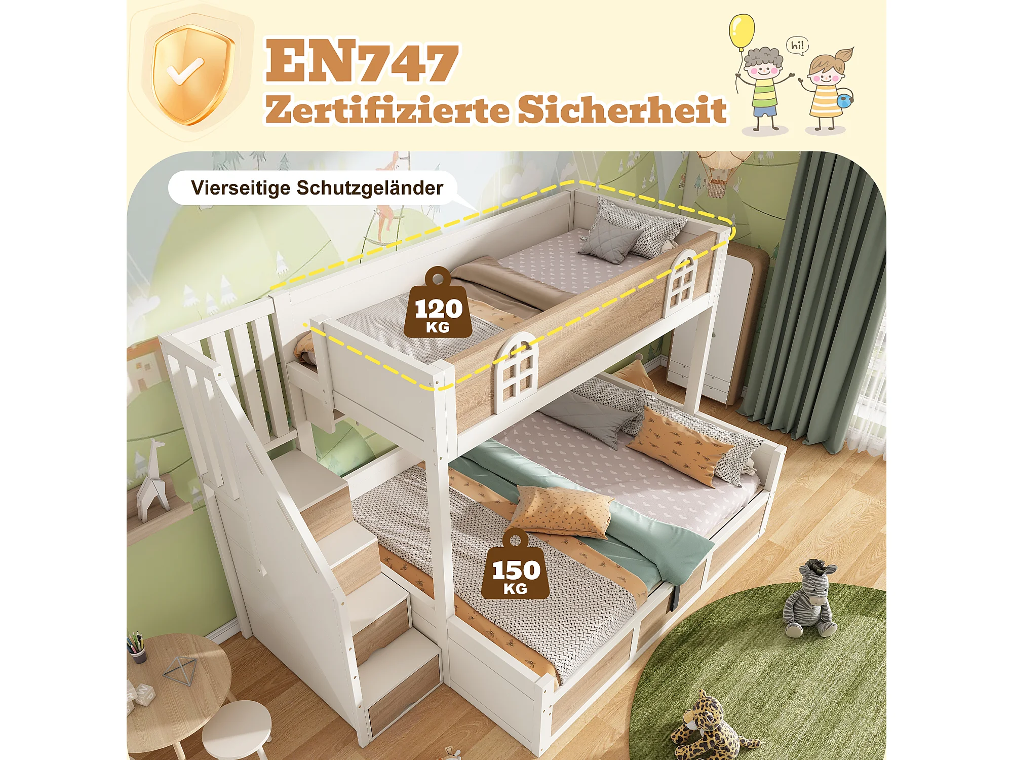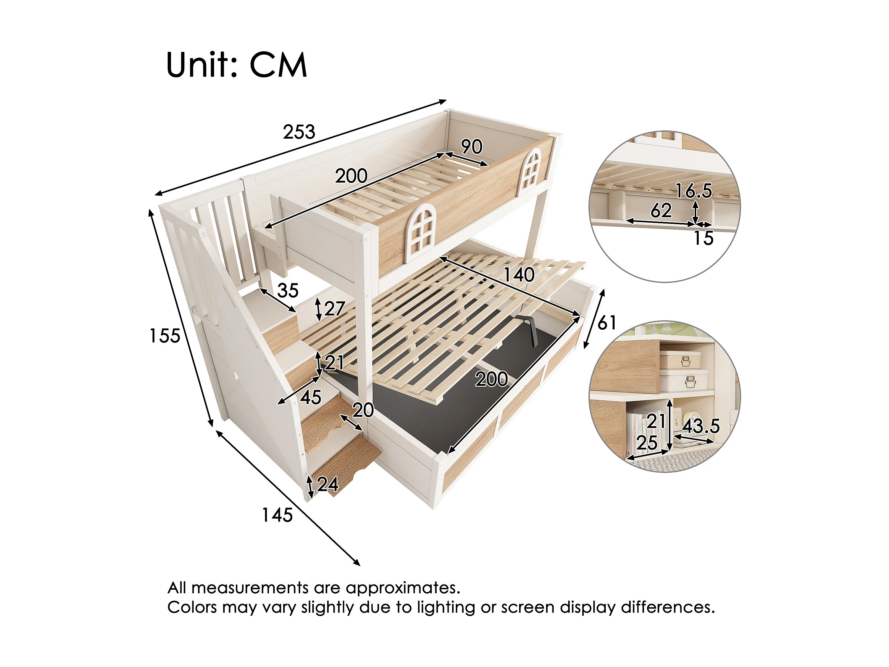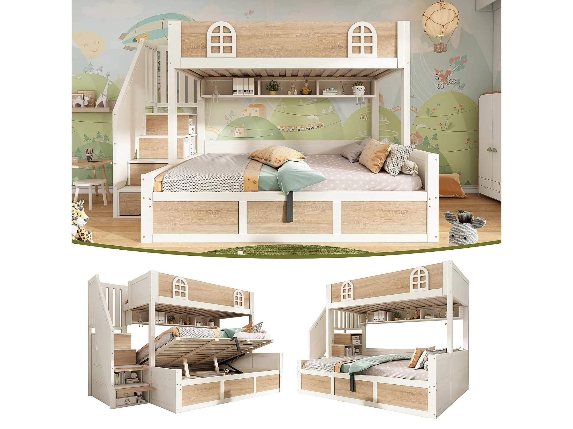 Lit superposé enfants - 90 x 200 + 140 x 200 cm - avec rangement hydraulique + escalier de rangement - bois - blanc + naturel