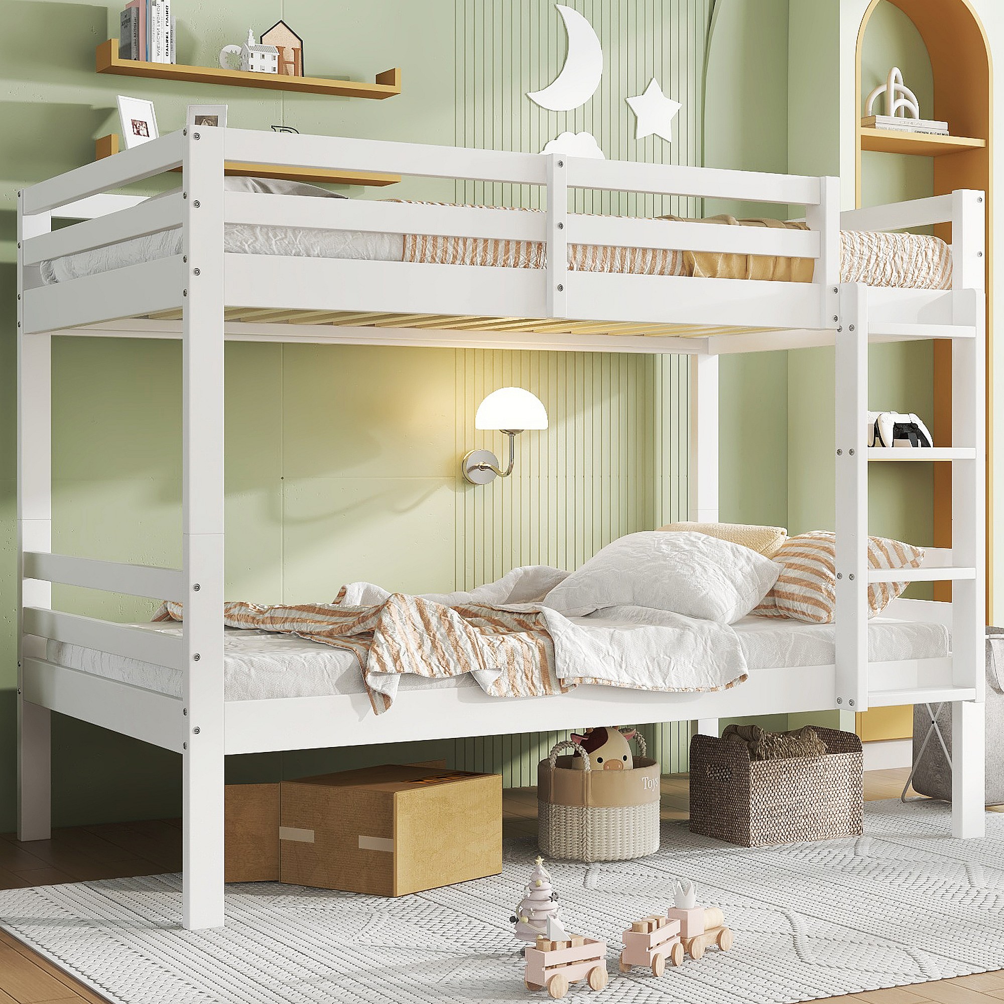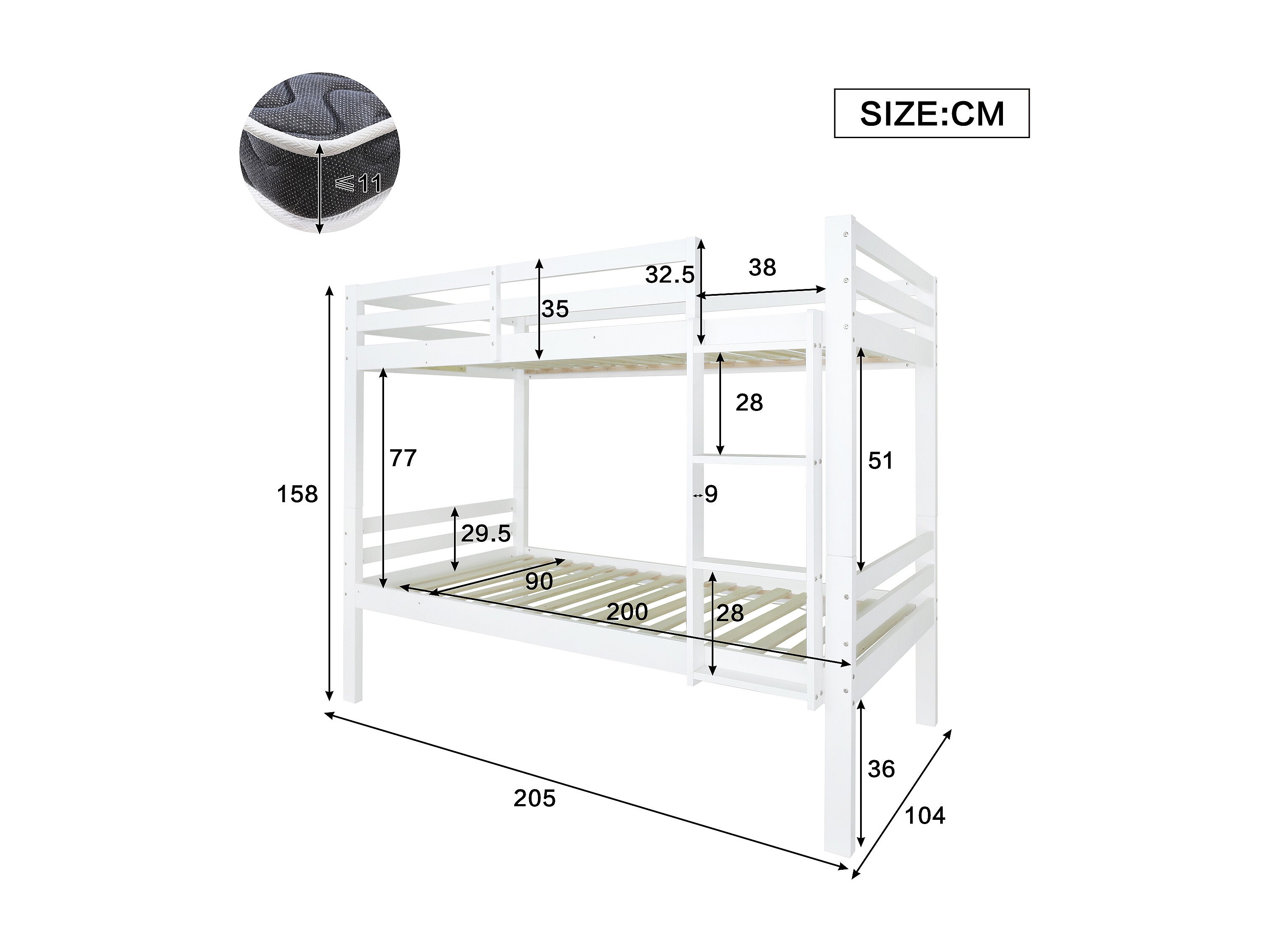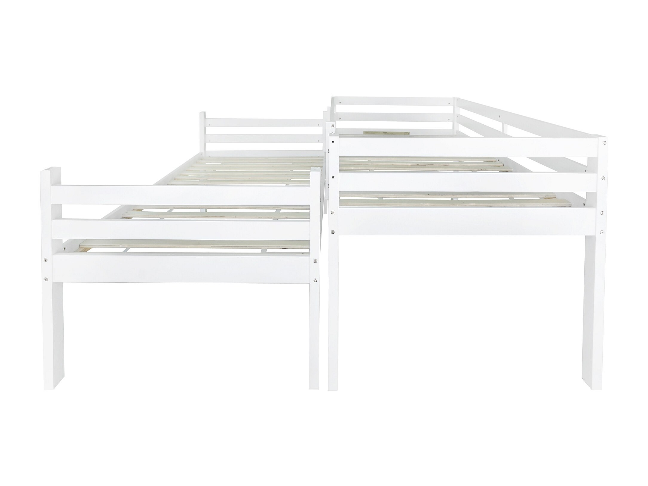 Lit superposé enfants, avec échelle angulaire, protection anti-chutes, 2 lits simples, cadre pin, blanc.
