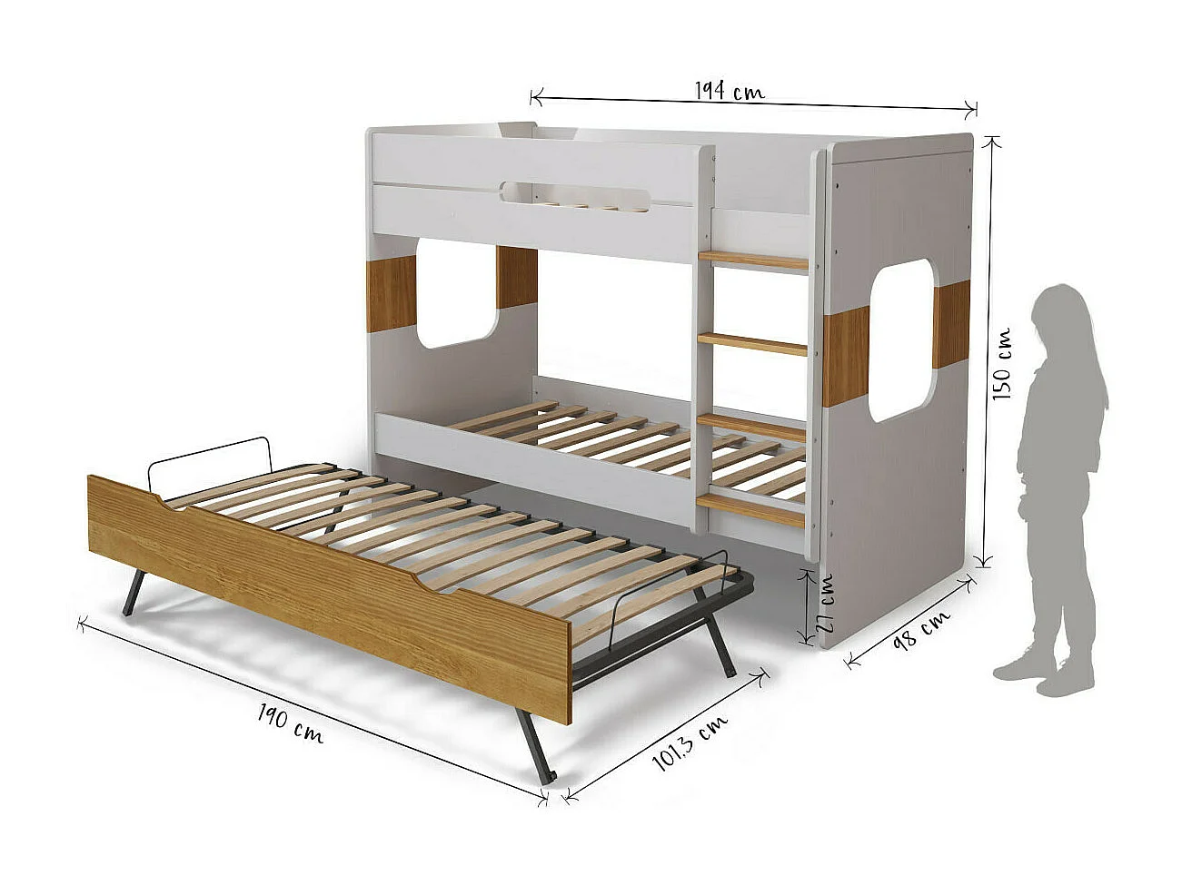 Lit superposé gigogne 90x190 cm panneaux de fibres blanc et noisette LEJI