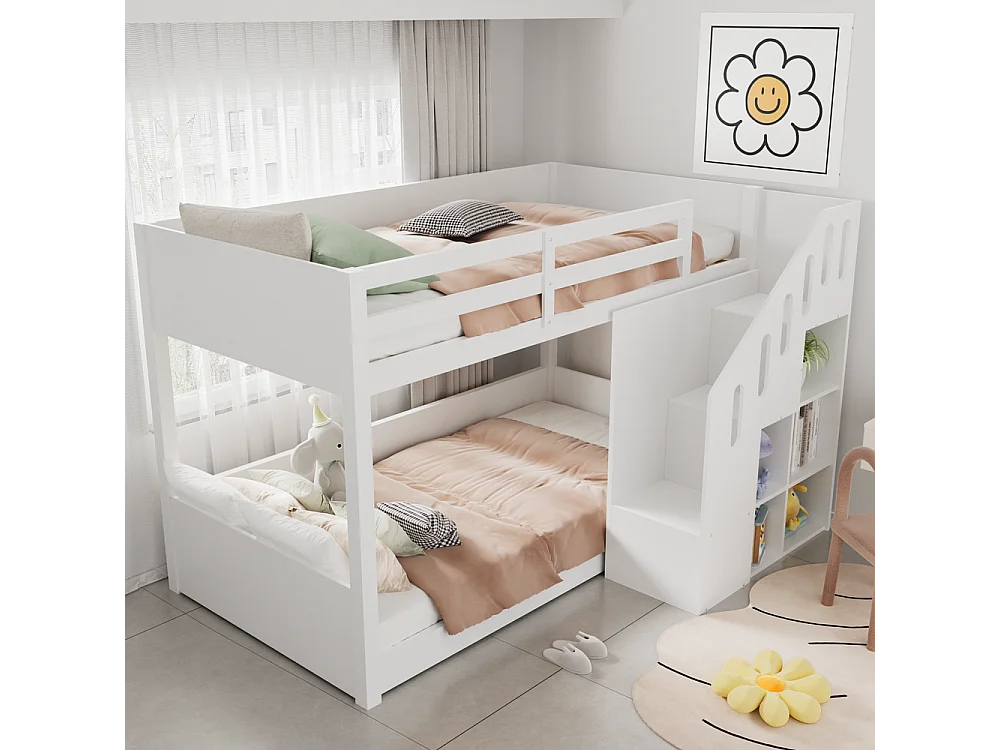 Lit superposé Lit 90x200 cm pour enfants Lit d'enfant multifonctionnel avec escaliers et casiers rampe stable blanc