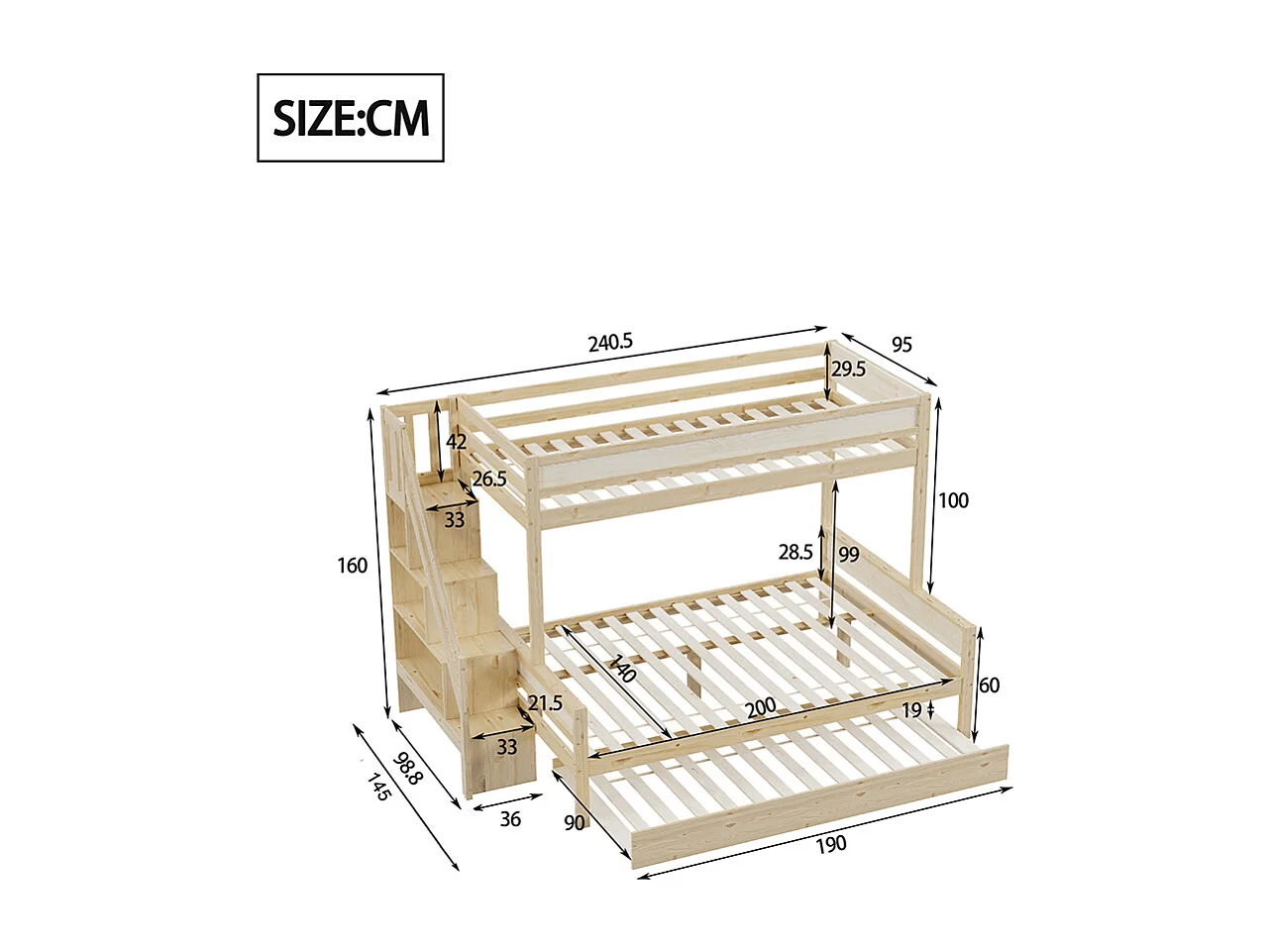 Lit superposé Lit d'enfant 90x200/140x200 cm lit gigogne 90x190 bois massif avec marches de sécurité naturel