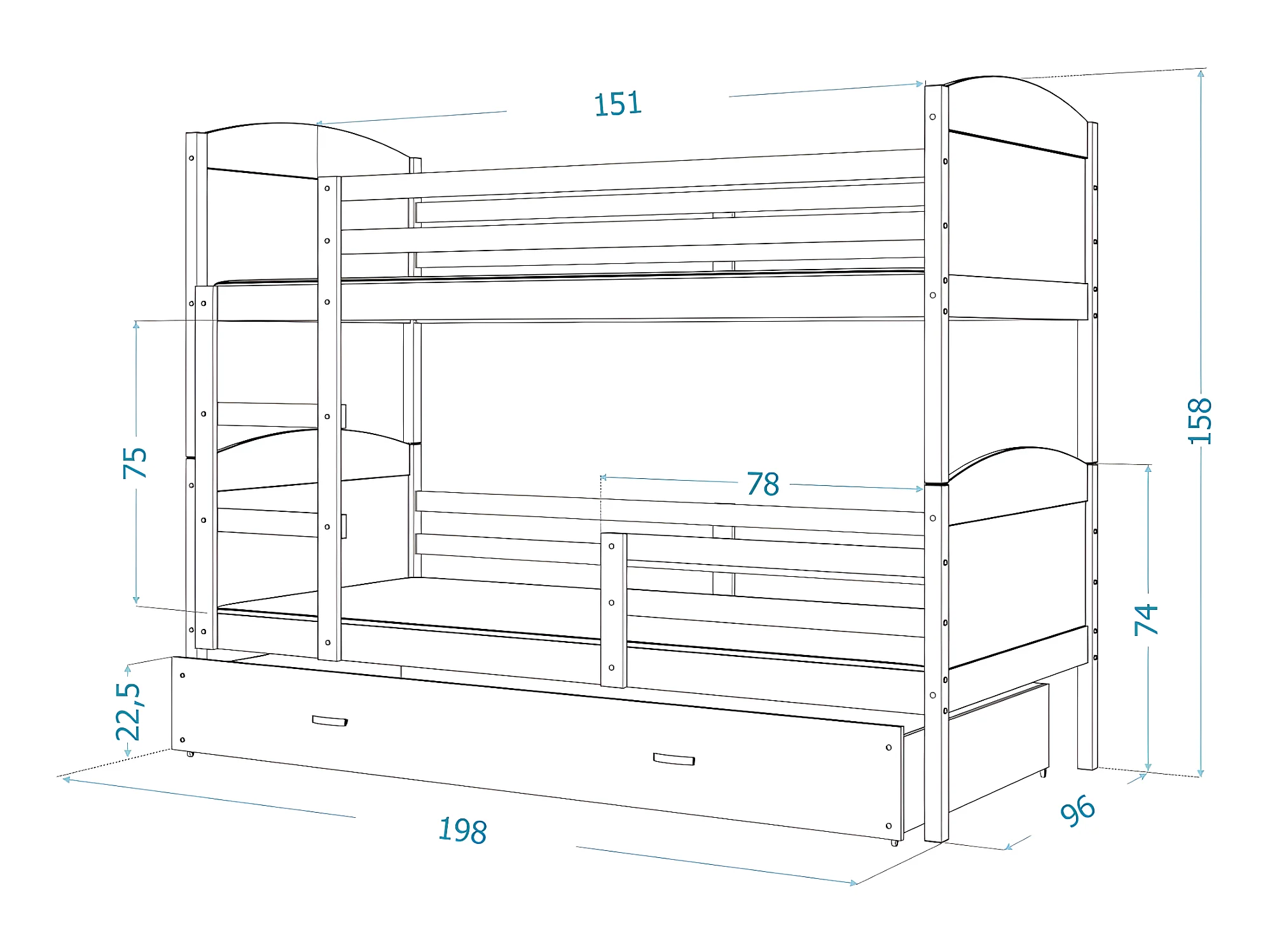 Lit Superposé Mateo 90x190 Pin - bleu Livré avec sommiers, tiroir et matelas en mousse de 7cm