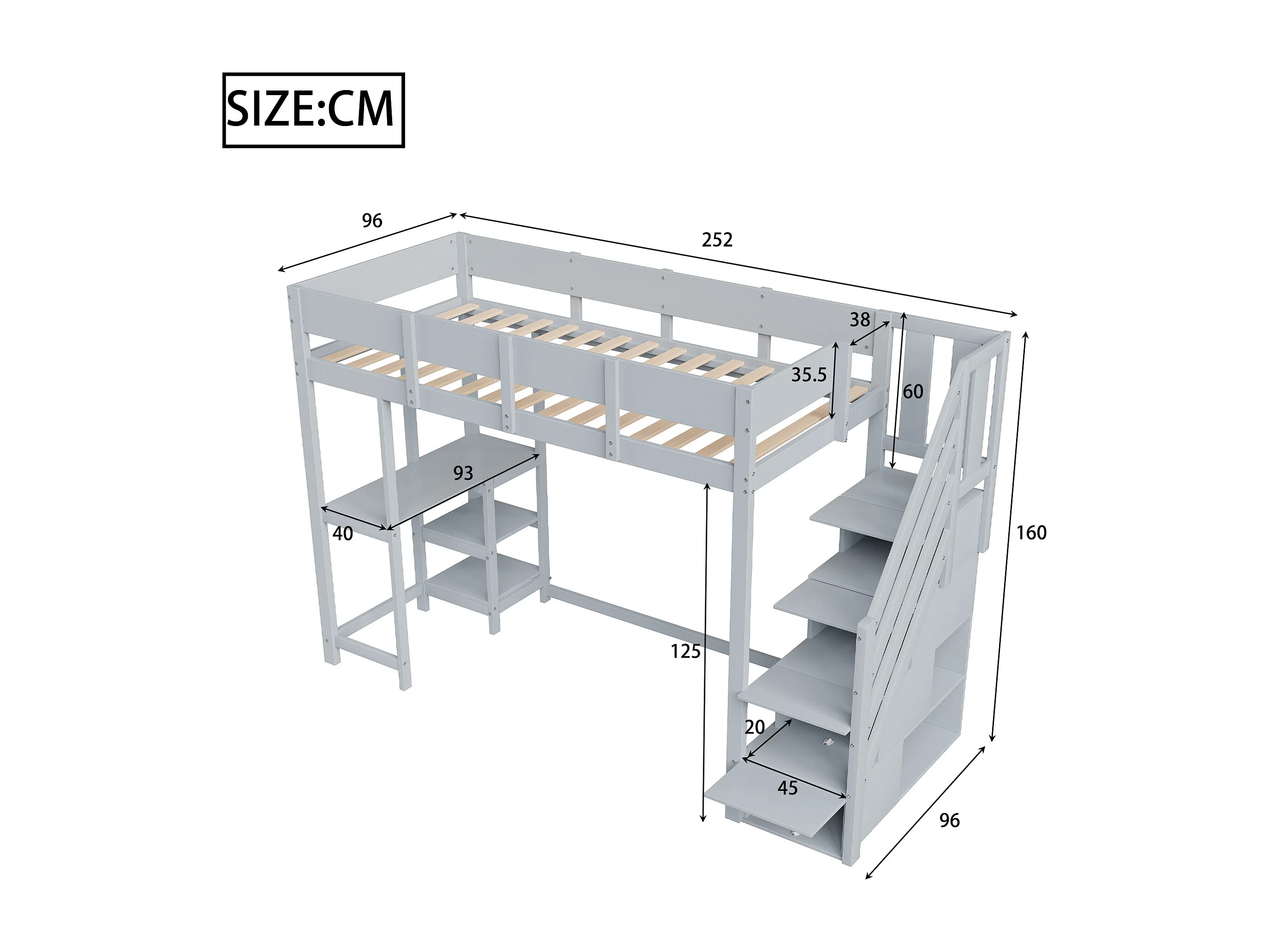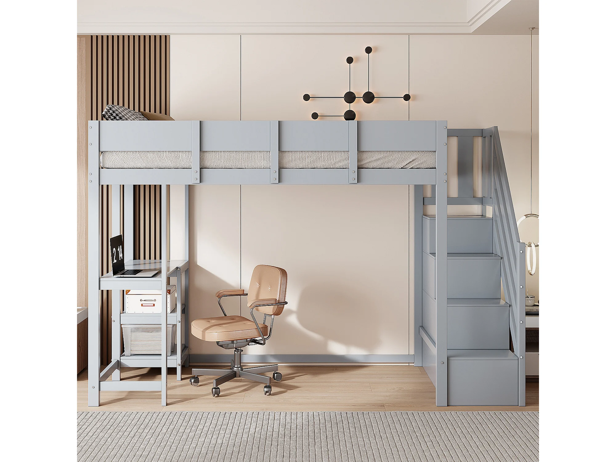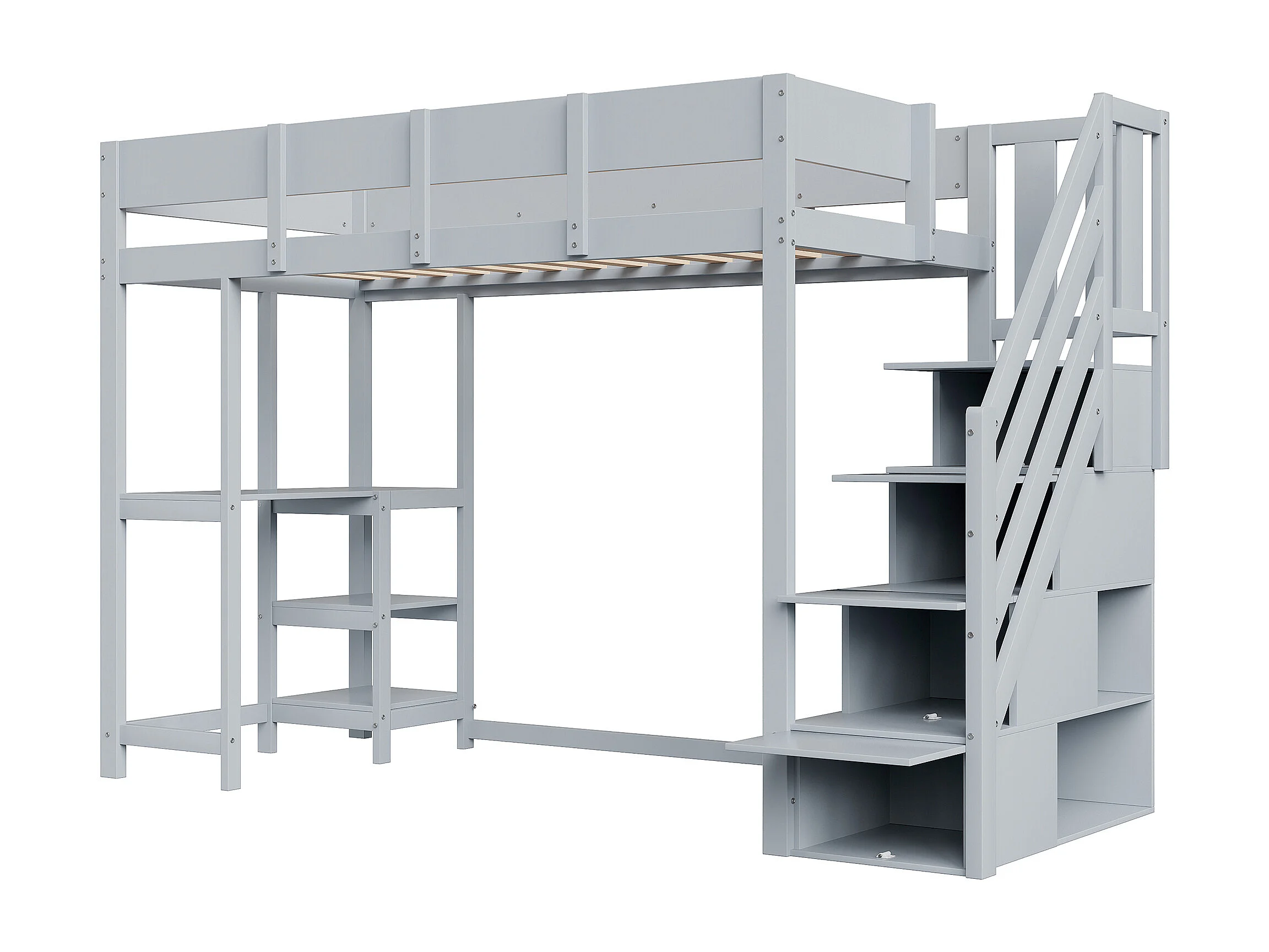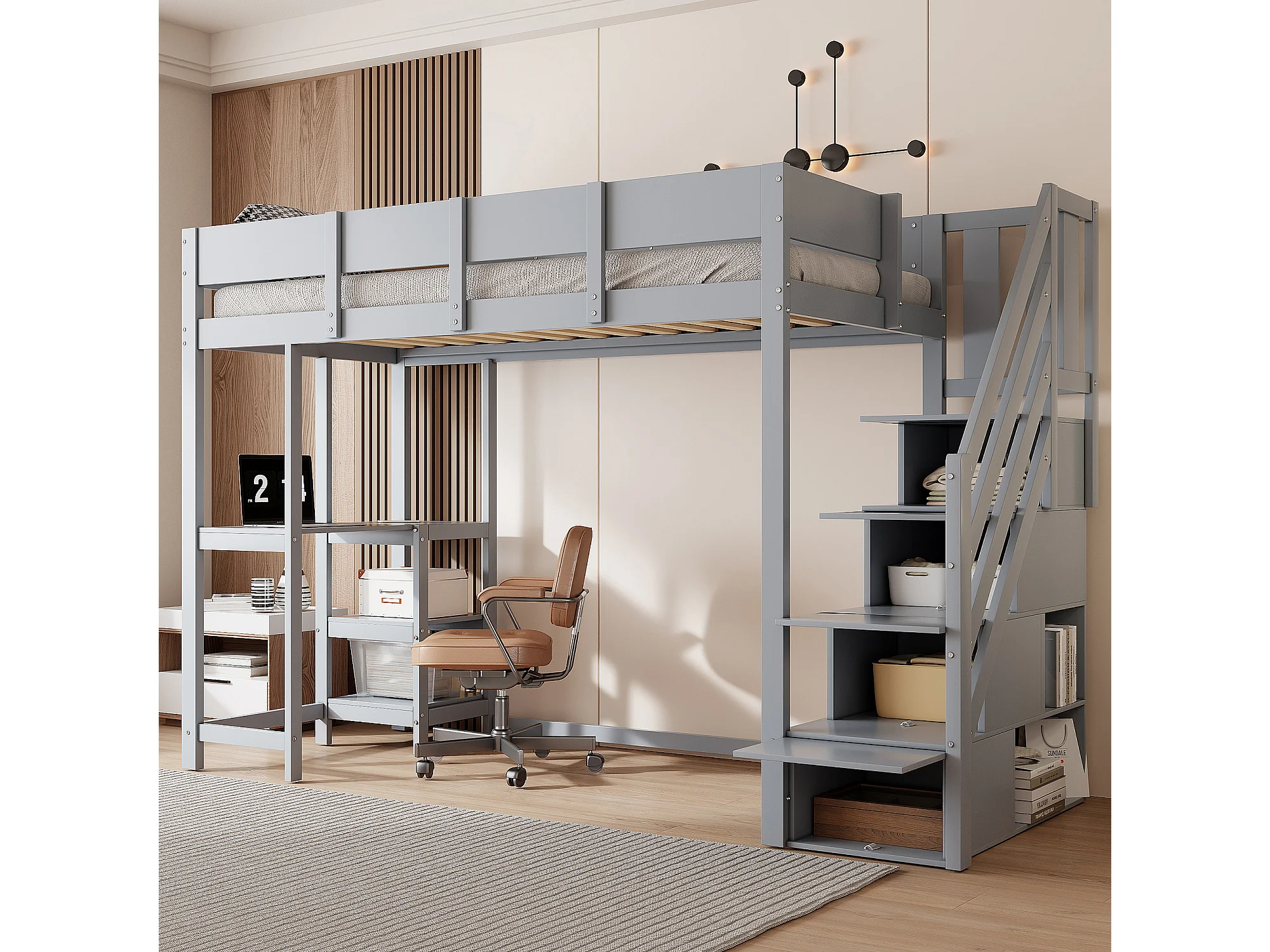 Lit superposé multifonction 90x200 cm gris, structure en pin massif avec étagères et tiroirs intégrés