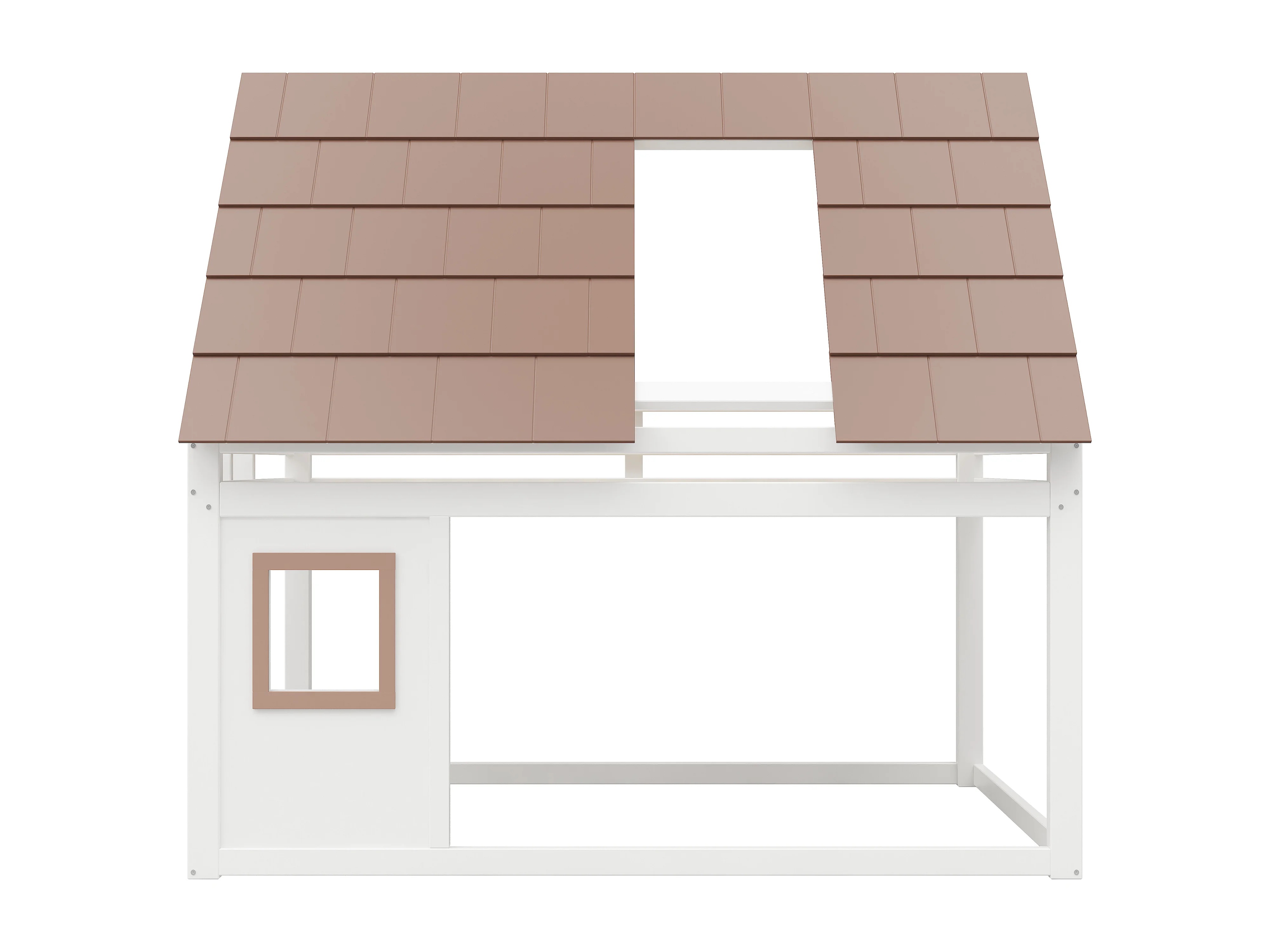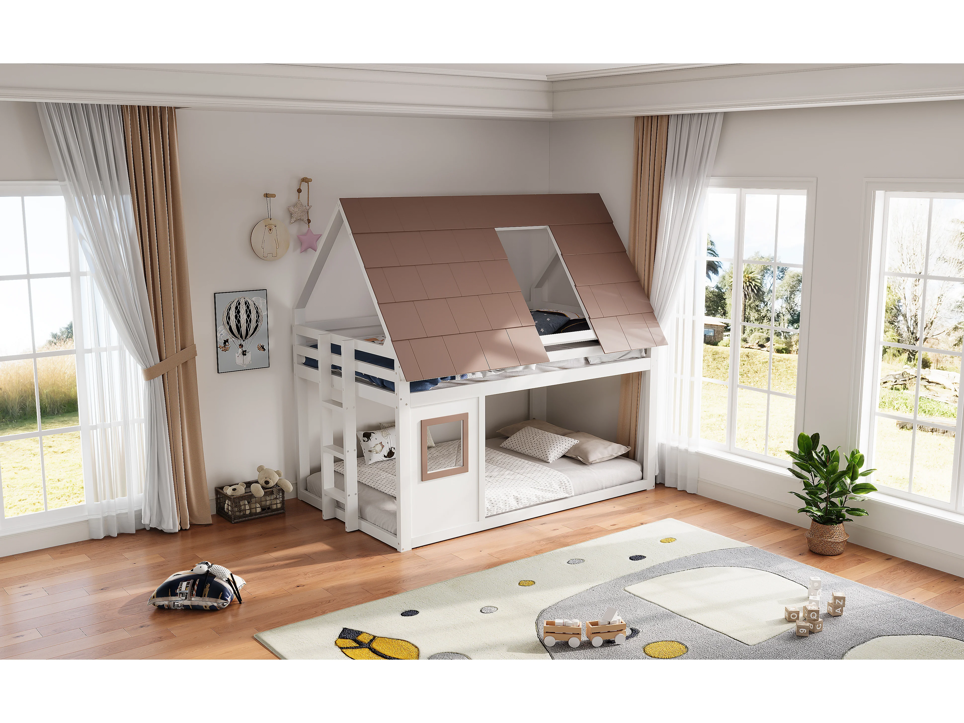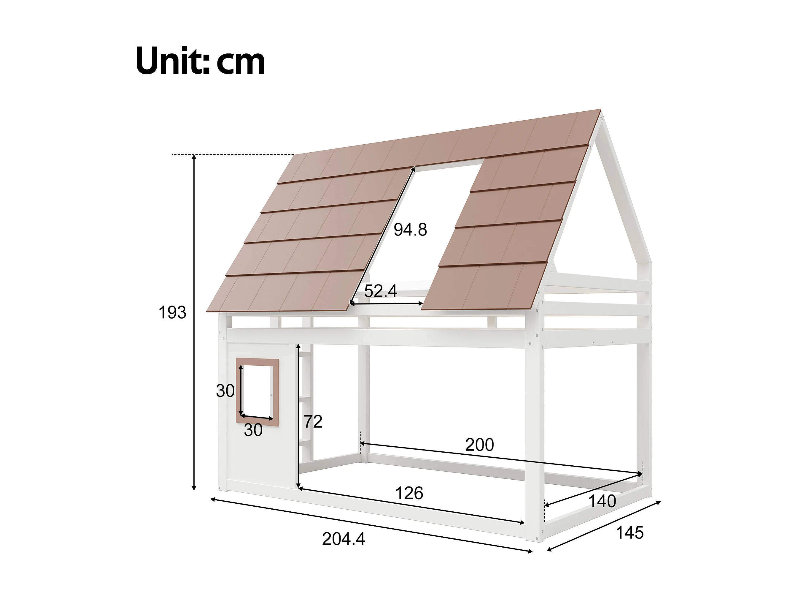 Lit superposé pour enfant - 140 x 200 cm - avec toit + échelle - MDF + bois - blanc et marron