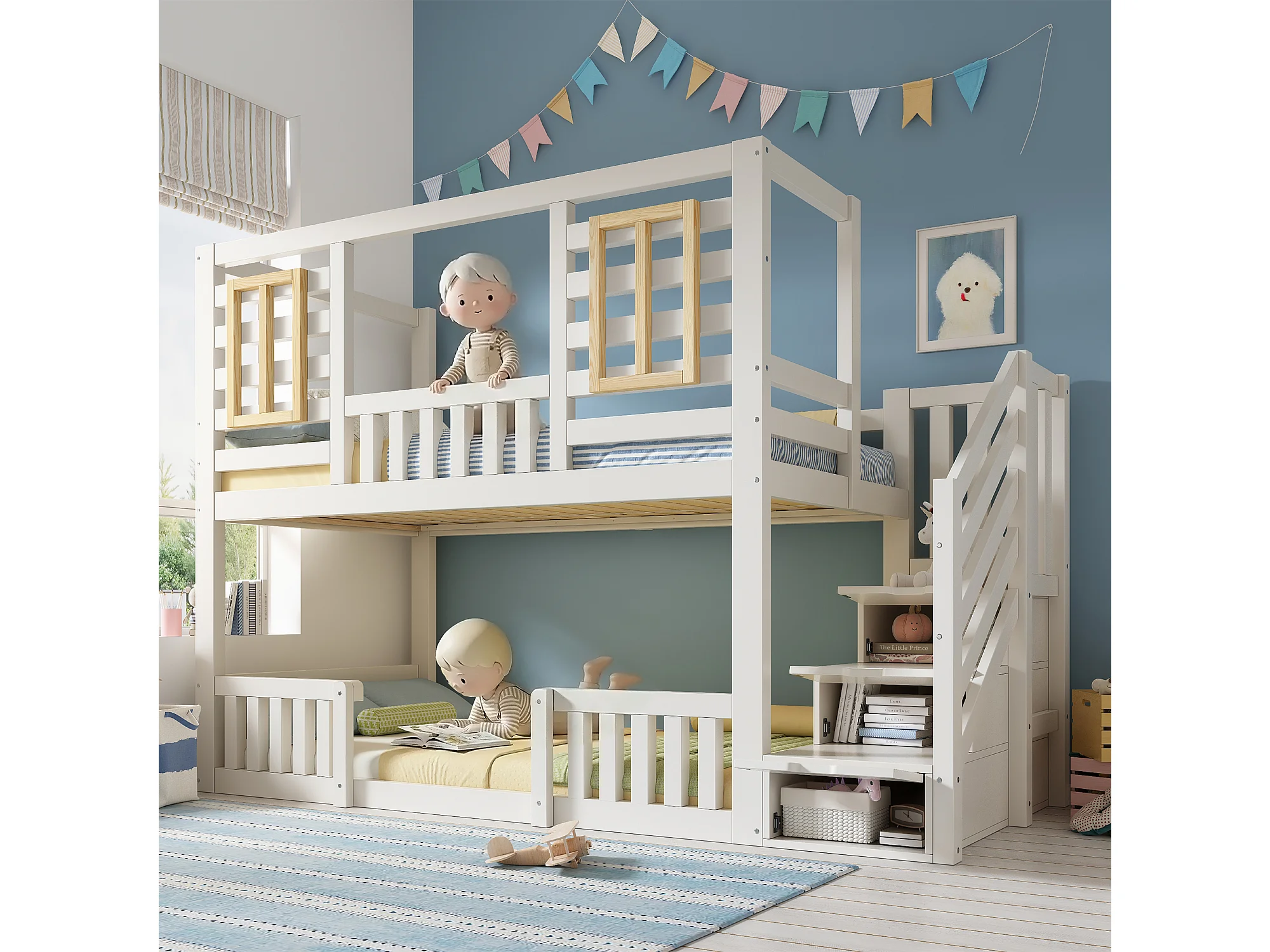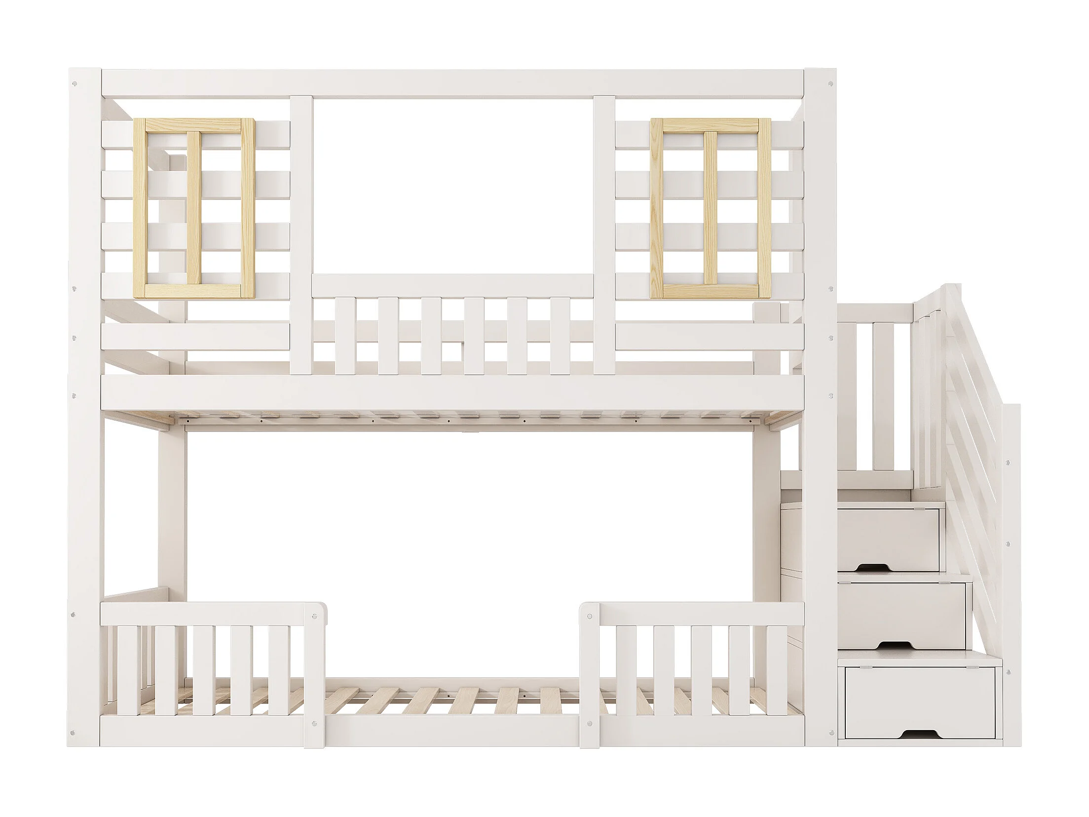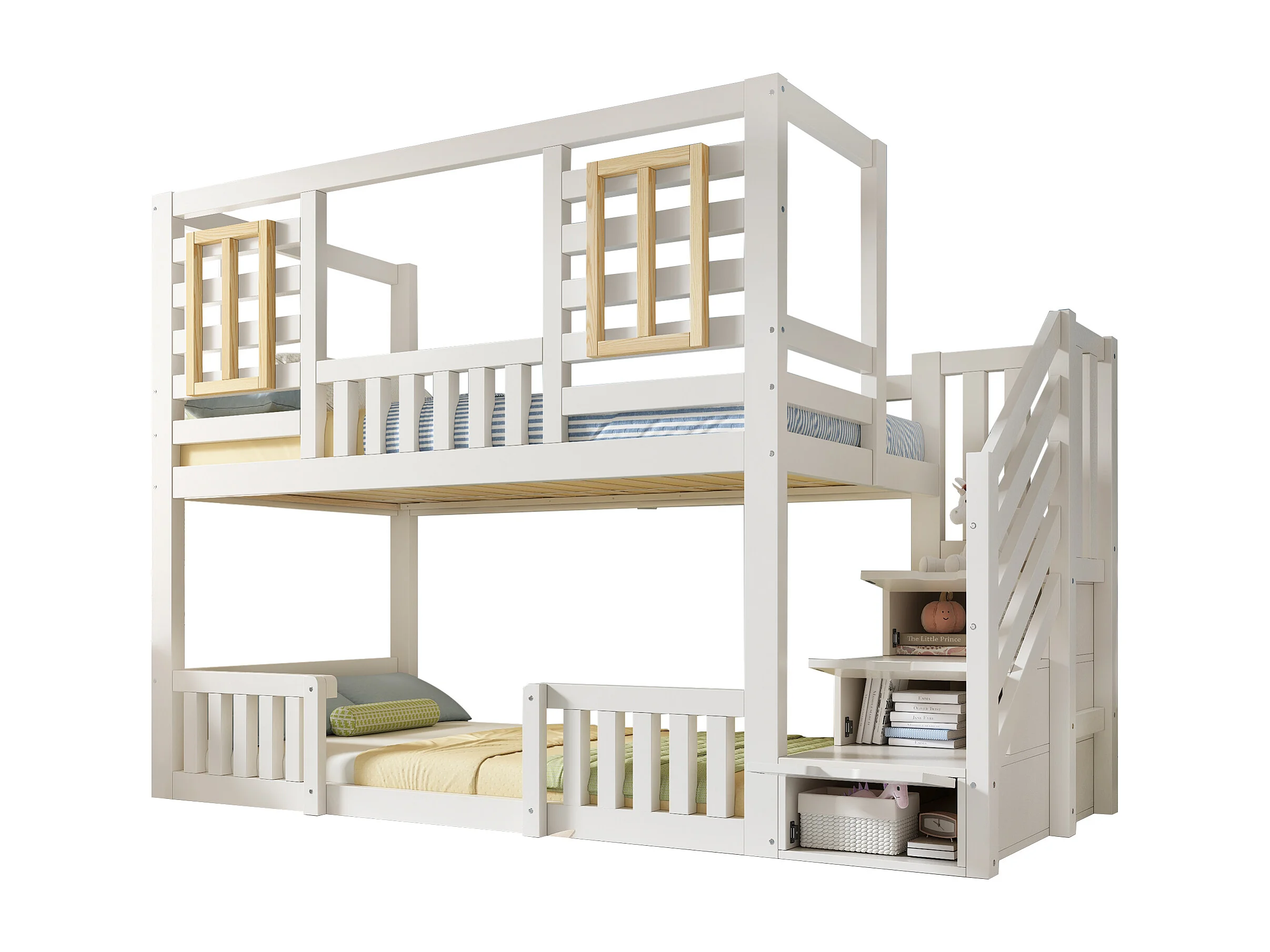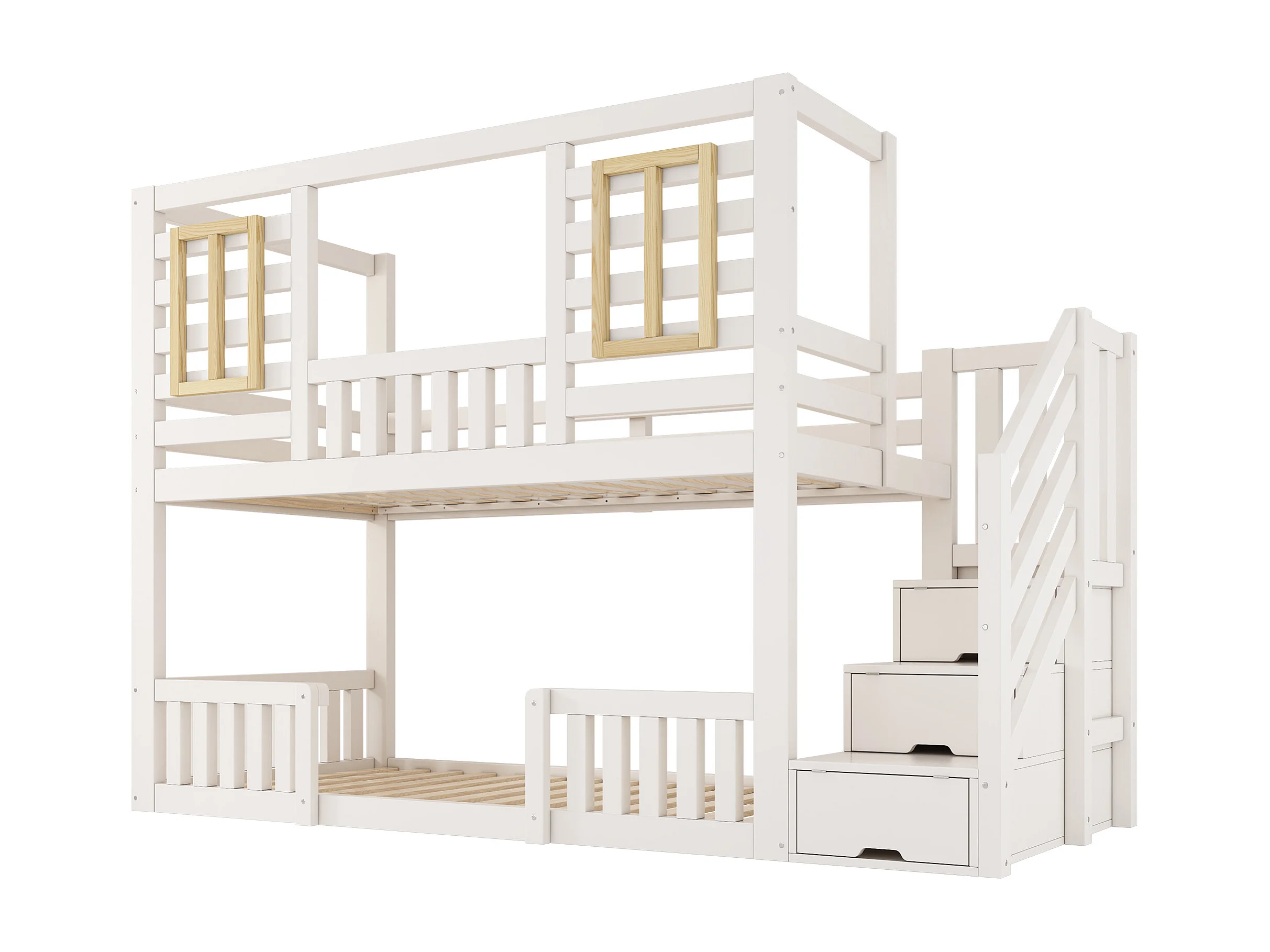 Lit superposé pour enfant - 2 x 90 x 200 cm - style cabane avec fenêtres - avec escalier de rangement - bois - blanc