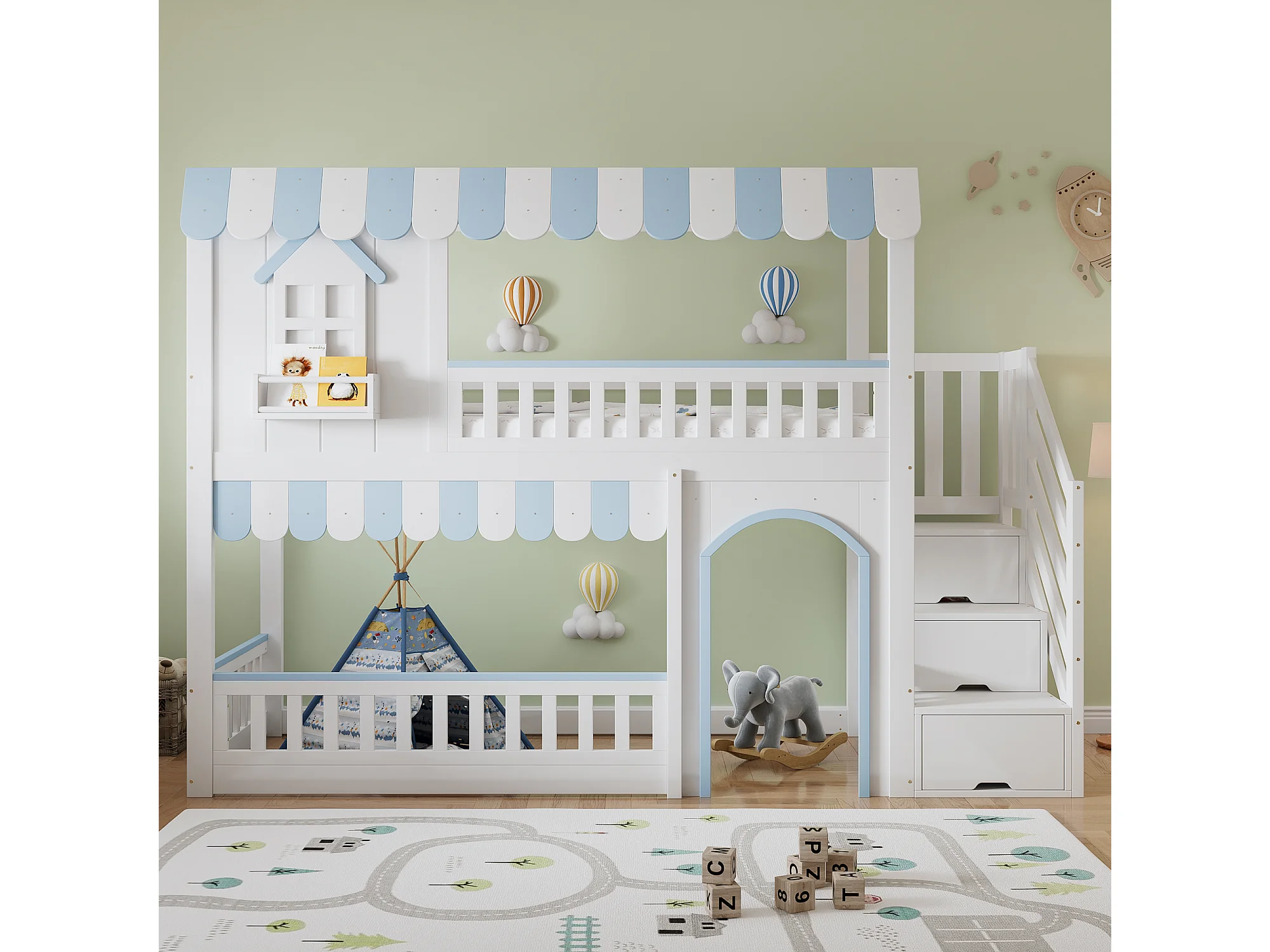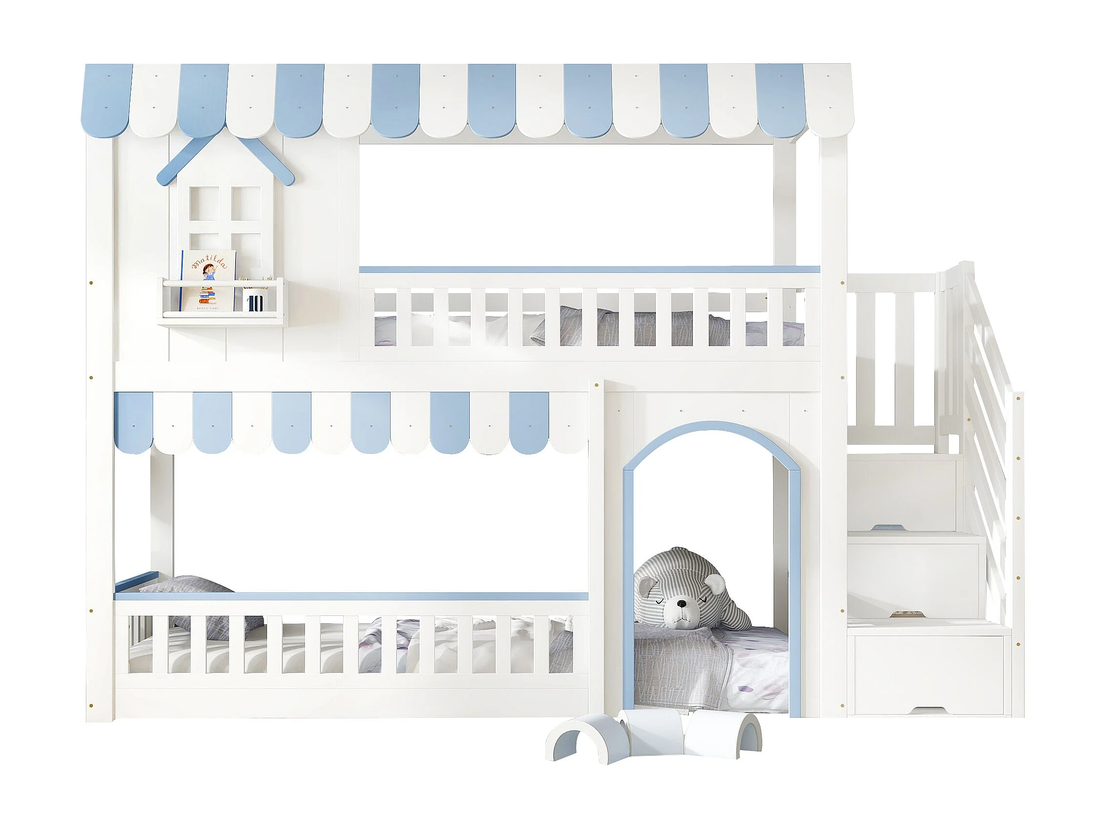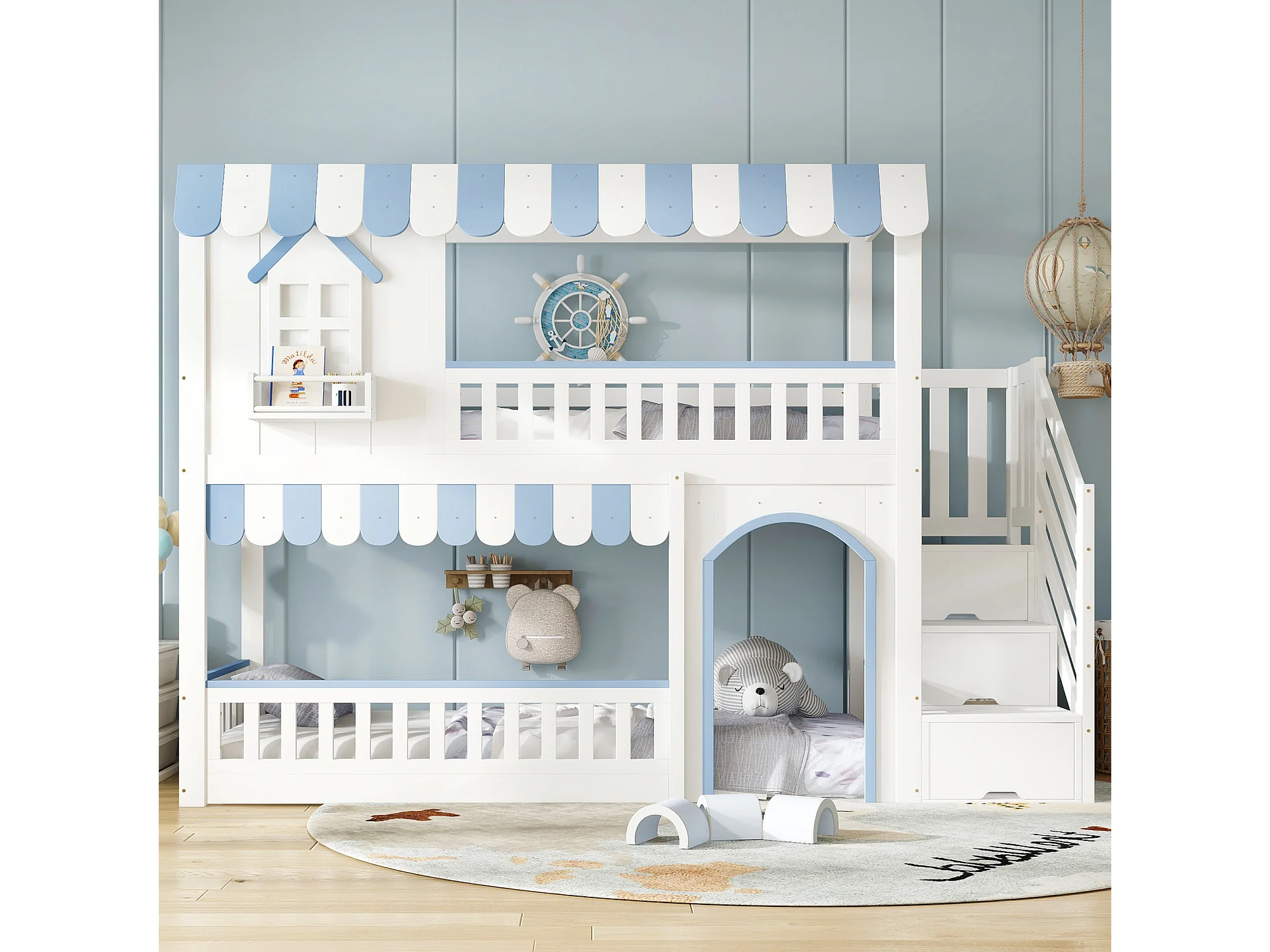 Lit superposé pour enfant - 90 x 200 cm - avec escalier de rangement + fenêtres - pin + MDF - blanc + bleu