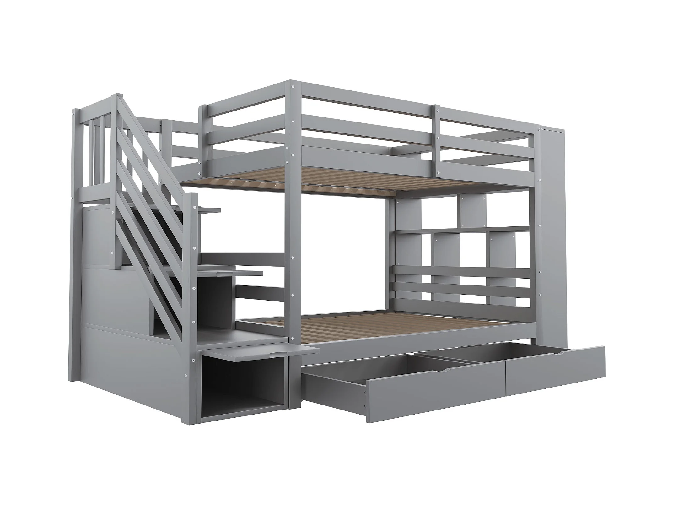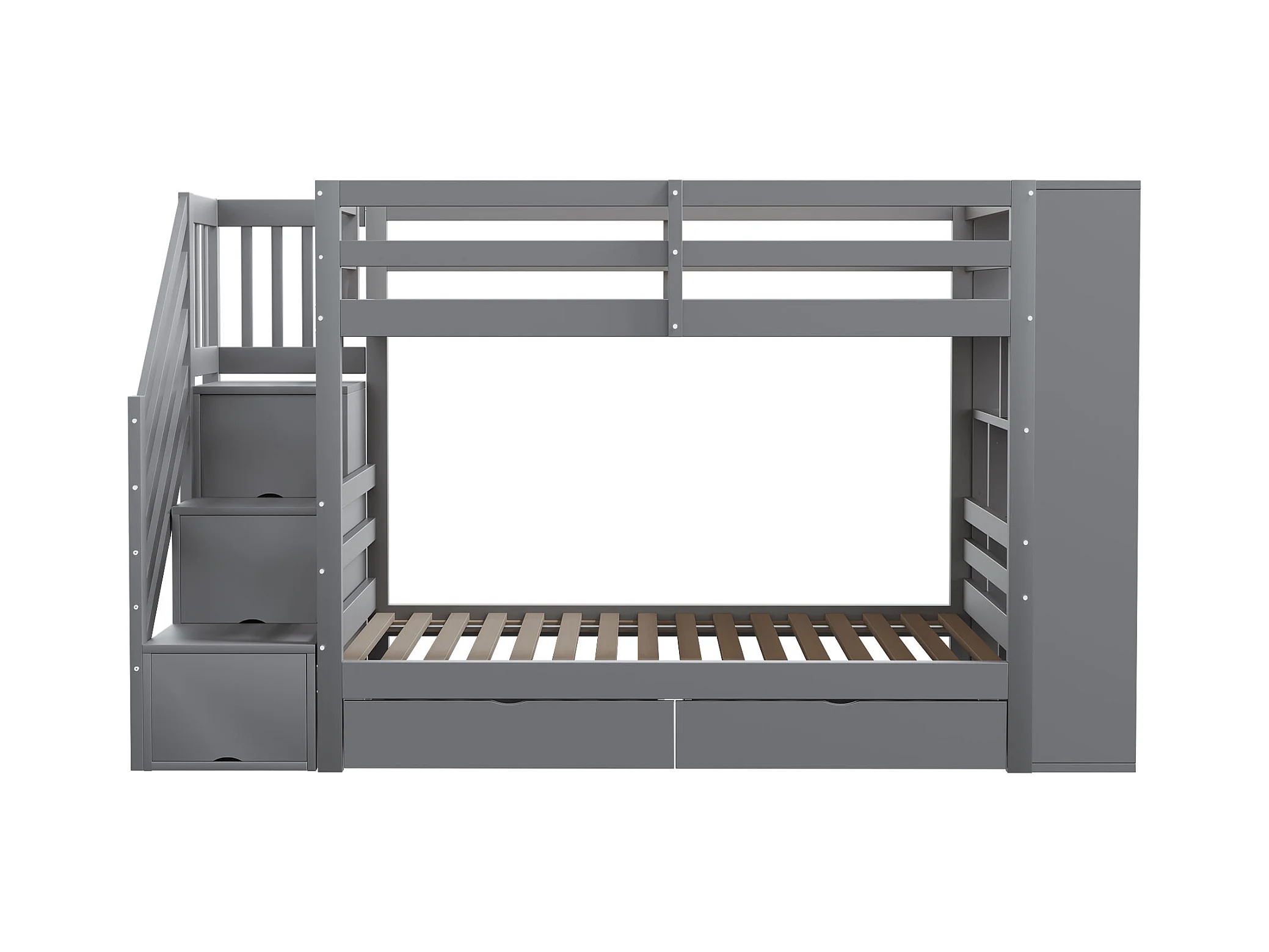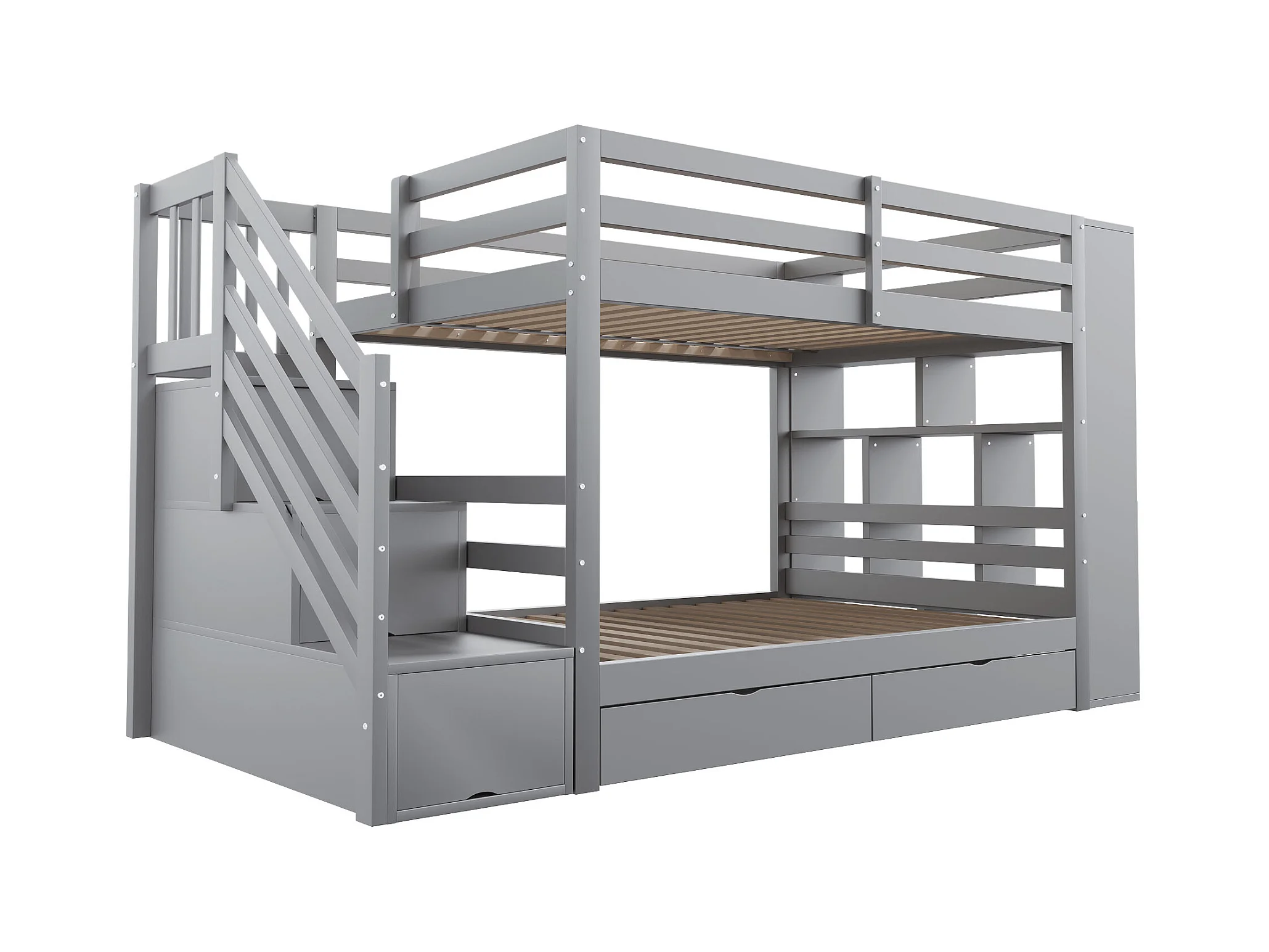 Lit superposé 90 × 200 cm, avec échelle de sécurité, tiroirs de rangement et placard, gris