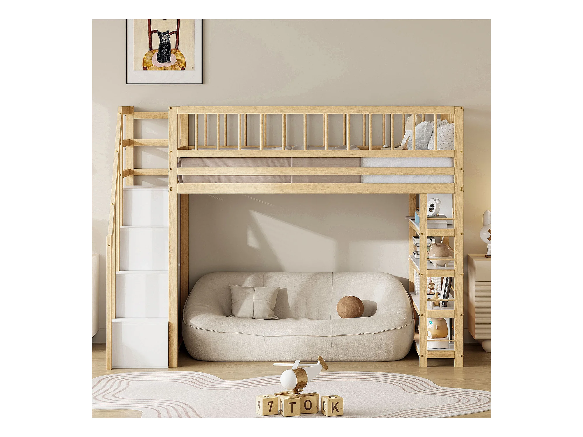 Lit superposé pour enfants 90 x 200, barrières hautes, avec armoire, échelle de sécurité, couleur bois d'origine