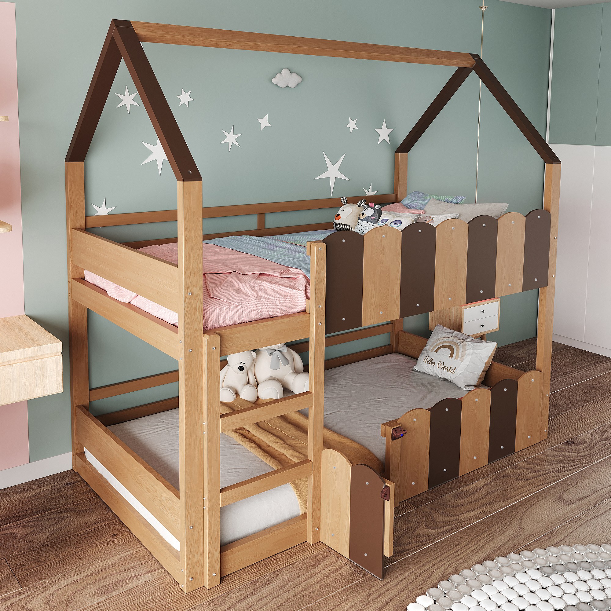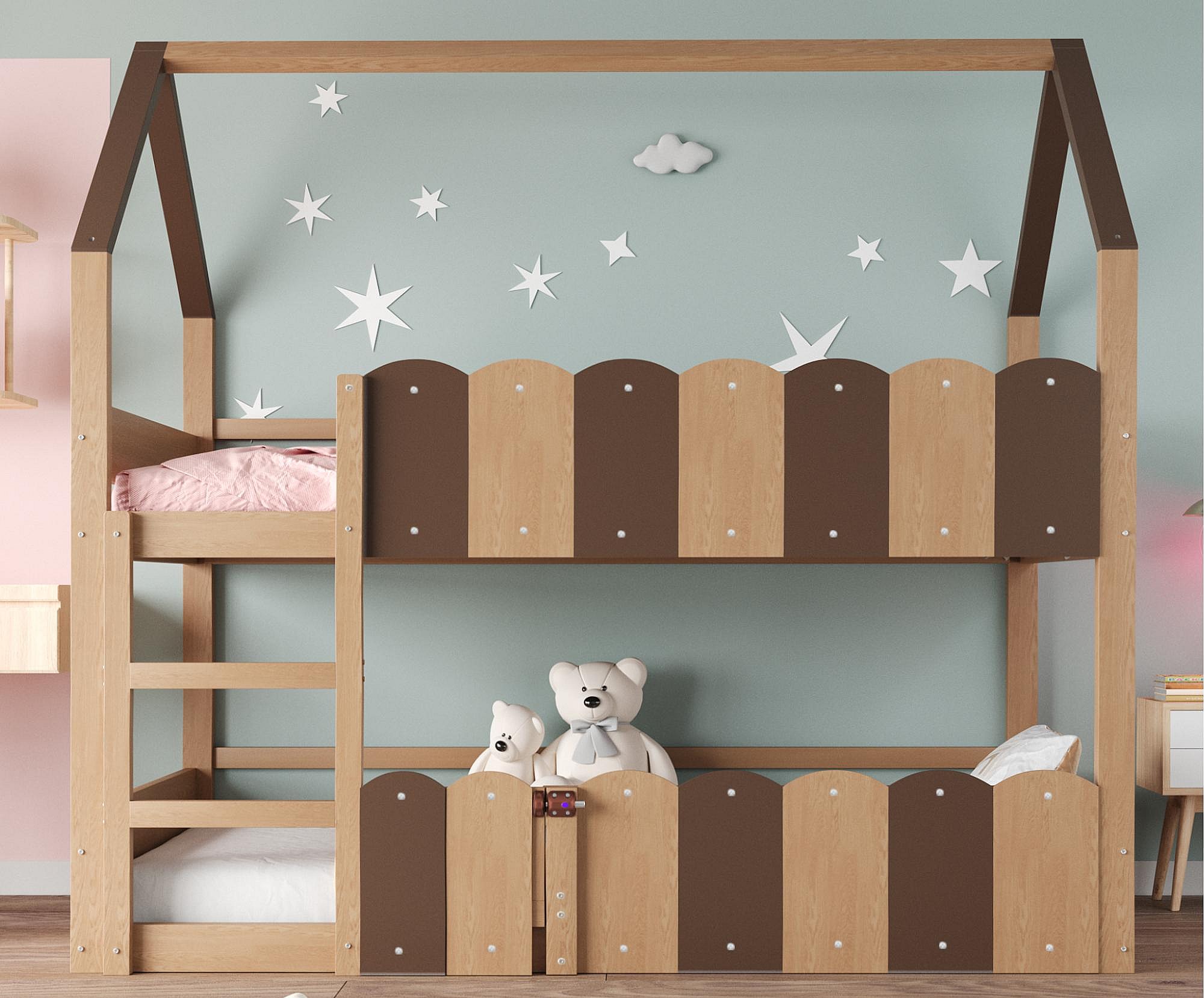 Lit superposé pour enfants 90x200 cm - design en forme de maison - avec barrières de sécurité - Naturel (matelas non inclus)