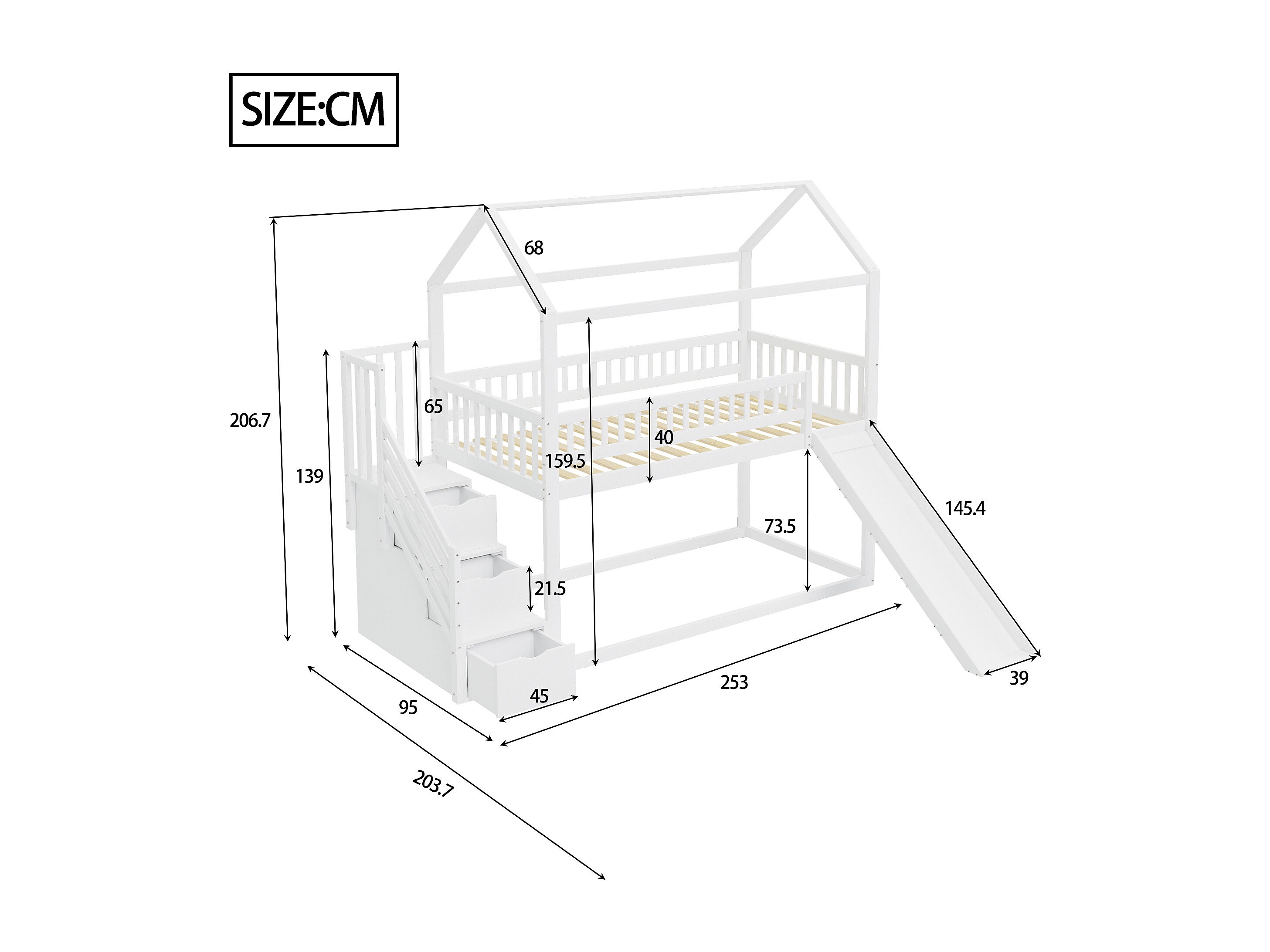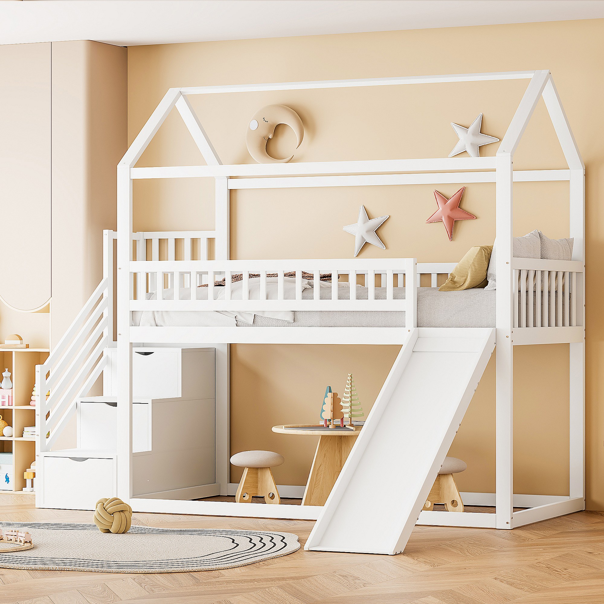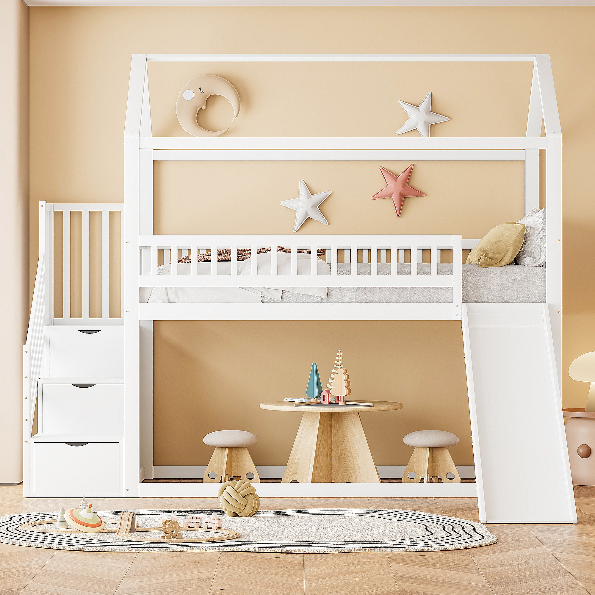 Lit superposé pour enfants 90x200 cm, lit mezzanine avec toboggan et échelle de rangement, haute barrière, cadre en bois massif, blanc
