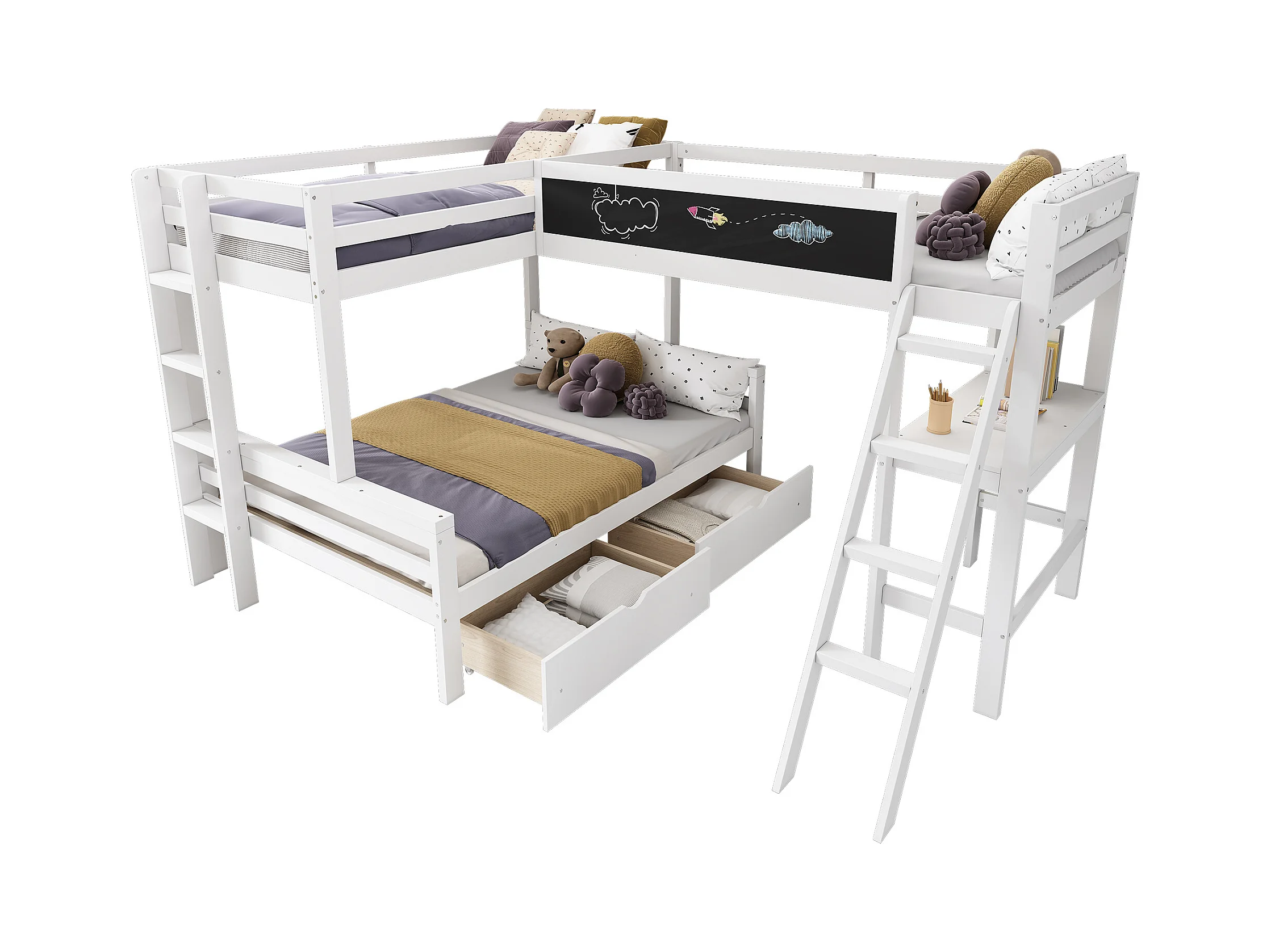 Lit superposé pour enfants avec tiroirs et bureau, lit triple en bois de pin, avec étagère, 140x200 cm1 + 90x200 cm2, blanc, sans matelas