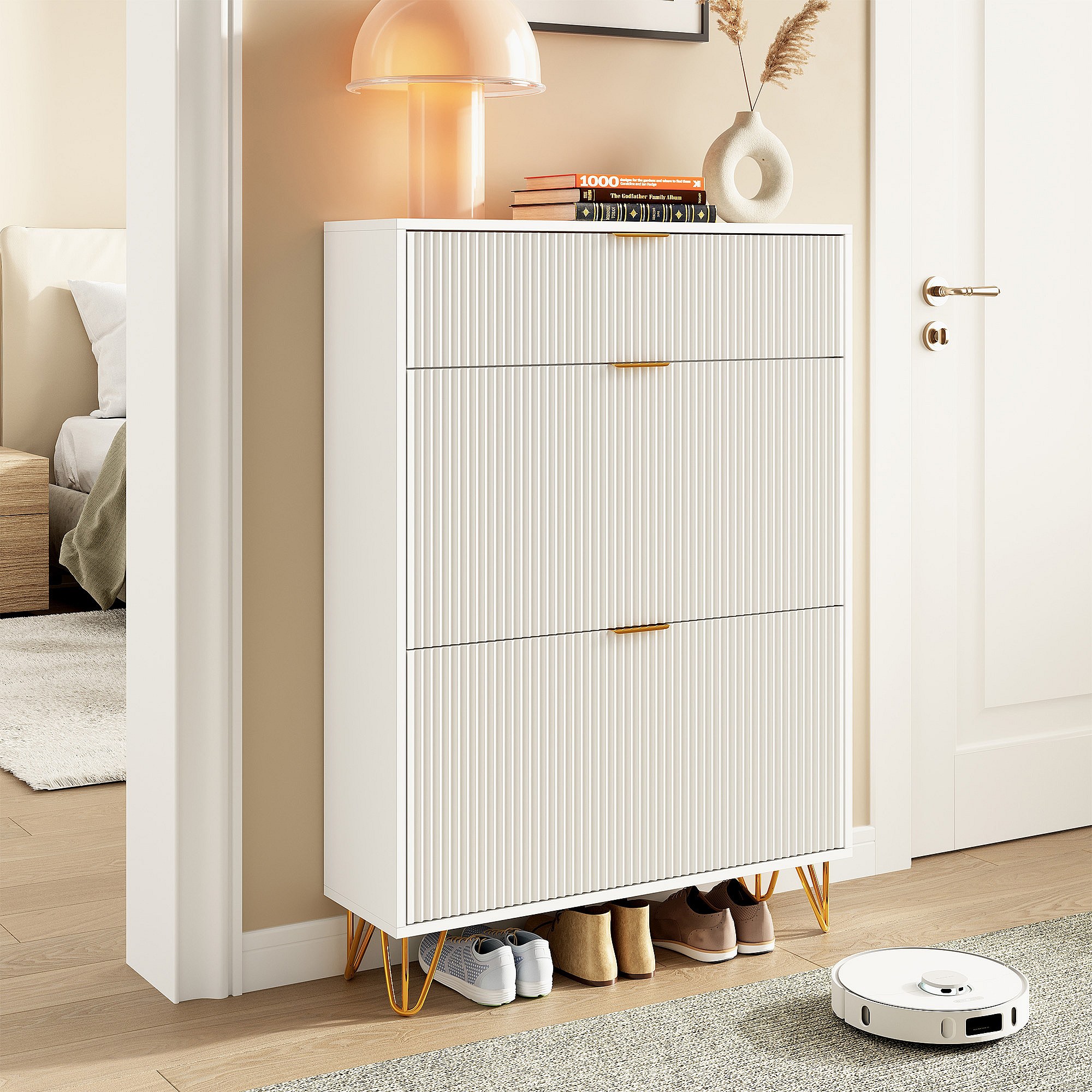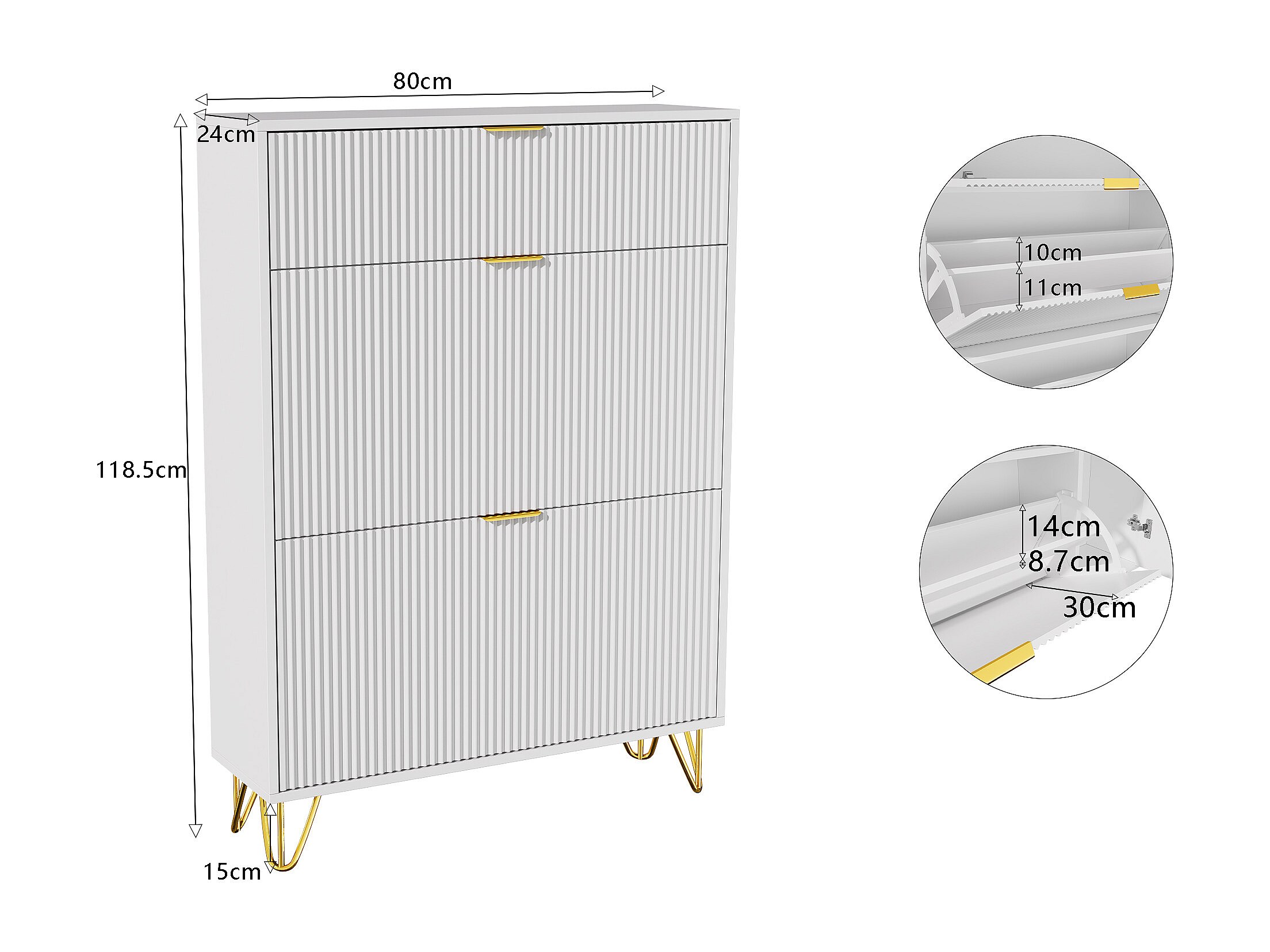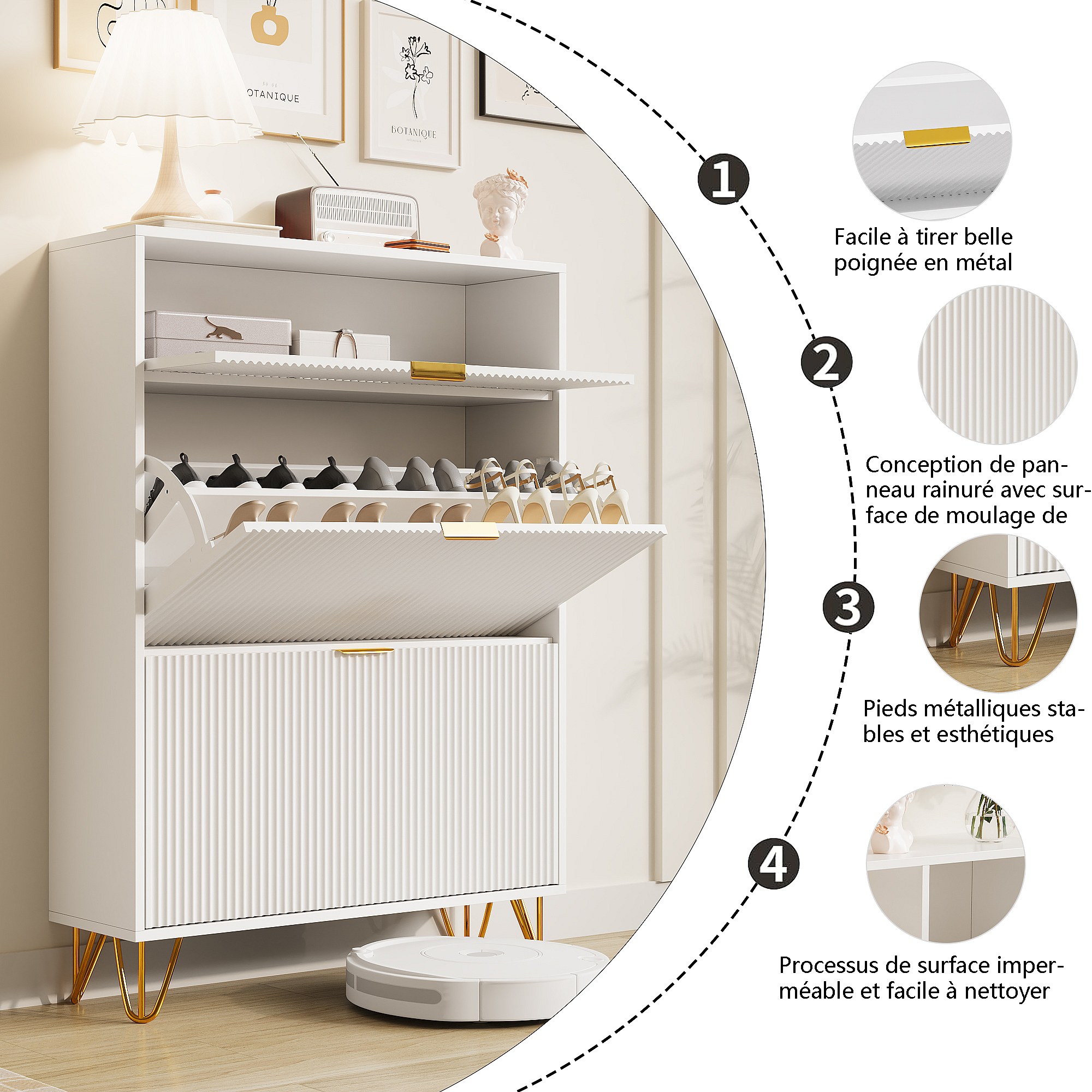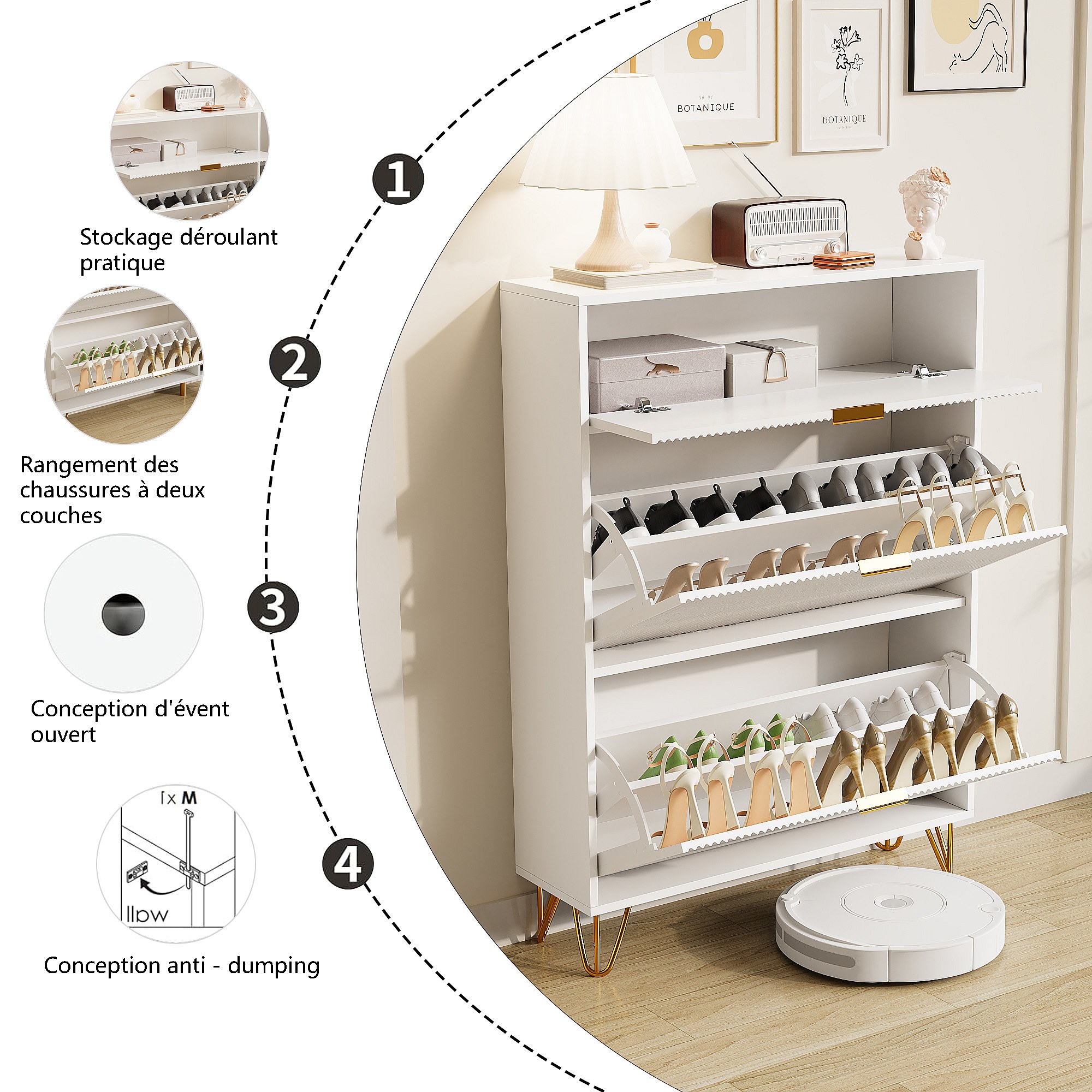Meuble à chaussures moderne en bois avec 3 portes battantes, pieds en métal doré et design antichute – Grand meuble à chaussures, blanc, 49 x 29 x 120 cm
