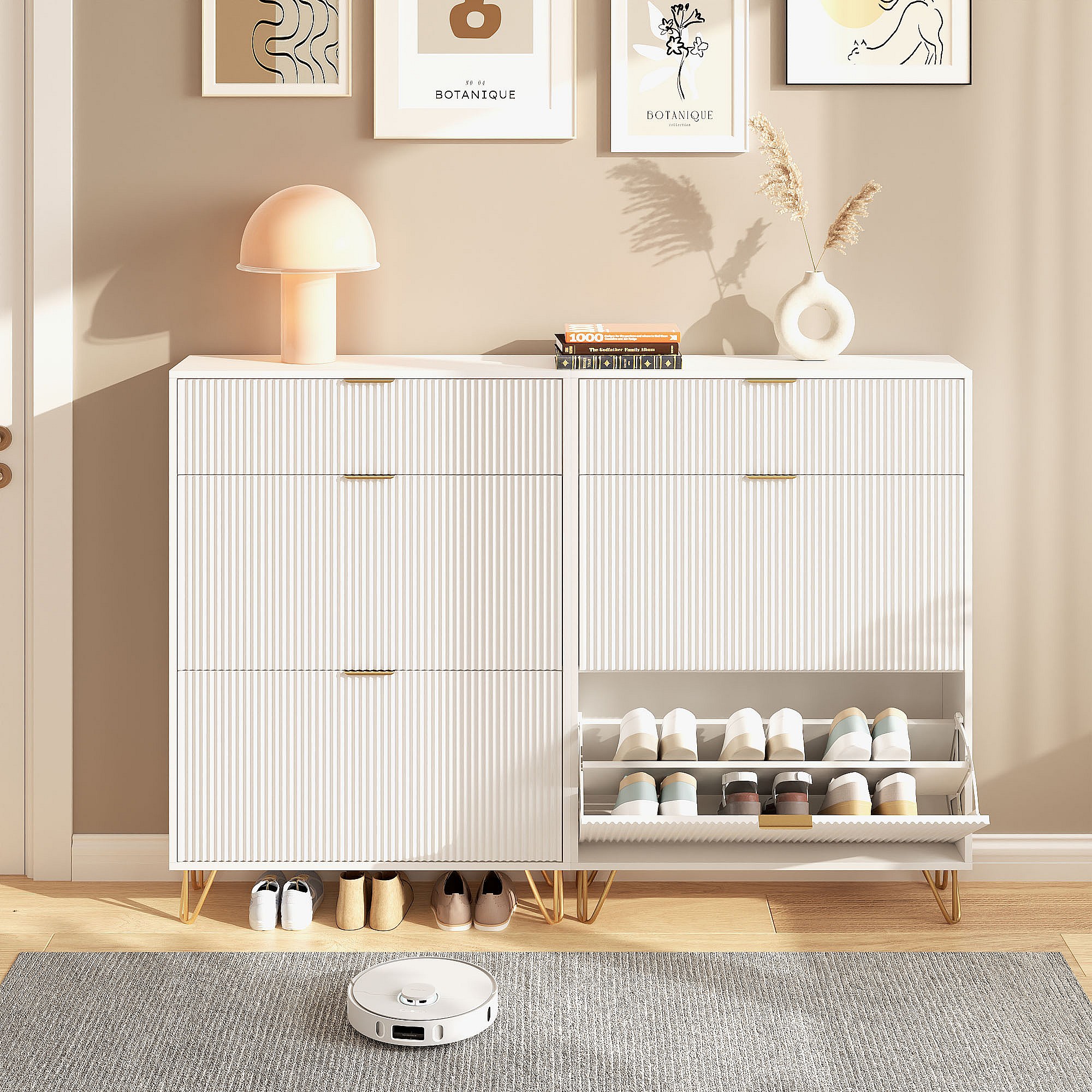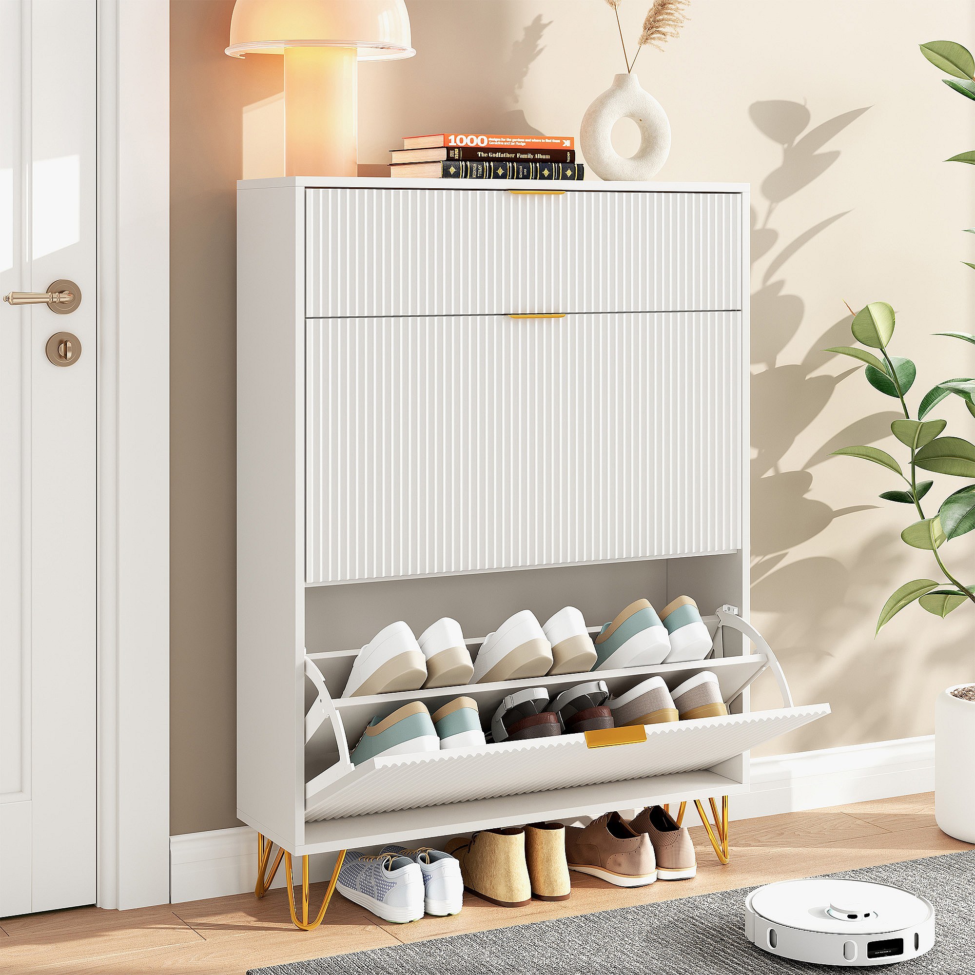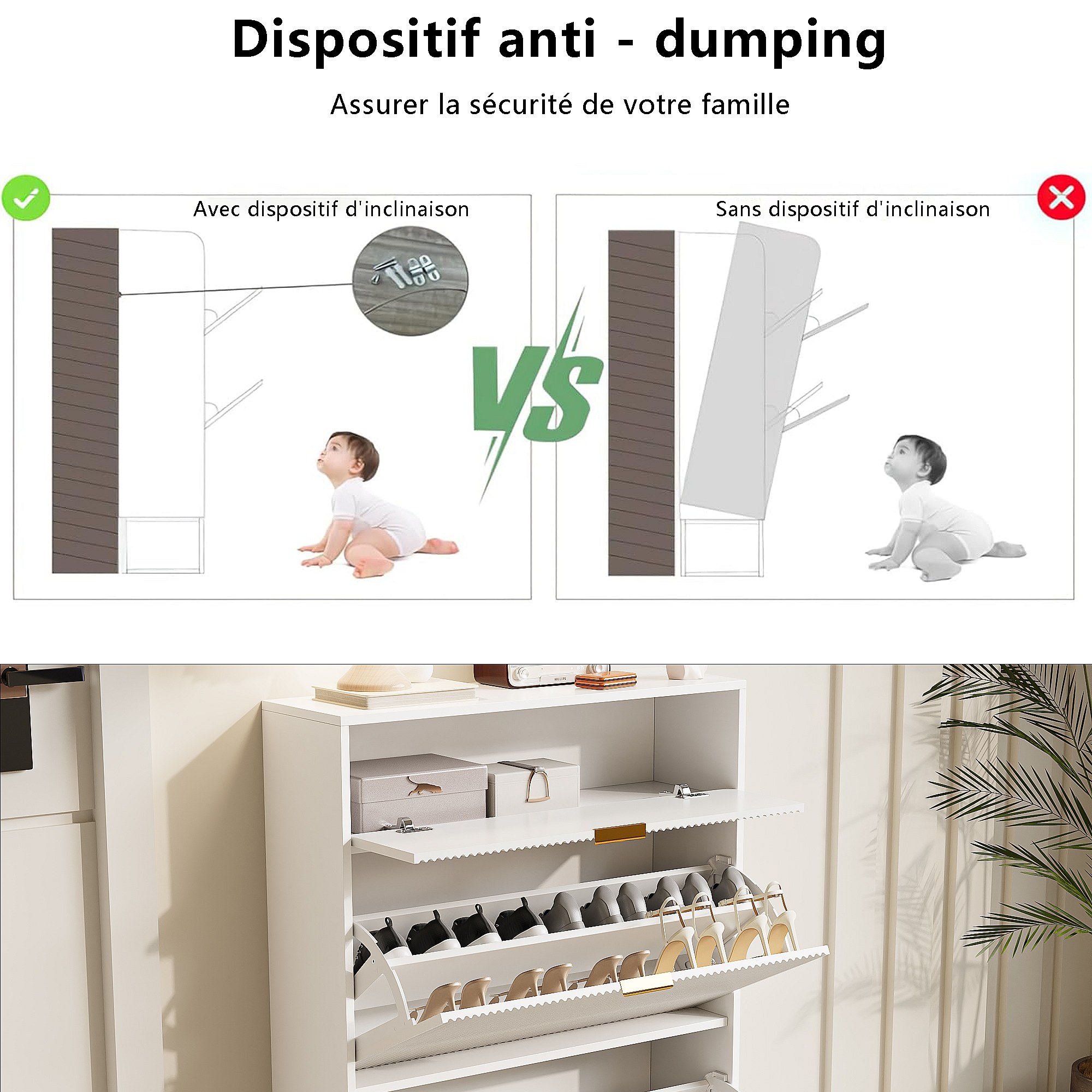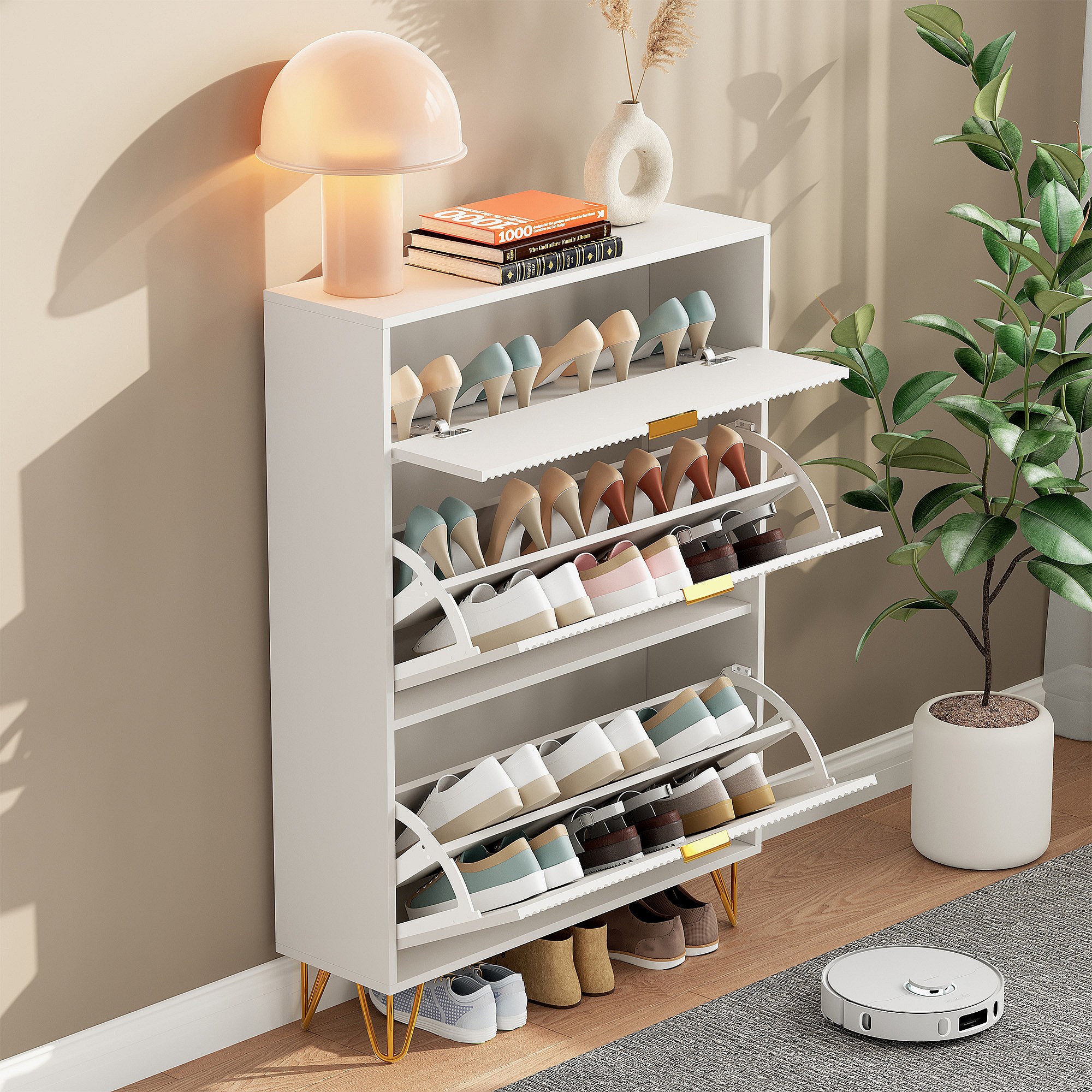 Meuble à chaussures moderne en bois avec 3 portes battantes, pieds en métal doré et design antichute – Grand meuble à chaussures, blanc, 49 x 29 x 120 cm