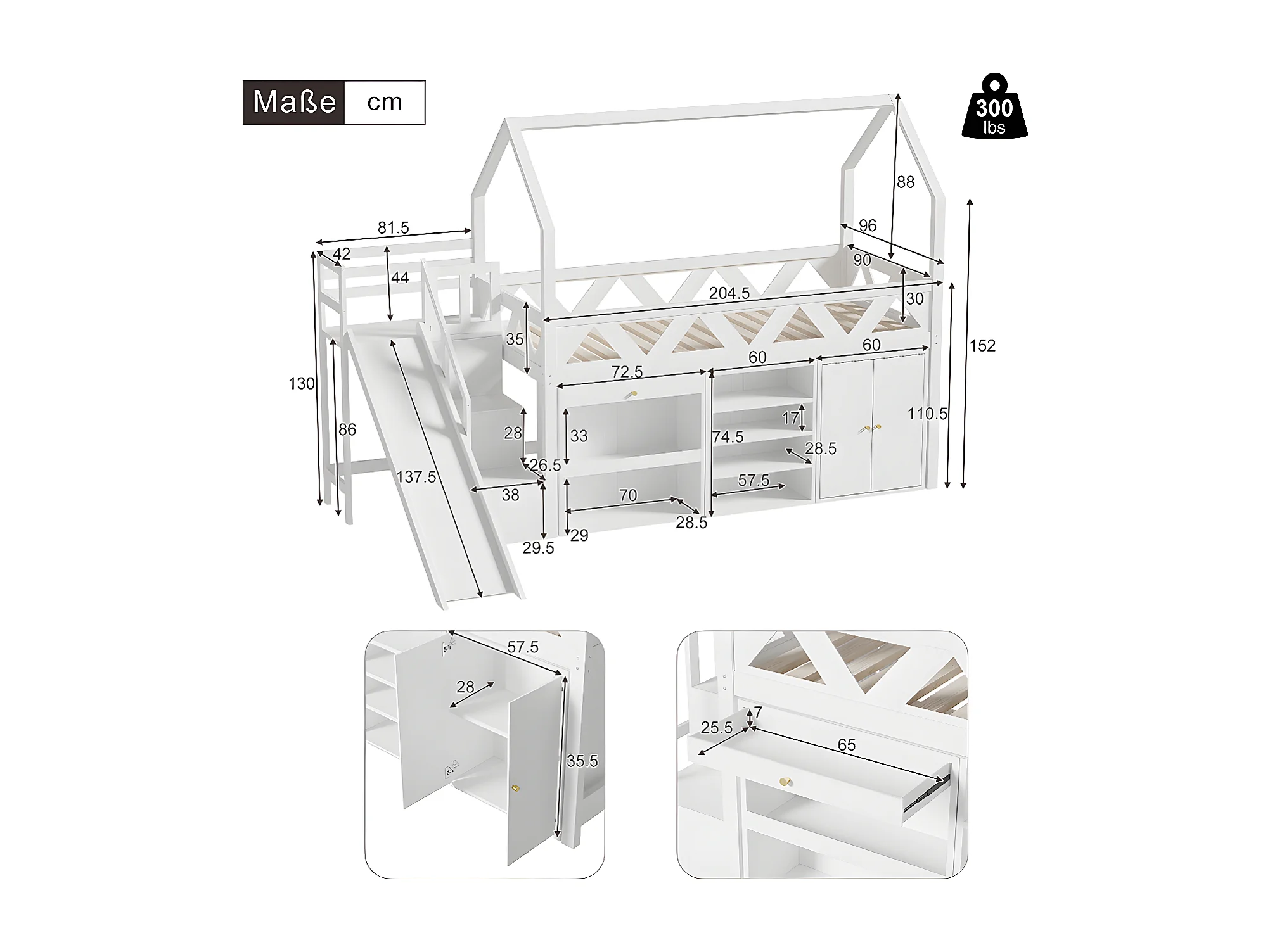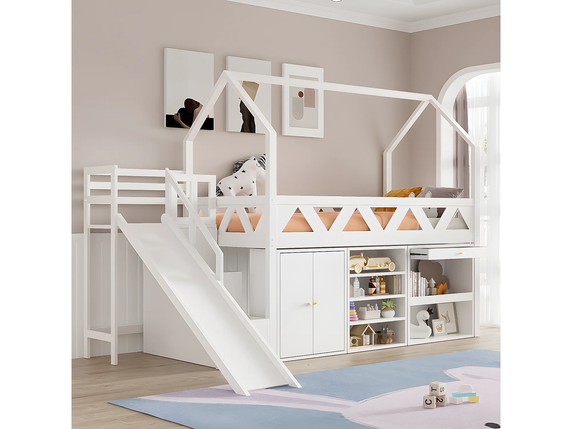 Lit superposé pour enfants lit simple 90x200 cm lit multifonctionnel avec toboggan et escalier avec tiroirs et casier bois massif blanc