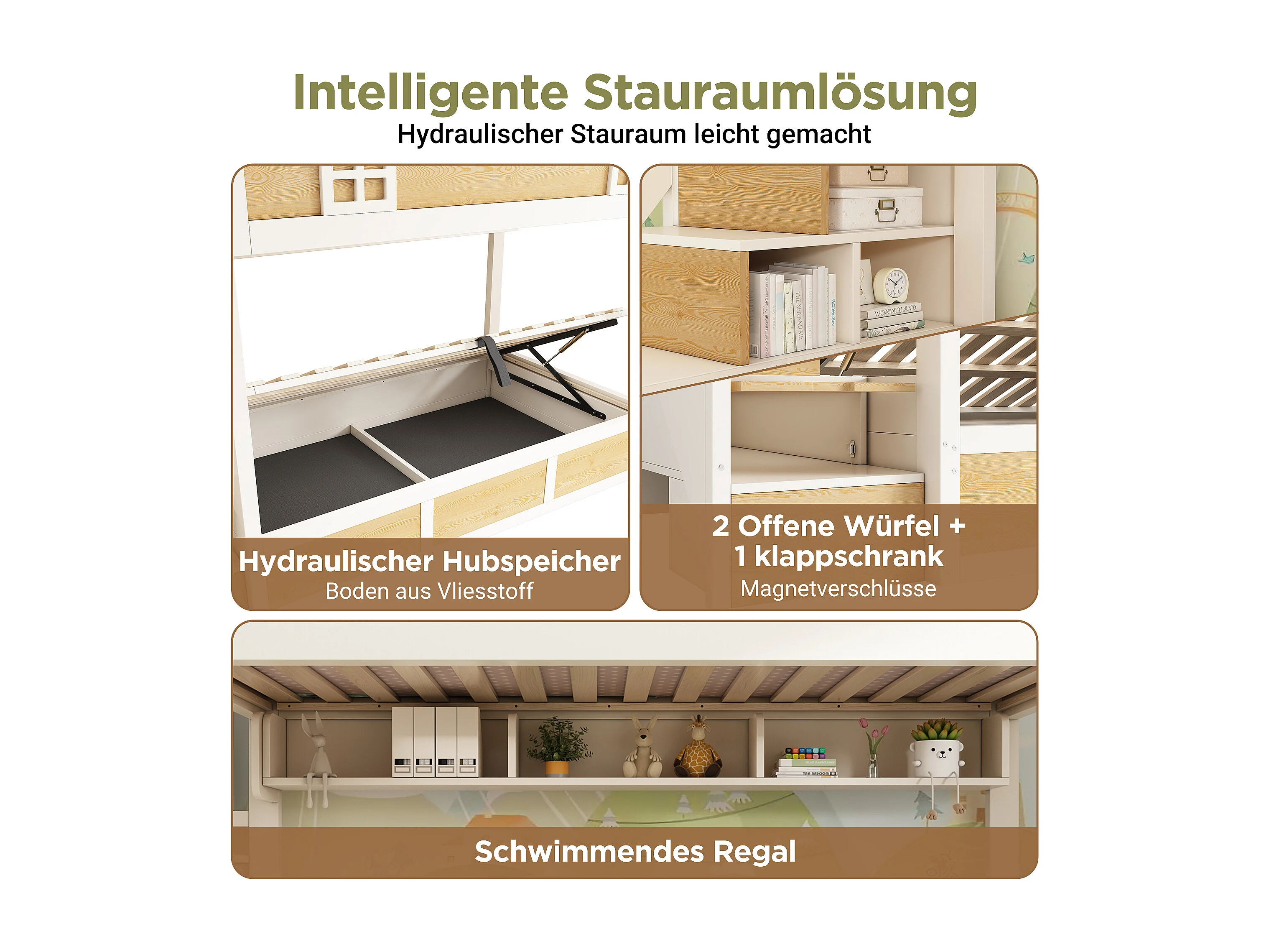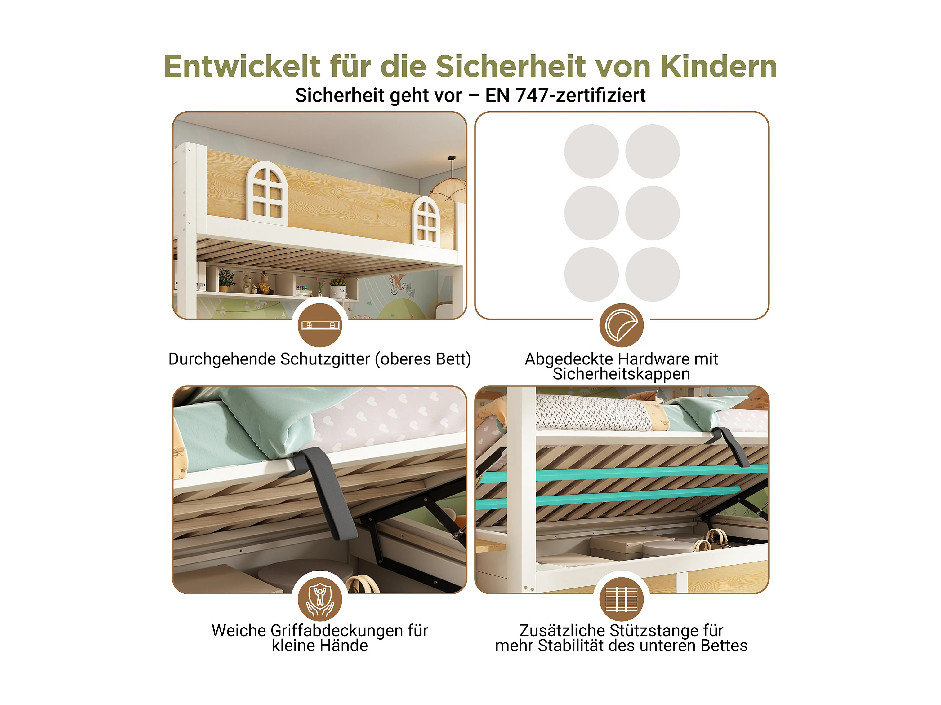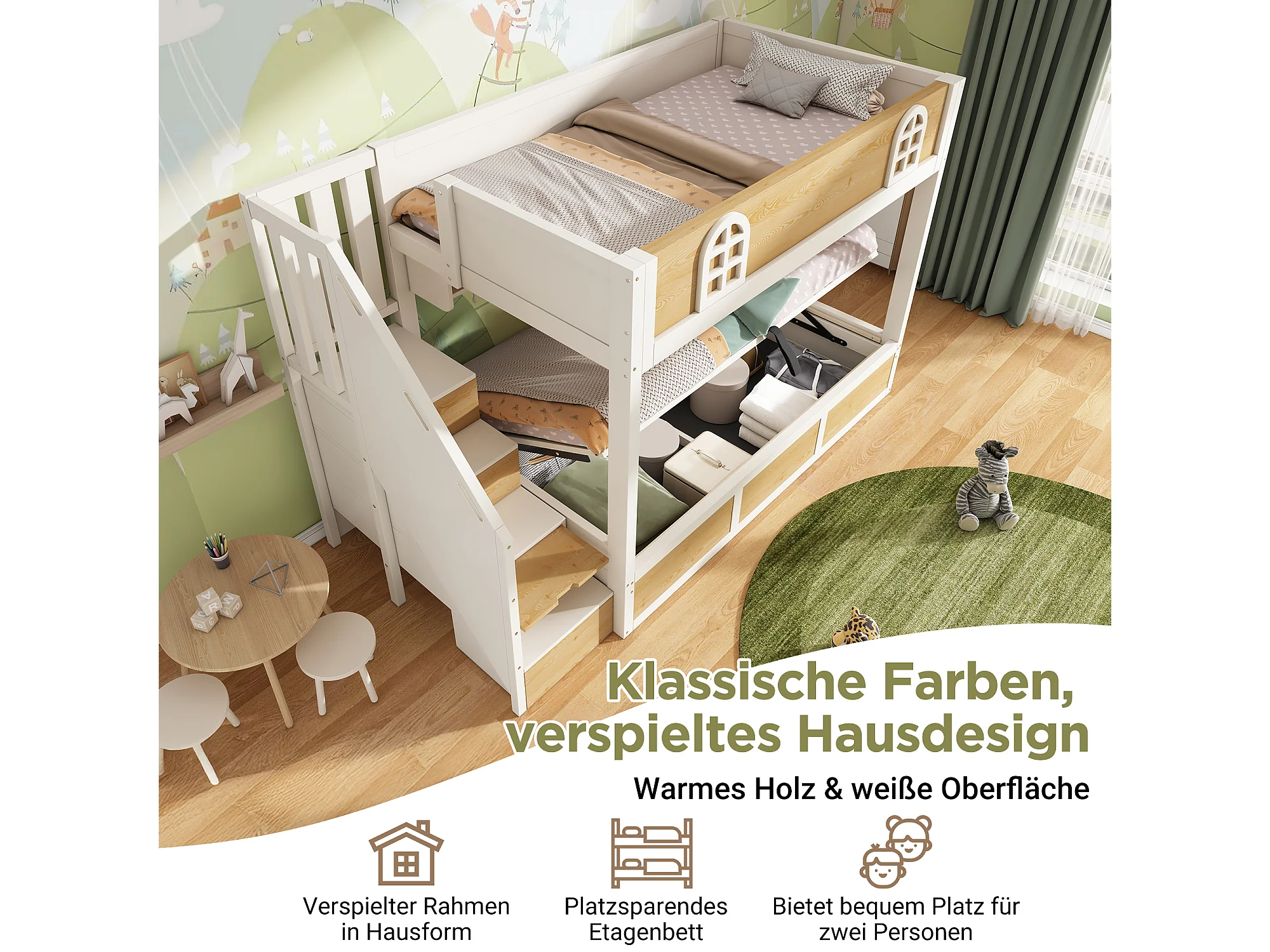 Lit superposé pourt enfant - 2 x 90 x 200 cm - avec escalier de rangement + étagère + coffre hydraulique - bois + métal - naturel