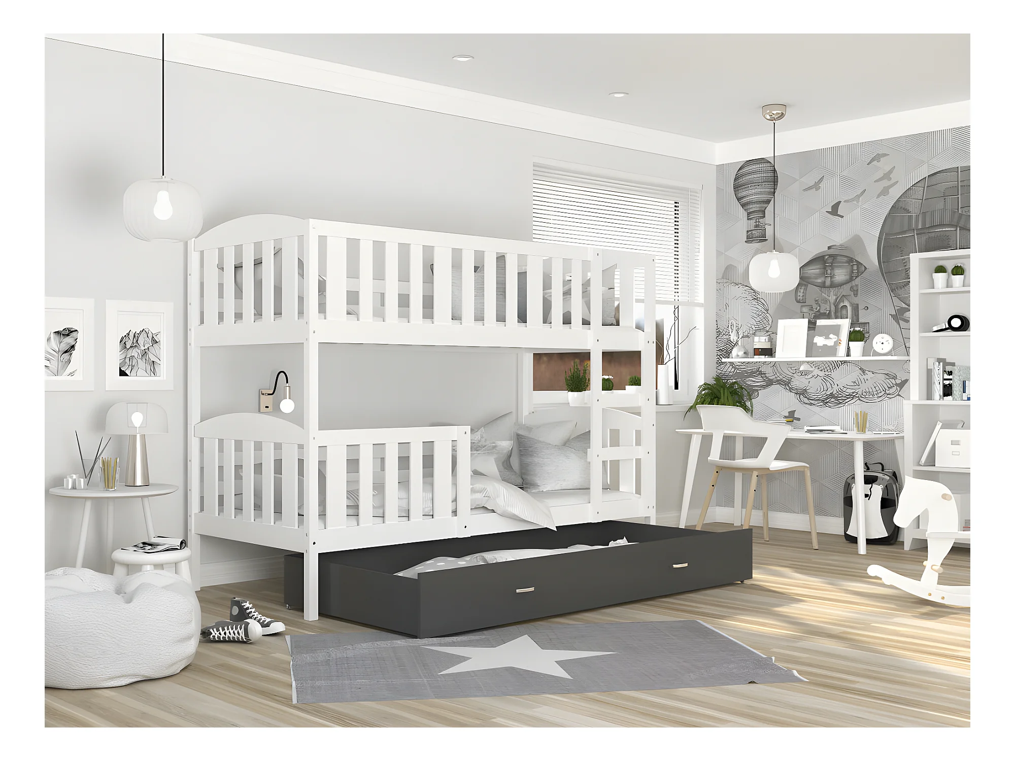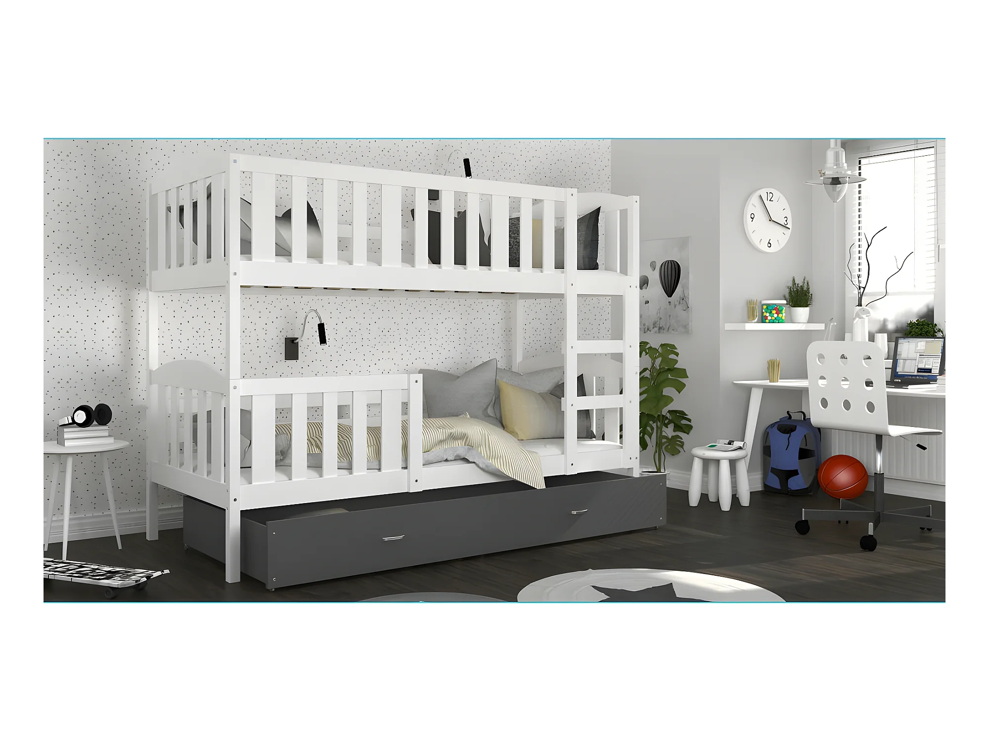 Lit Superposé Teo 90x190 Blanc - gris Livré avec sommiers, tiroir et matelas en mousse de 7cm