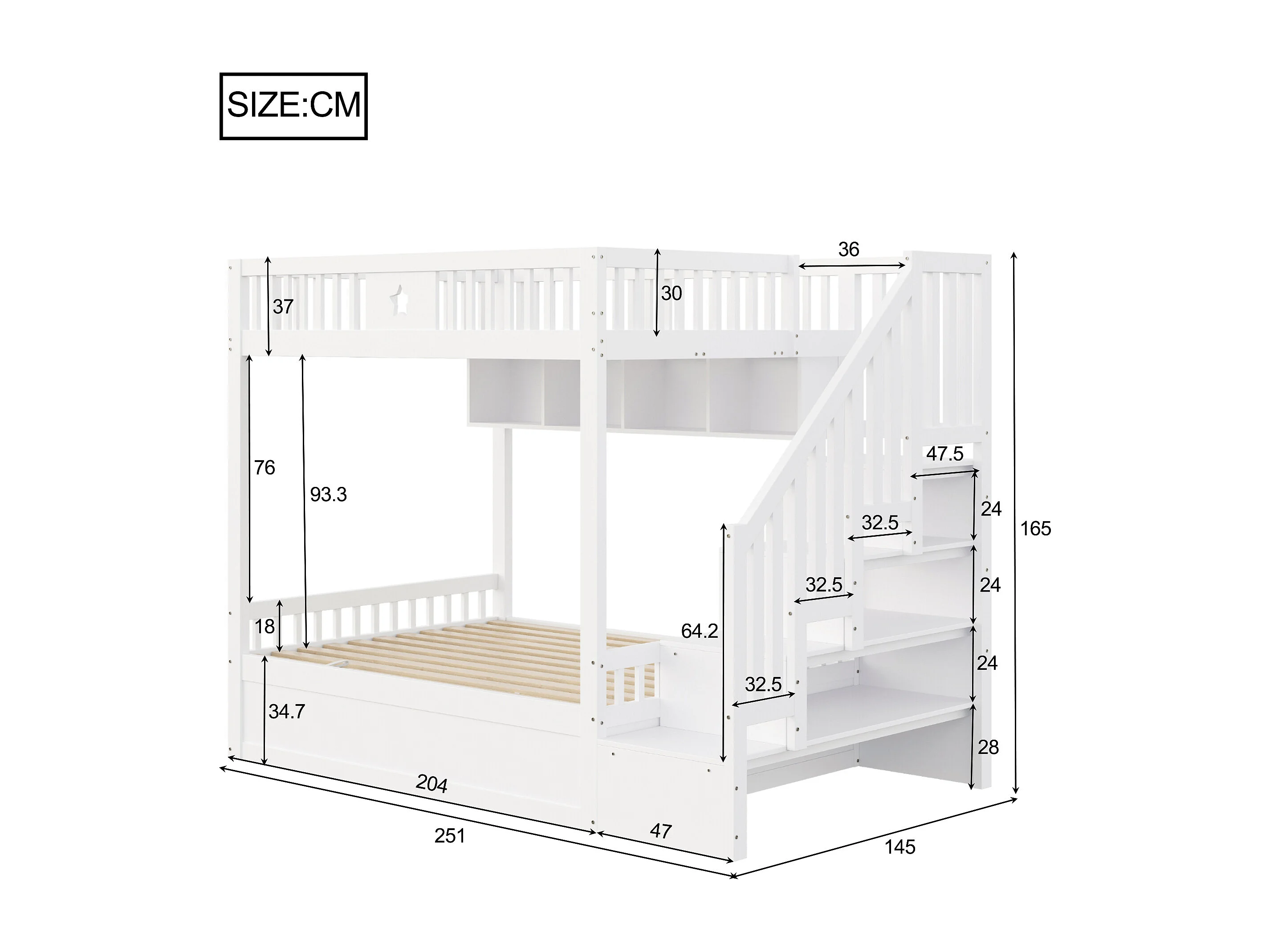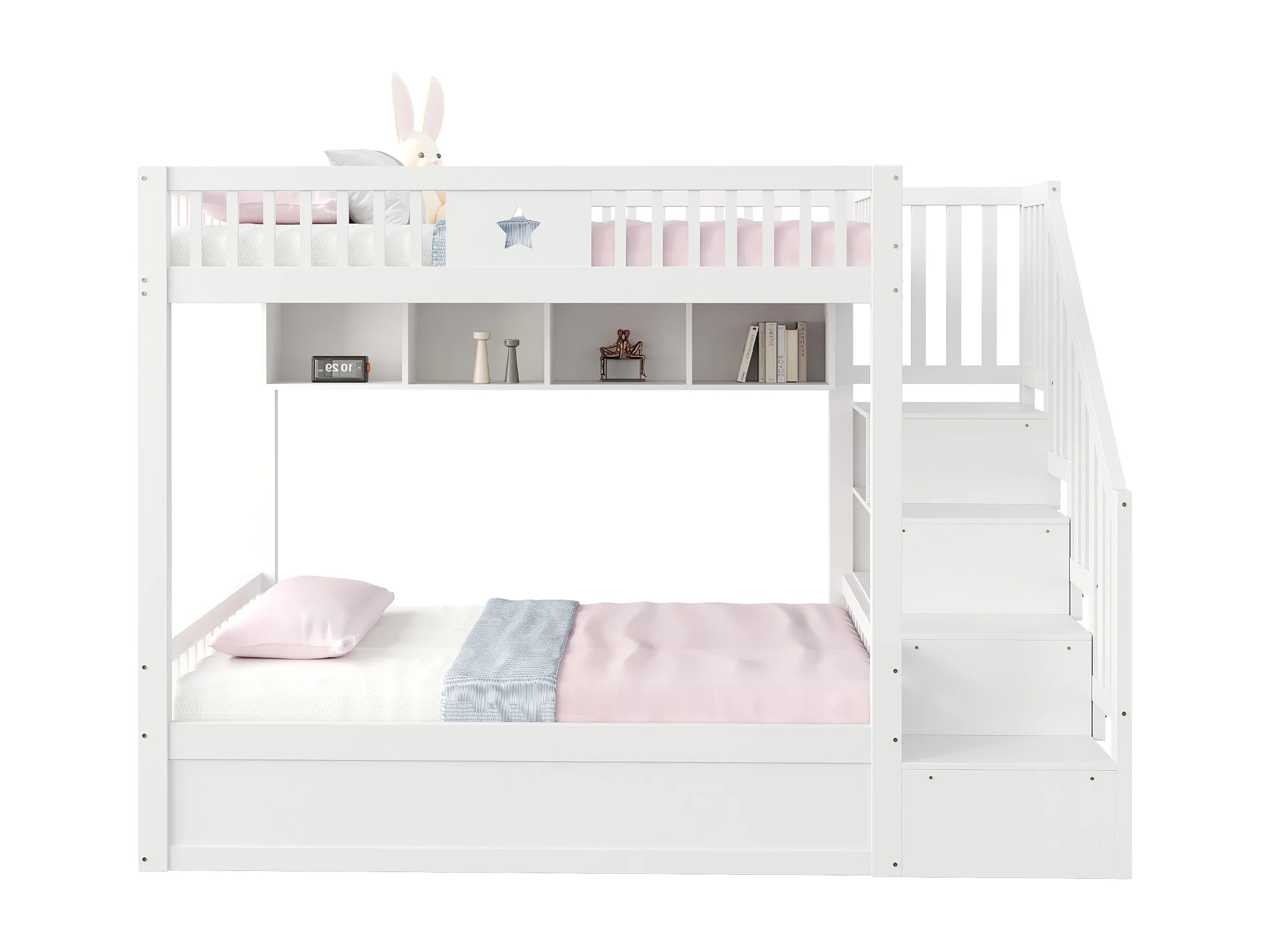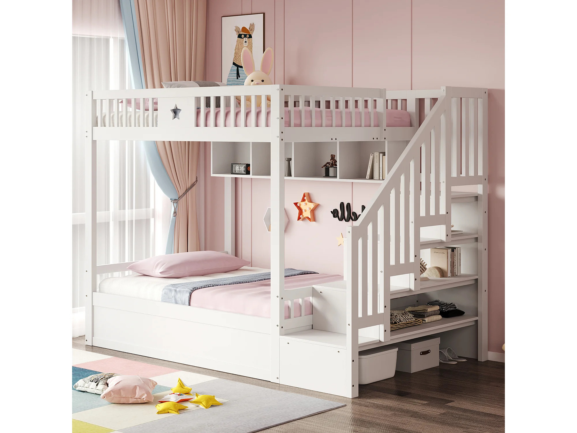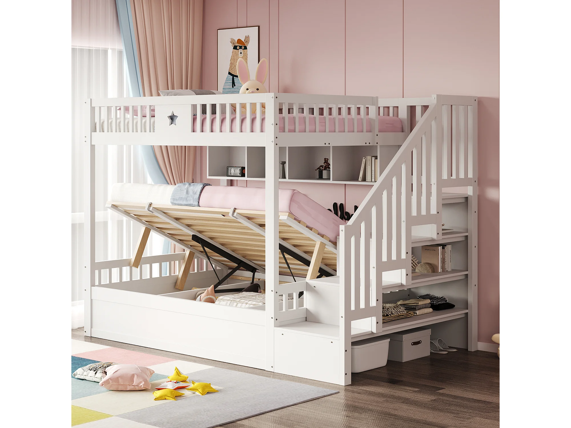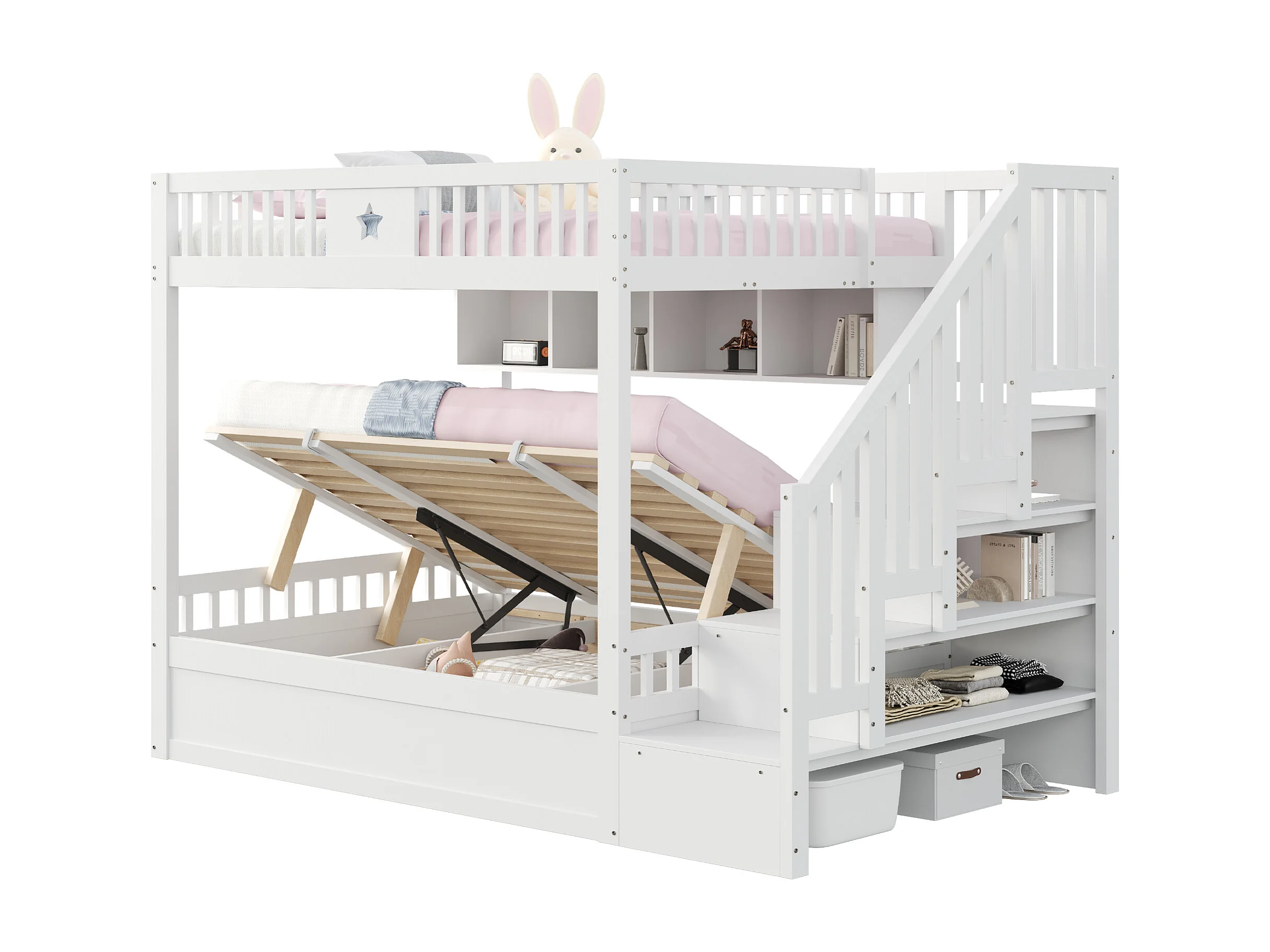 Lit superposés enfant - 2 x 140 x 200 cm - avec rangement hydraulique + escalier de rangement + étagères - bois - blanc