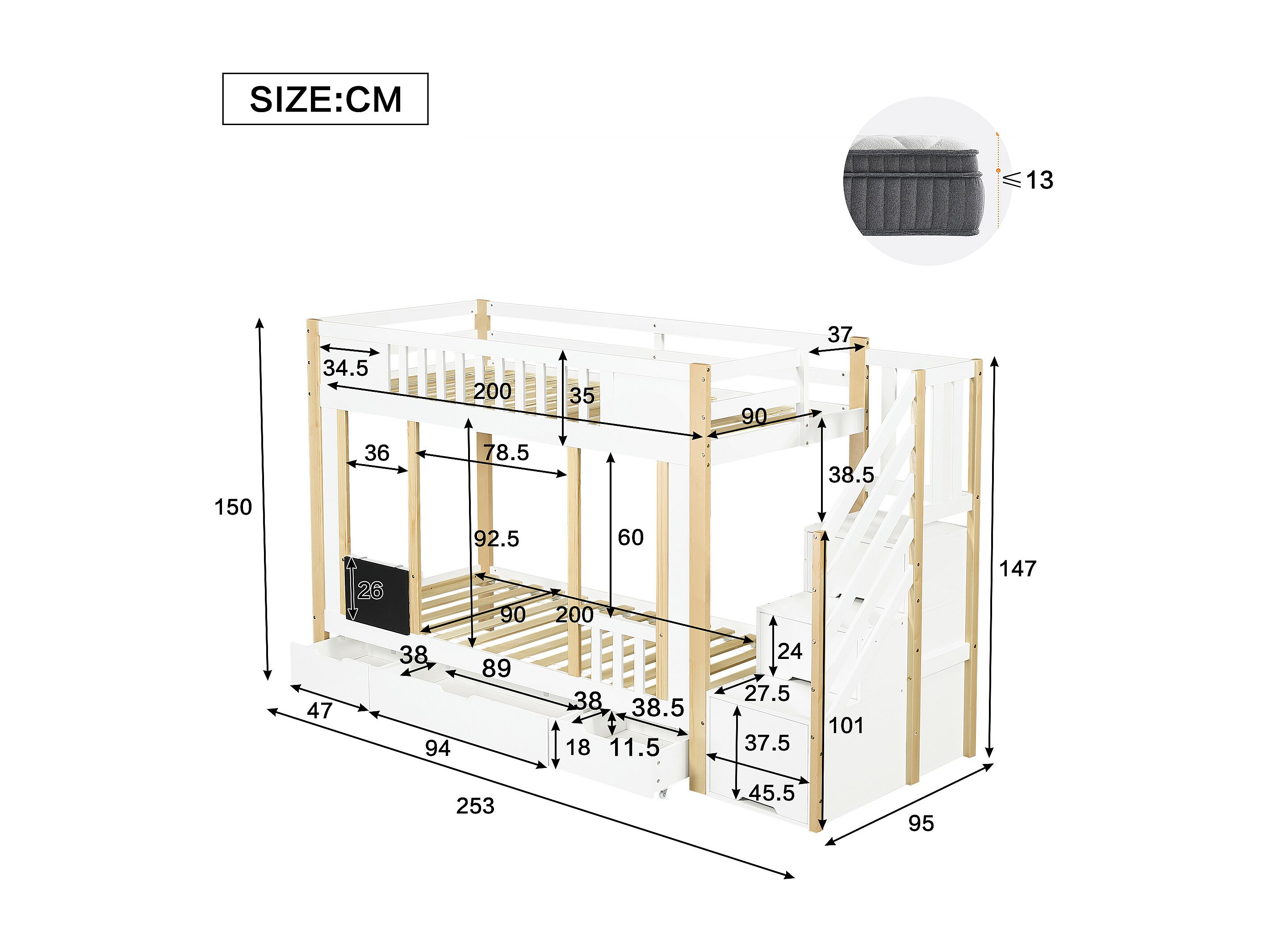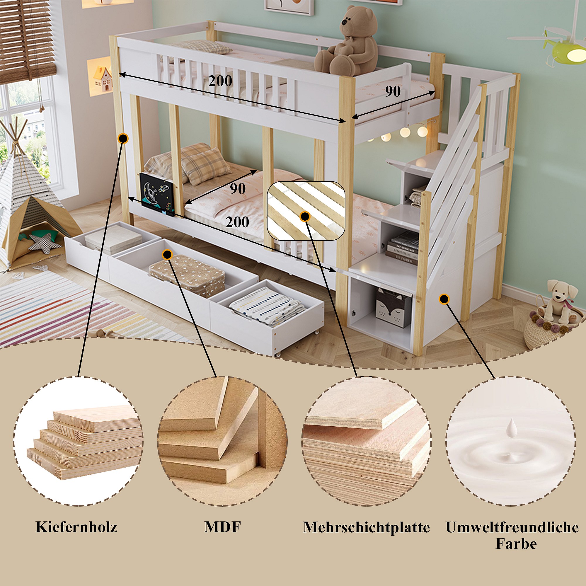 Lit superposés enfant - 2 x 90 x 200 cm - avec escalier de rangement + 3 tiroirs - pin + MDF + contreplaqué - blanc + nature