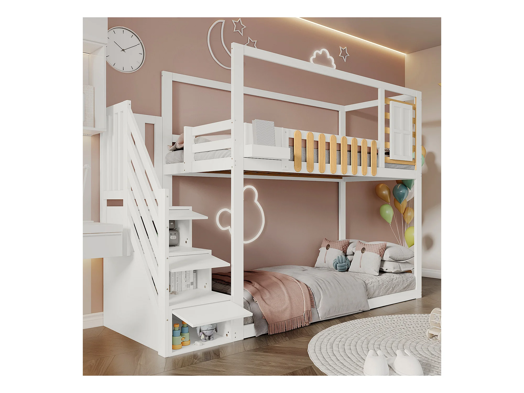 Lit superposés enfant - 2 x 90 x 200 cm - avec fenêtre + 3 casiers dans l'escalier - MDF + bois - blanc