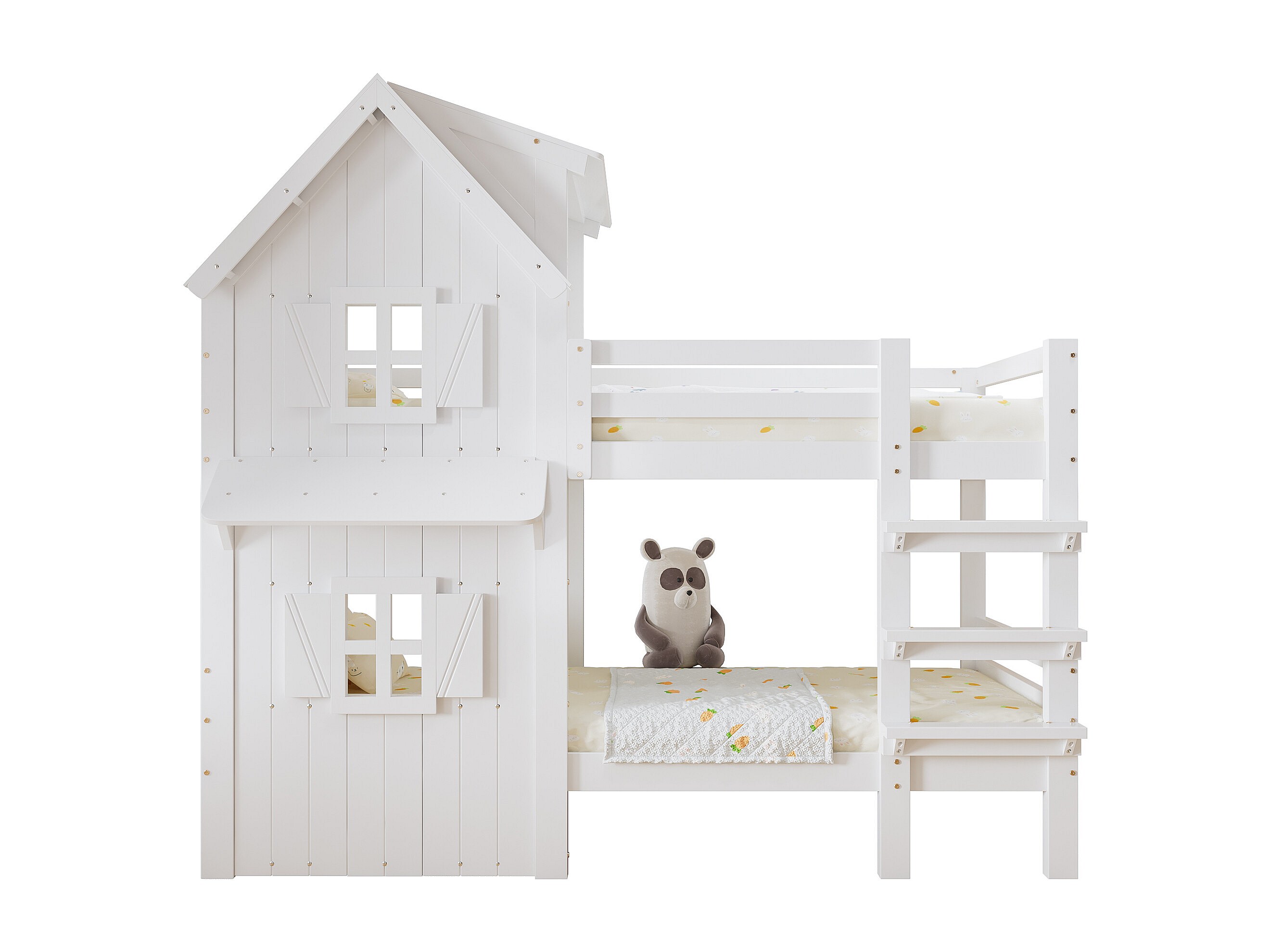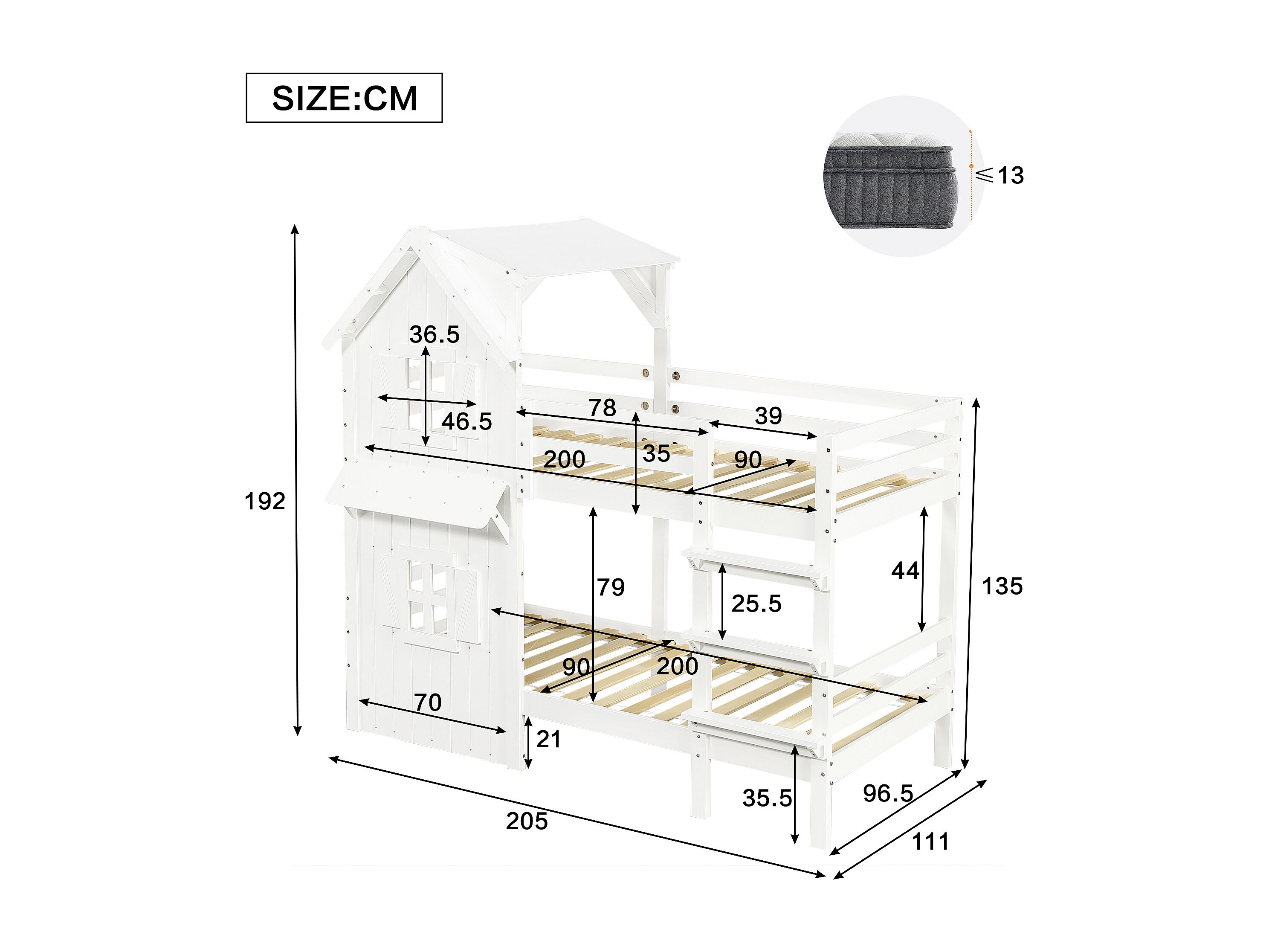 Lit superposés enfant - 2 x 90 x 200 cm - avec fenêtres et toit + barrières de sécurité - pin + MDF + contreplaqué - blanc
