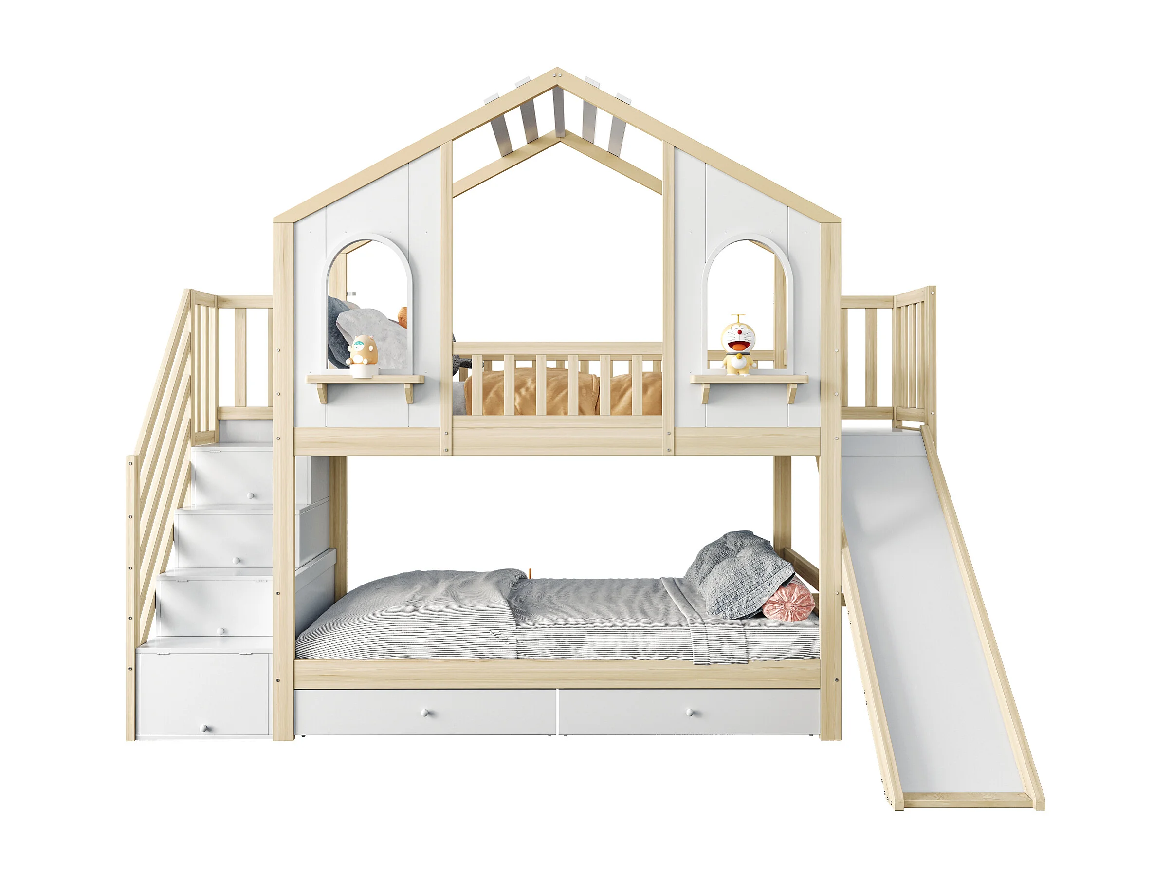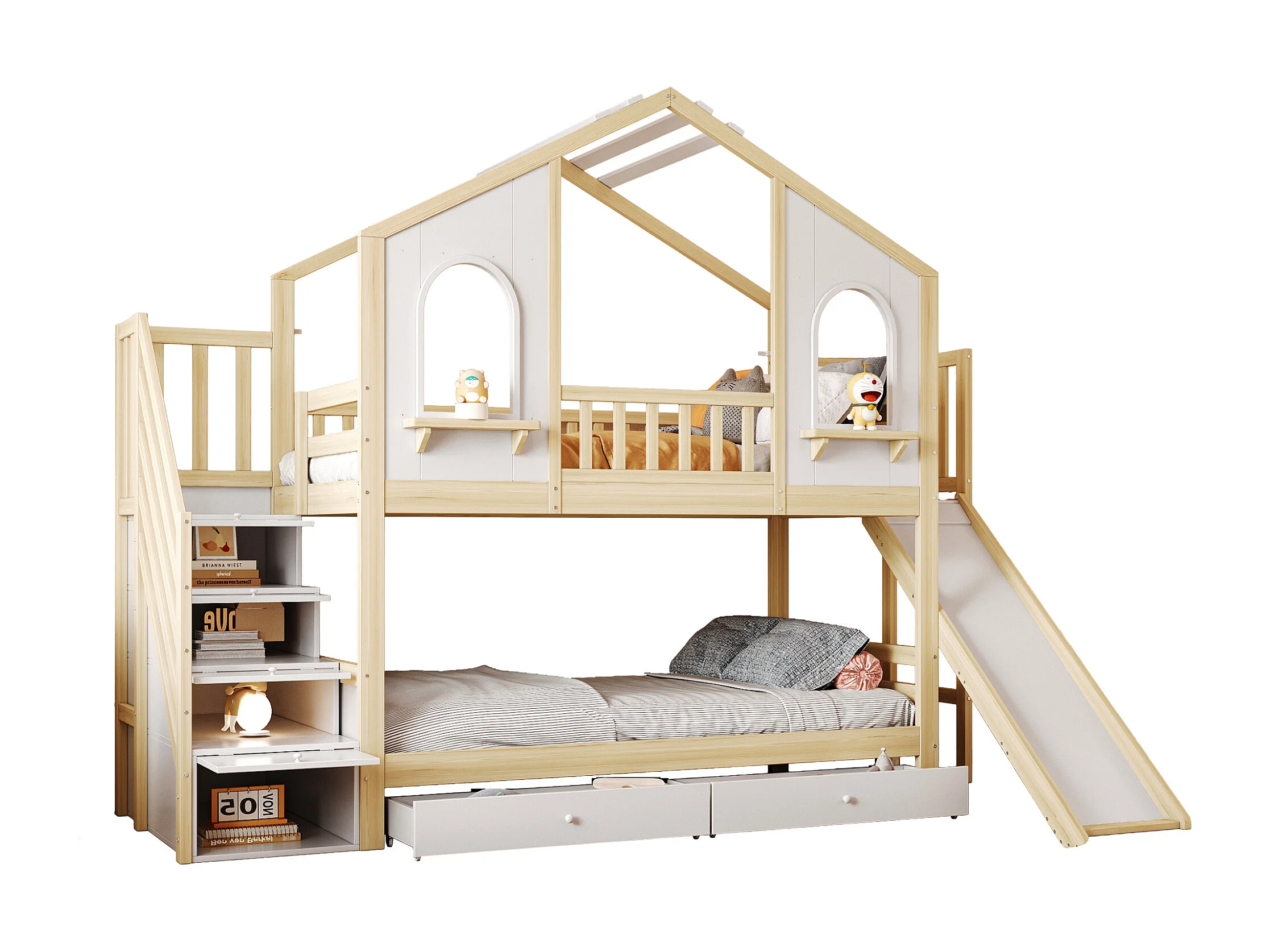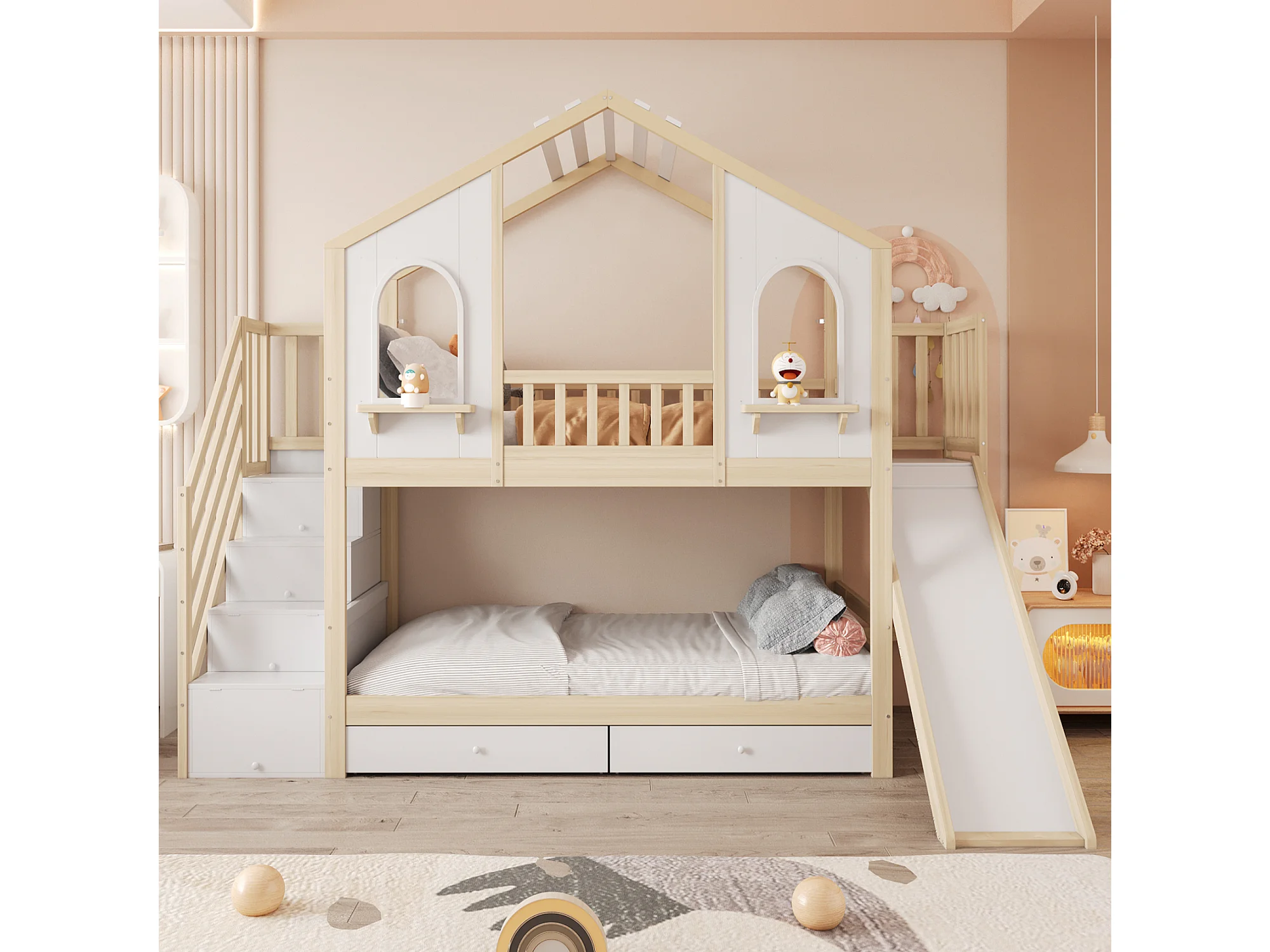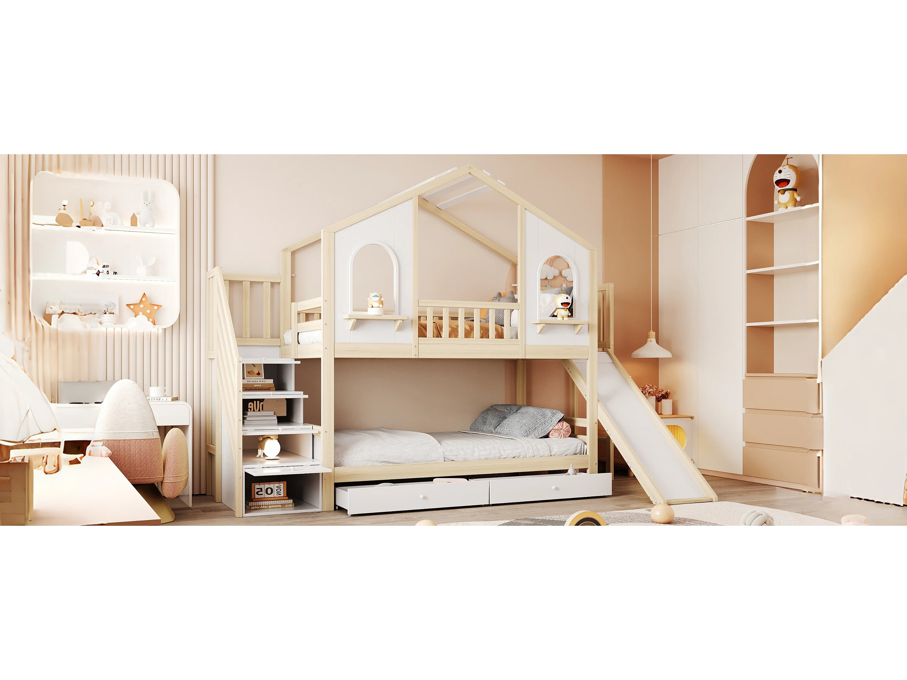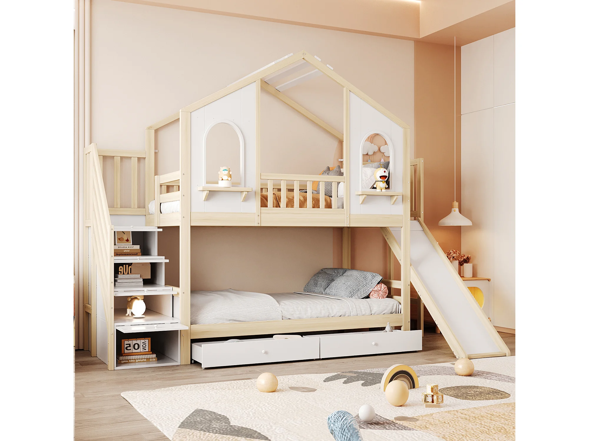 Lit superposés enfant - 2 x 90 x 200 cm - en forme de maison - avec escalier de rangement + tiroirs - bois - blanc + naturel