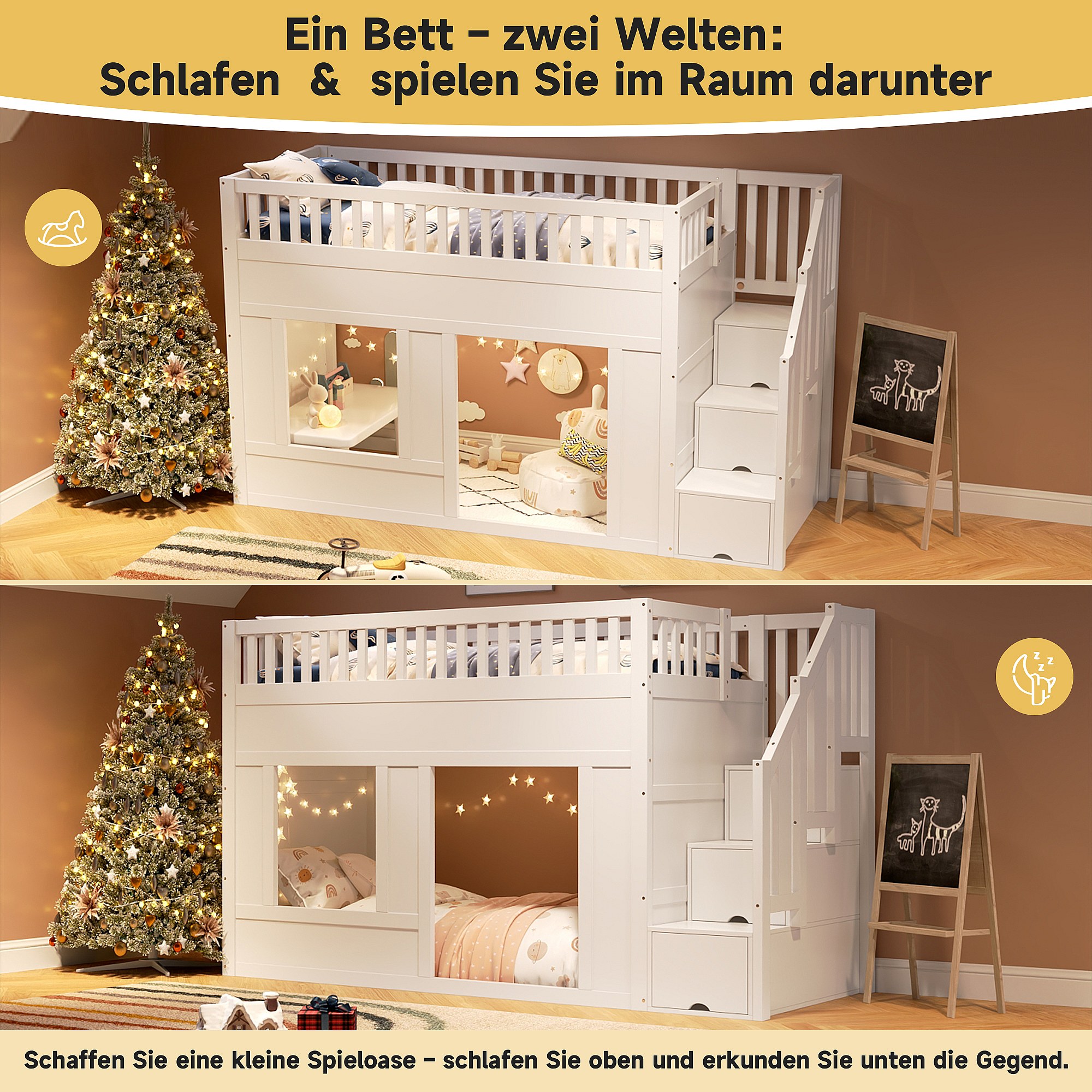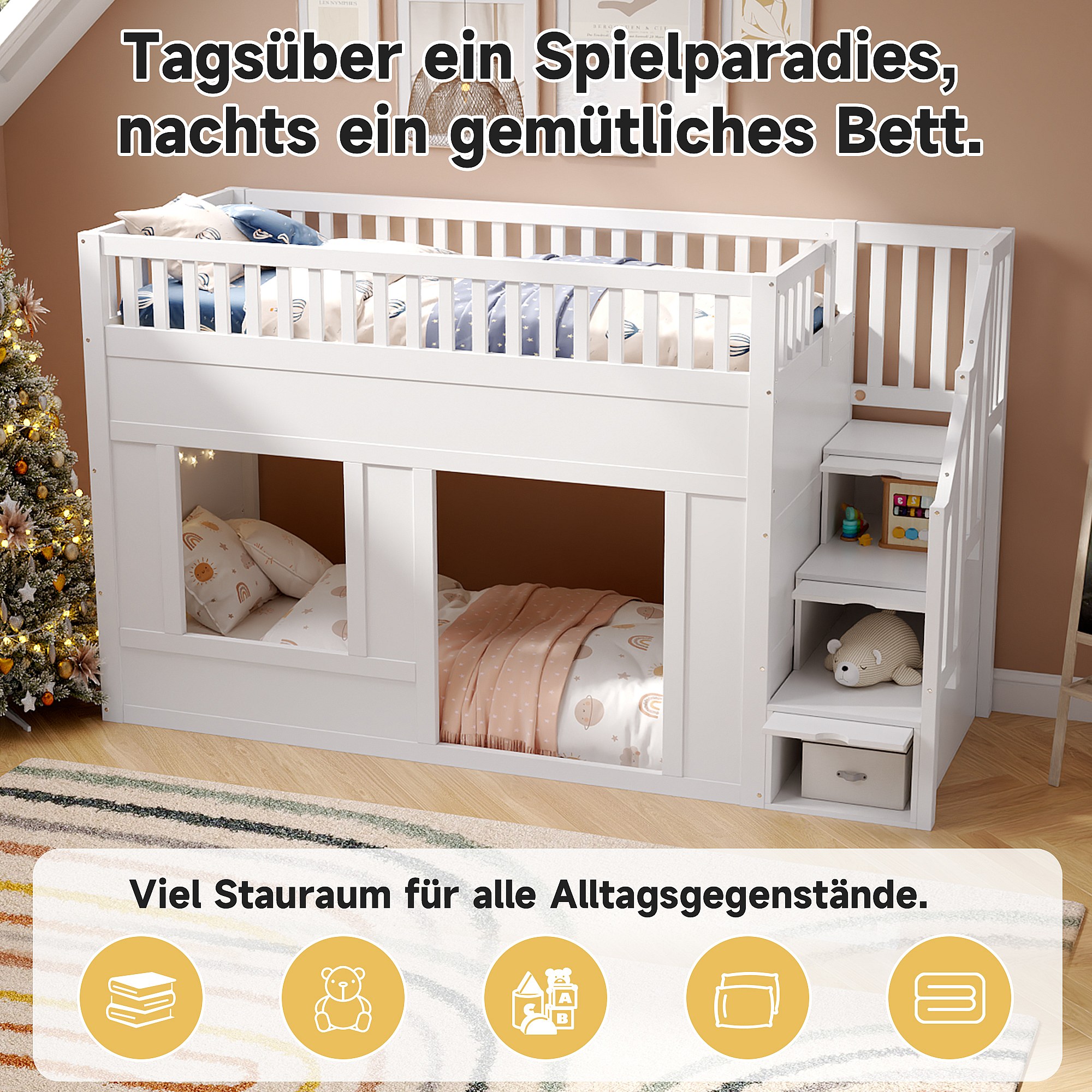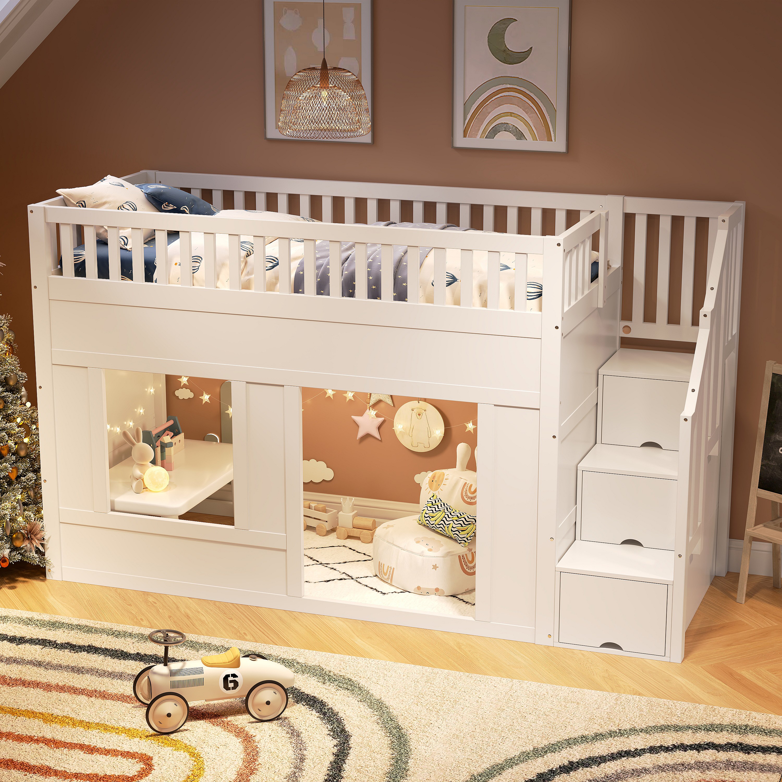 Lit superposés pour enfant - 2 x 90 x 200 cm - avec escalier de rangement - sans matelas - bois - blanc