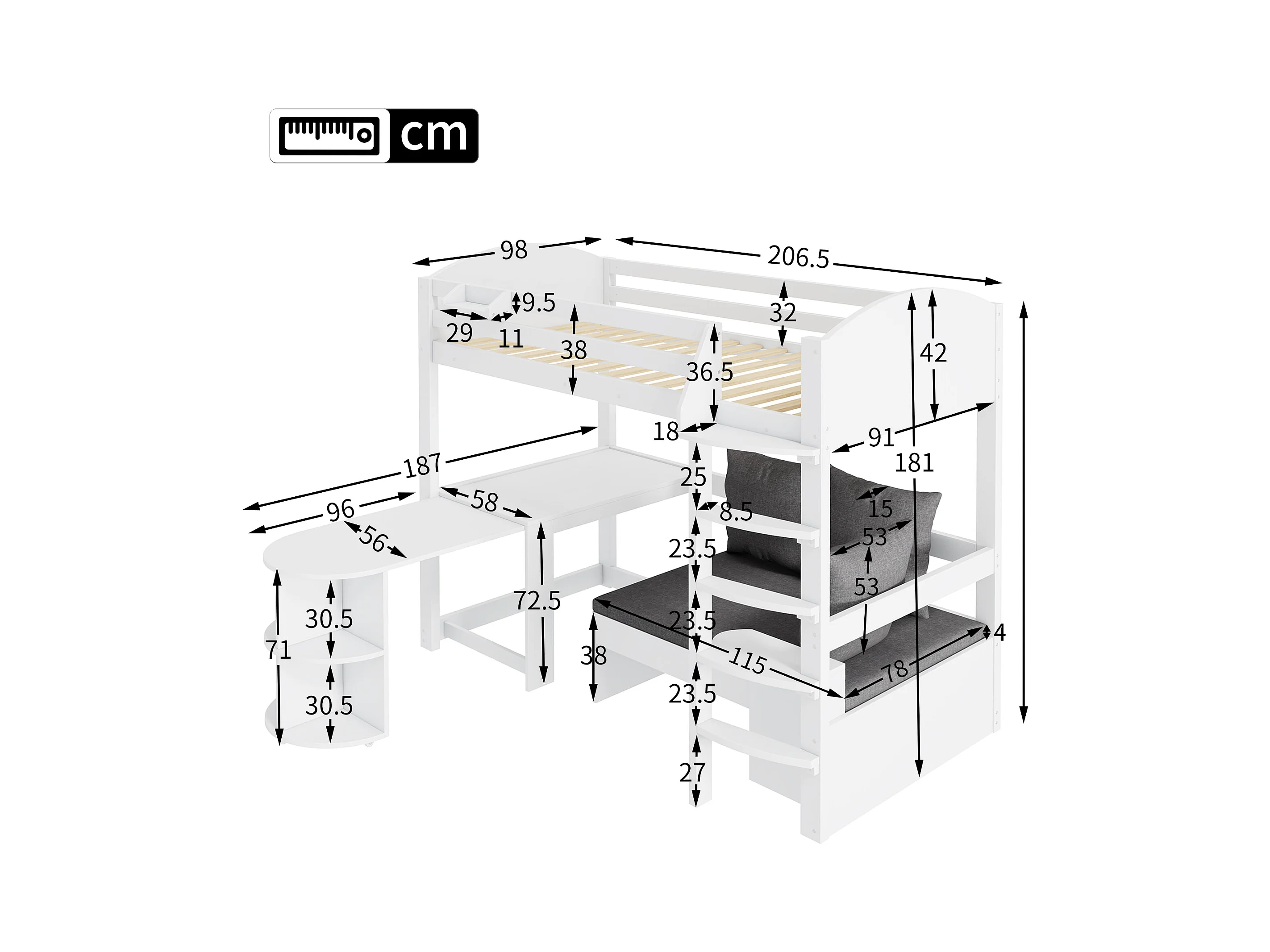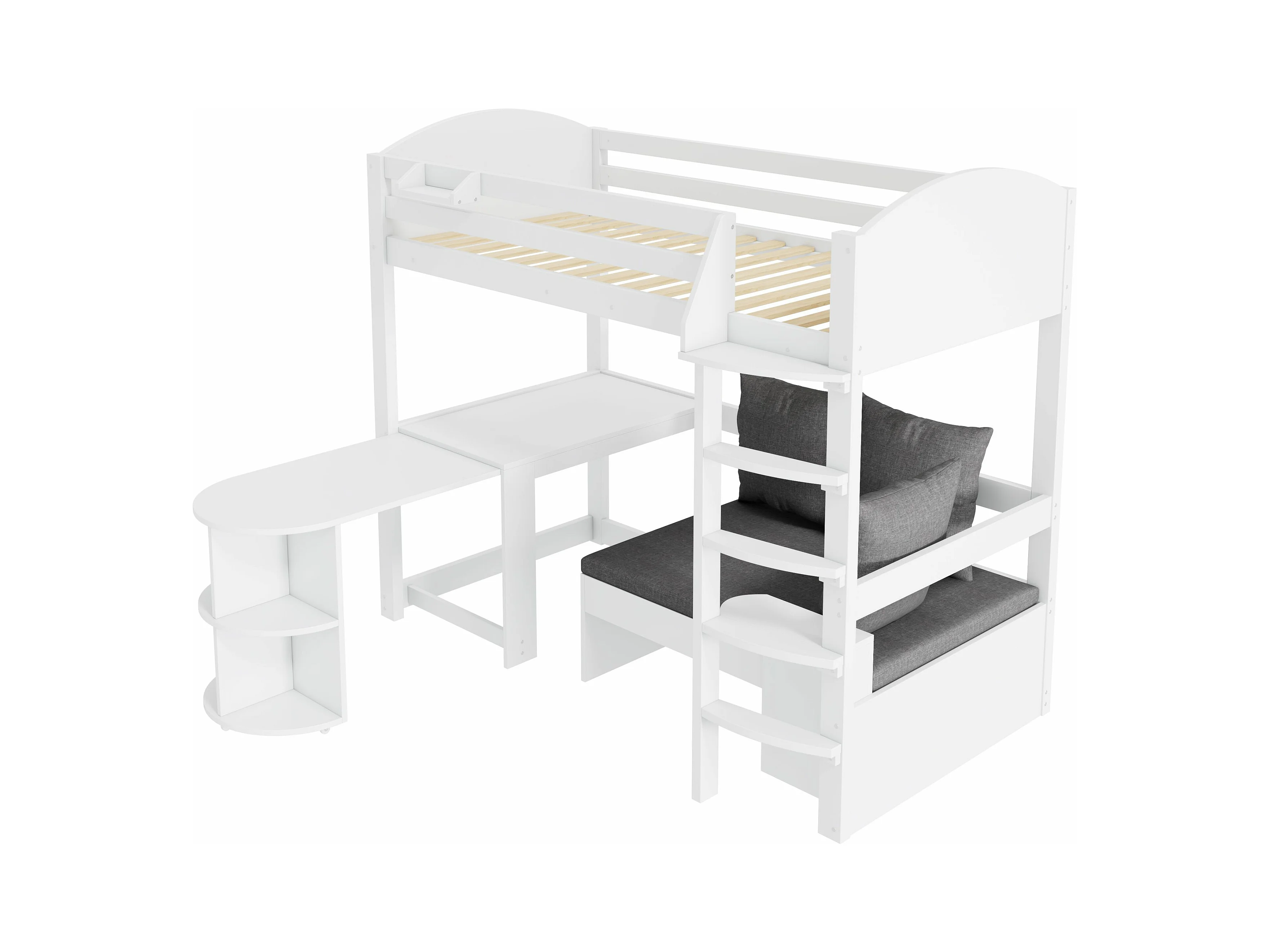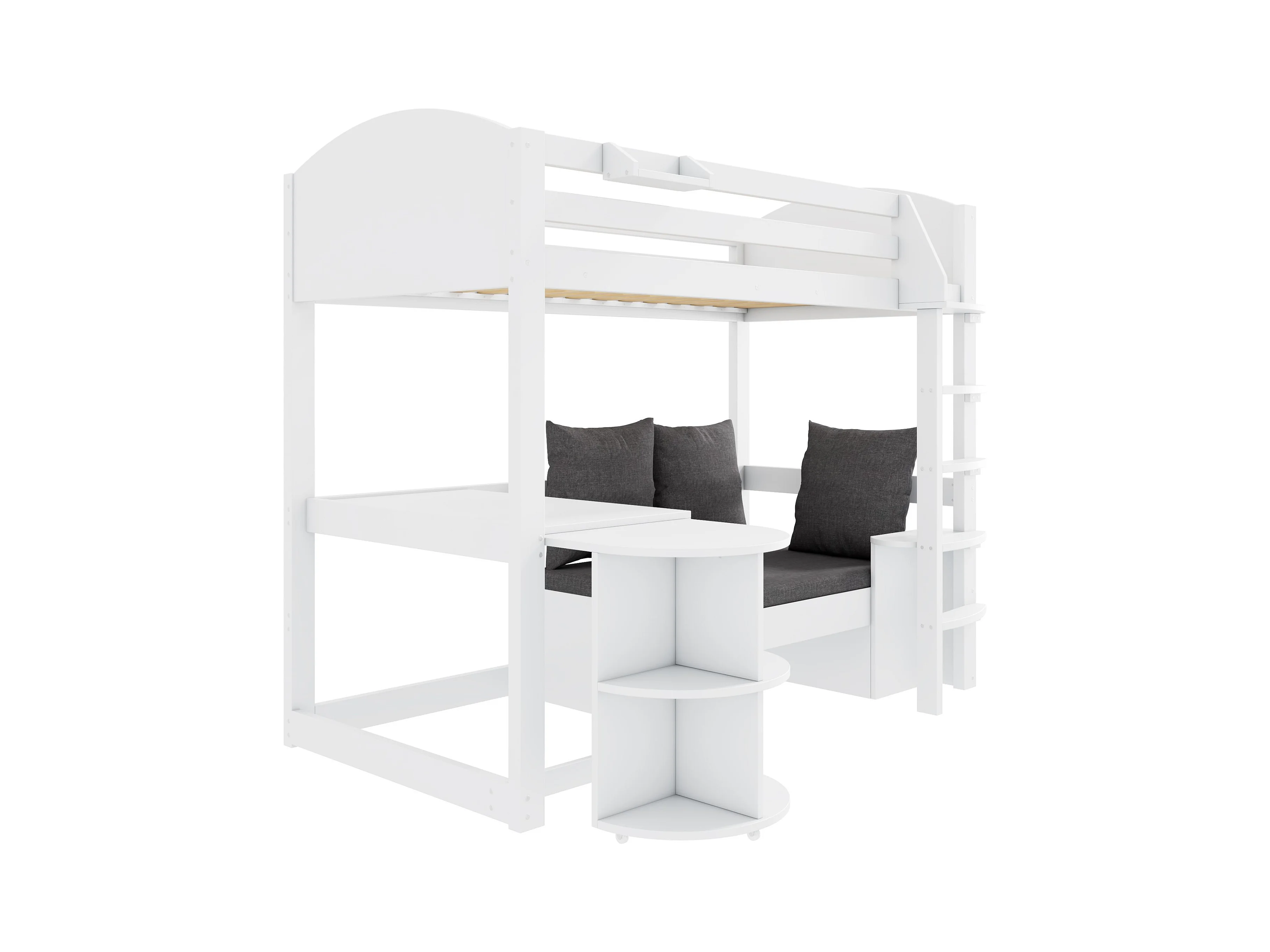Lit surélevé d'enfant, 90x200cm, avec échelle, table extensible, bois massif, blanc, sans matelas