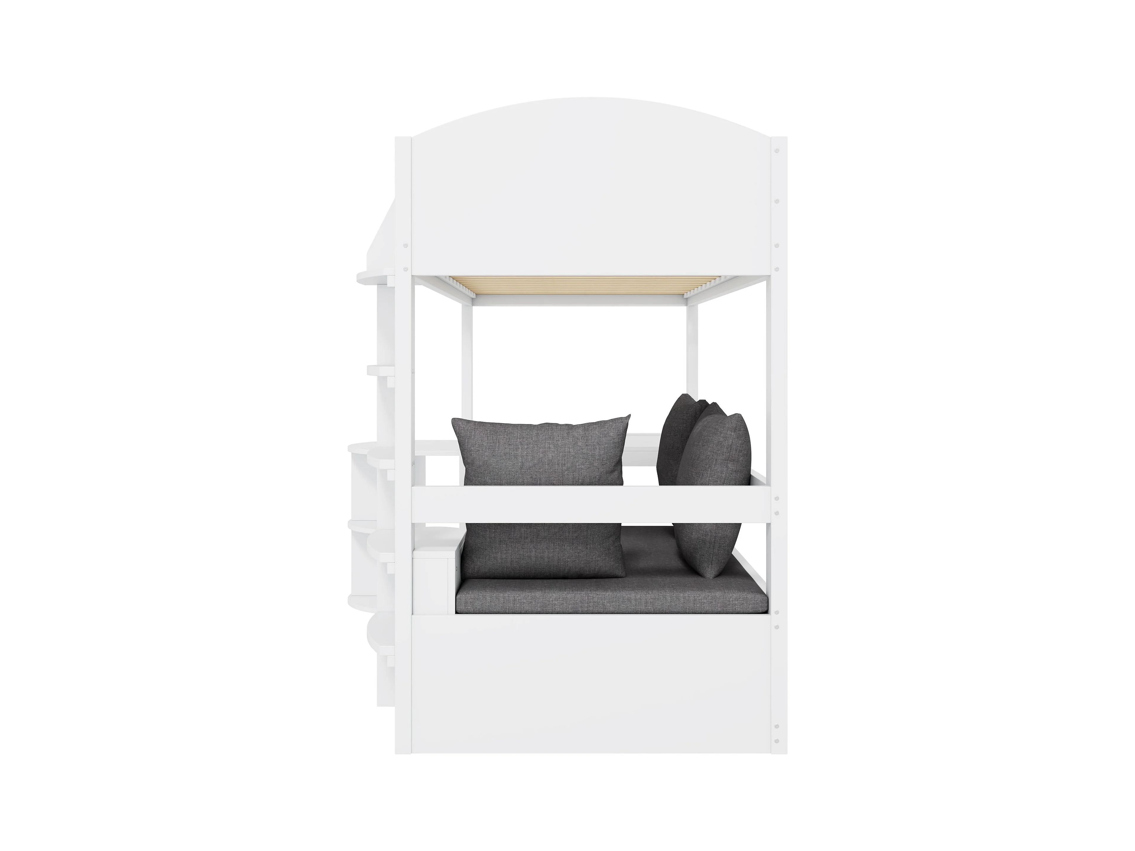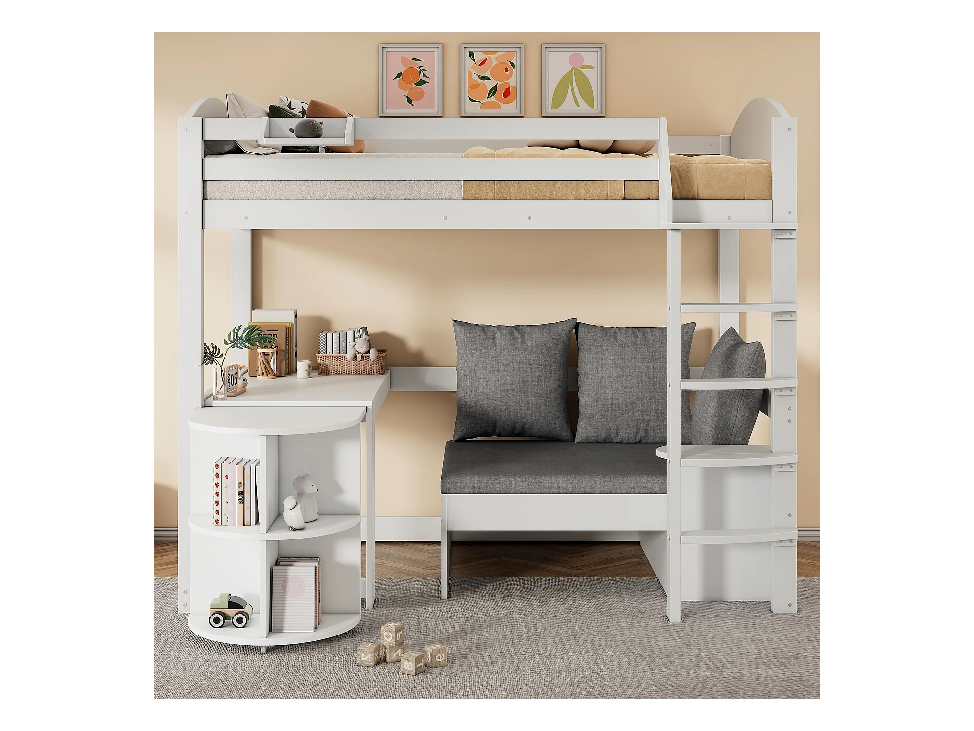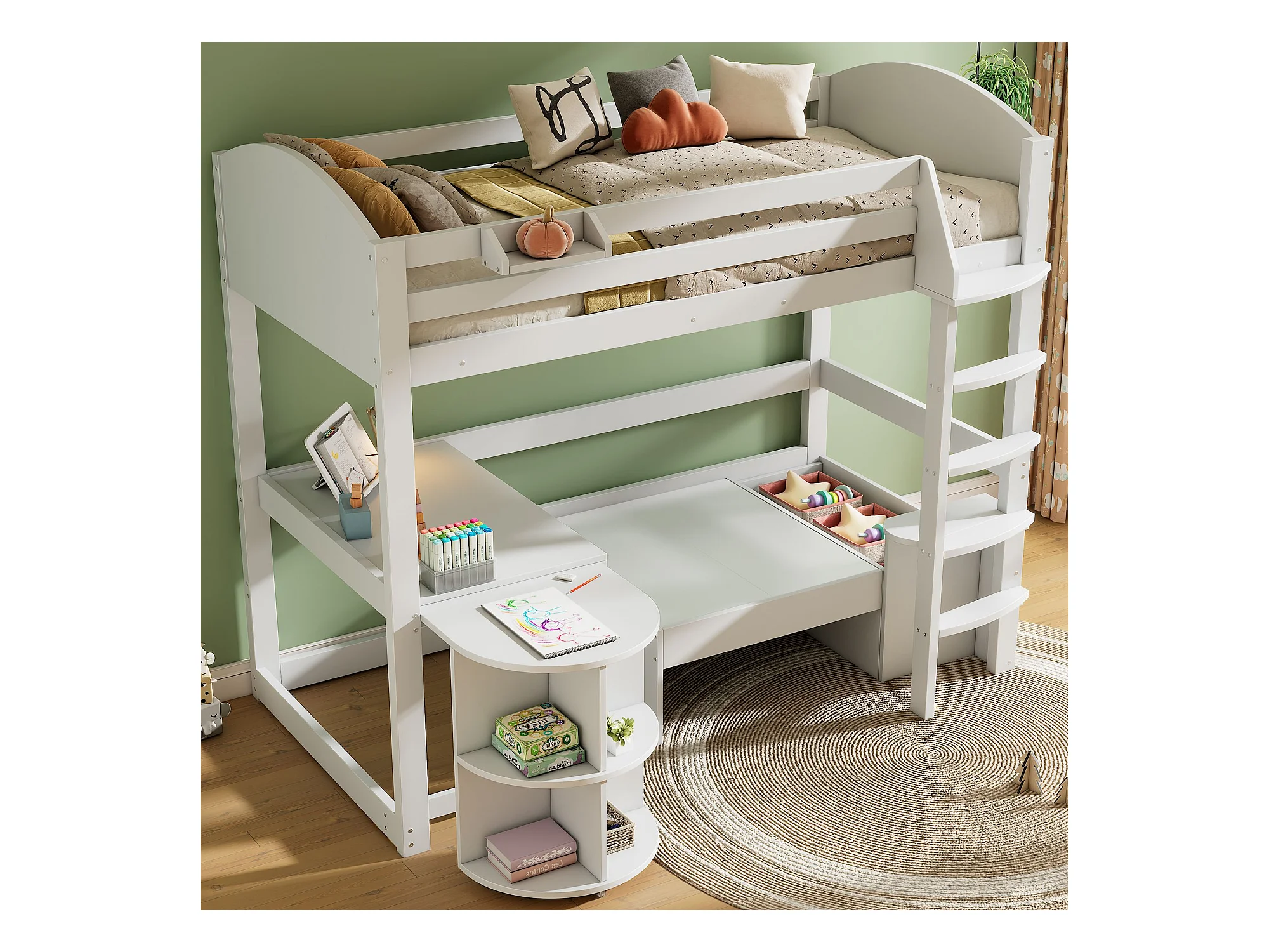Lit surélevé d'enfant, 90x200cm, avec échelle, table extensible, bois massif, blanc, sans matelas