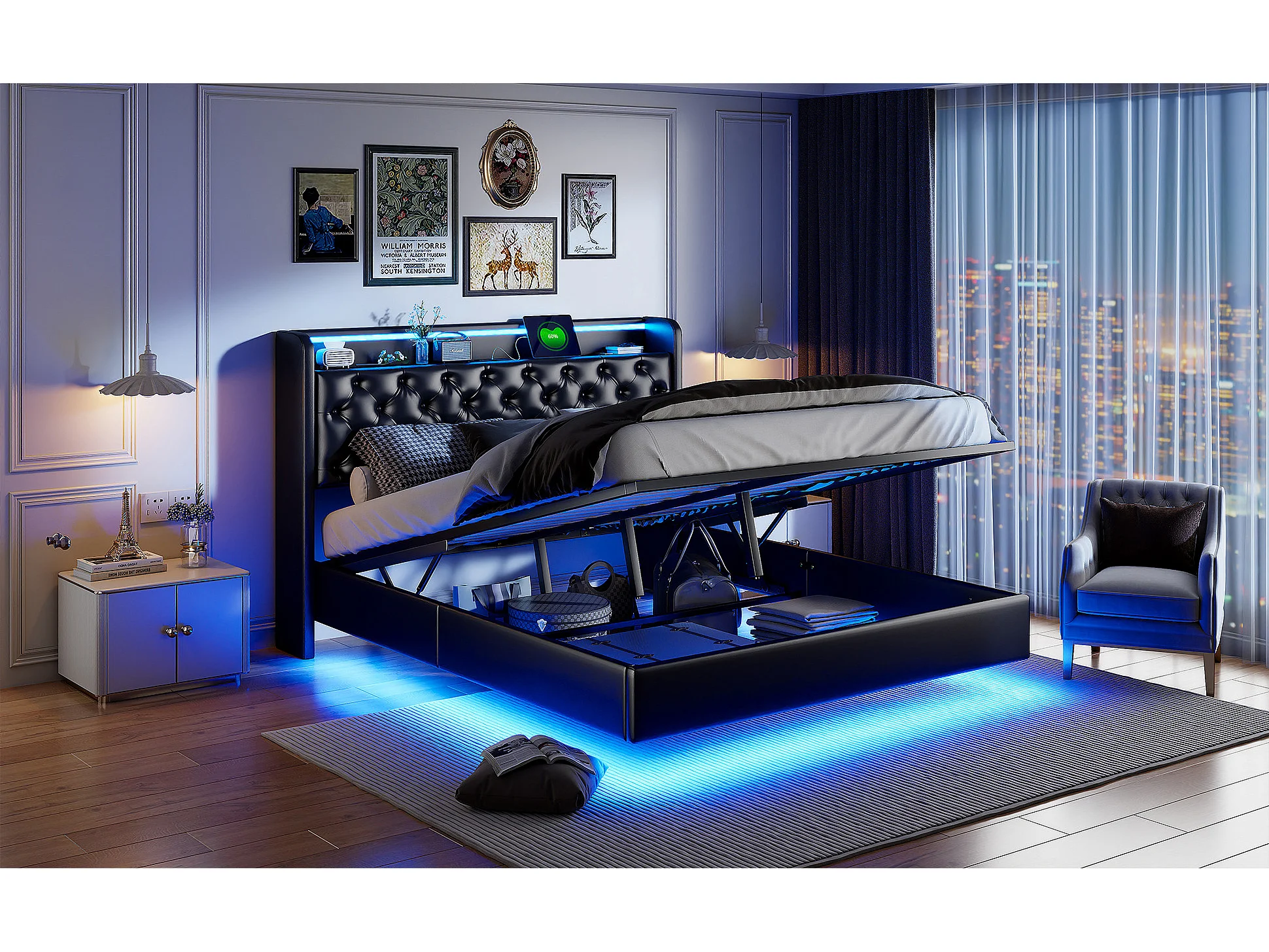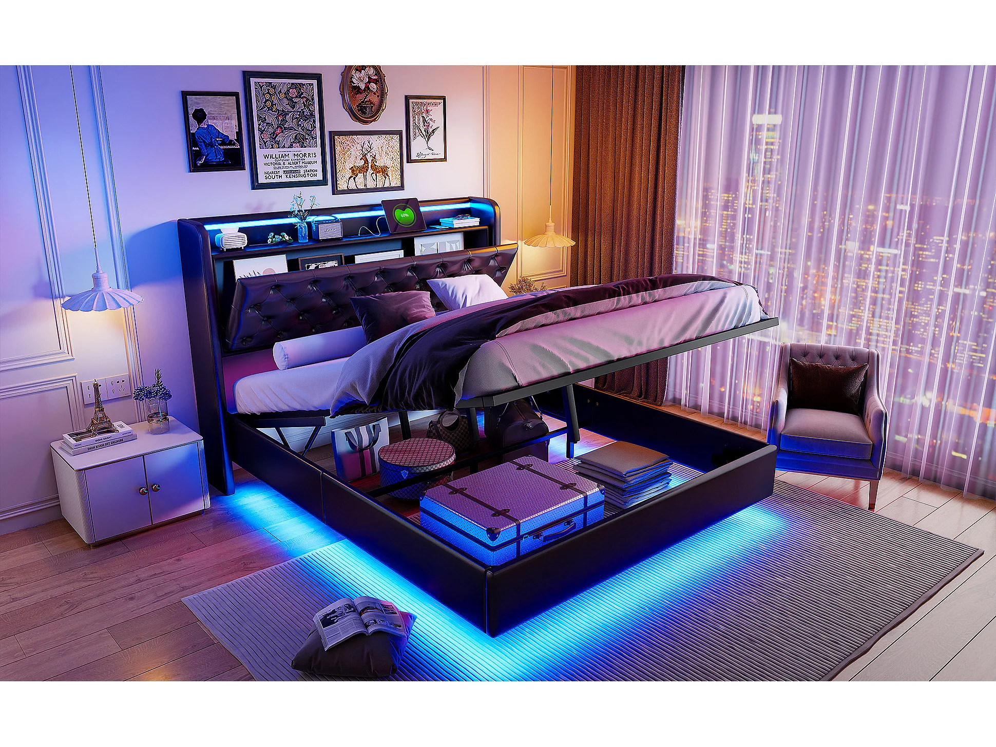 Lit tapis 140x200cm, lit double avec fonction de charge USB, éclairage LED, tête avec espace de rangement, lit suspendu, pieds de lit cachés, finition cuir, noir