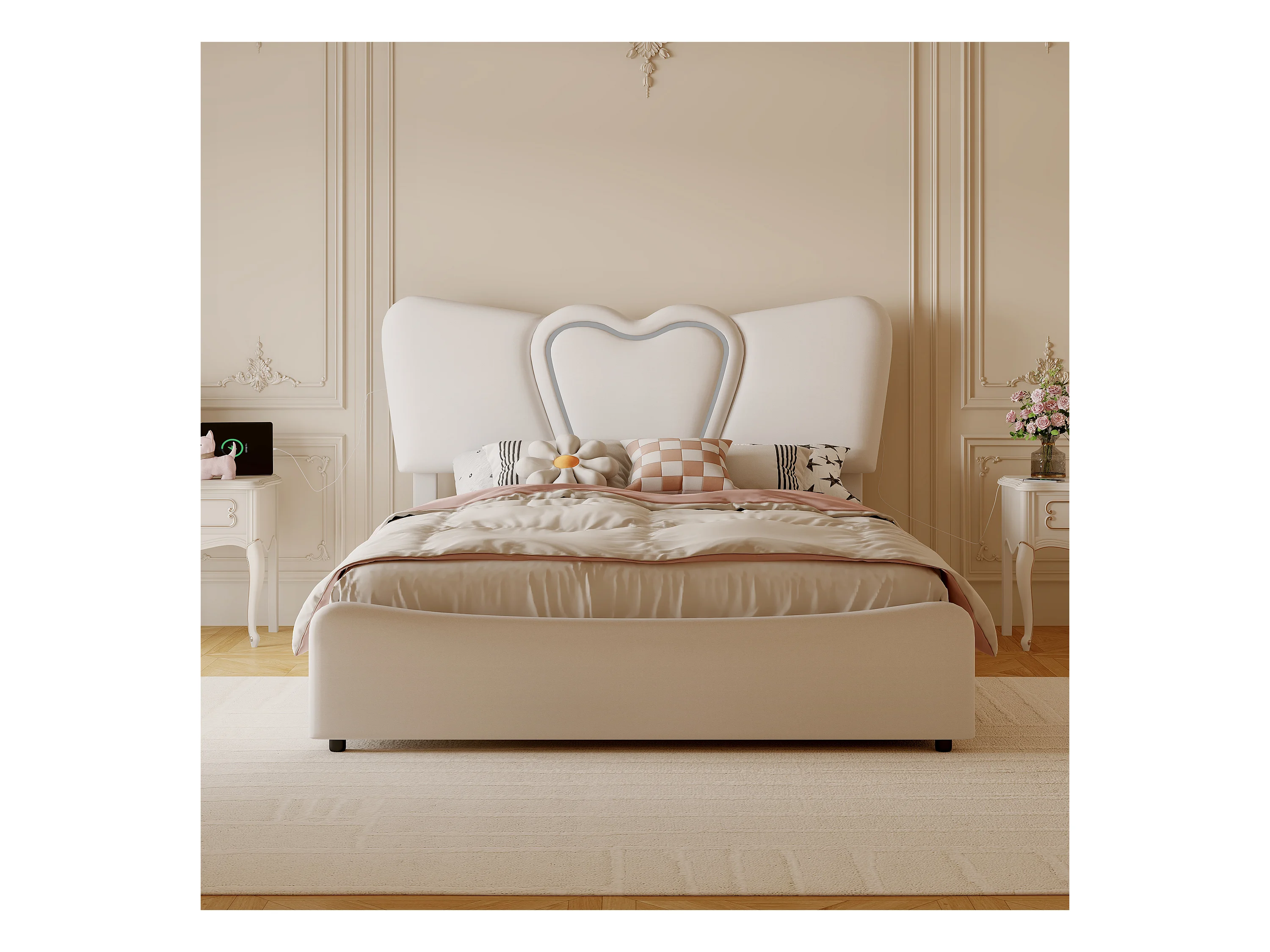 Lit tapissé 140 x 200 cm avec lumières LED et USB, avec rangement, tissu de velours,lit double 160 x 200 cm, beige (sans matelas)