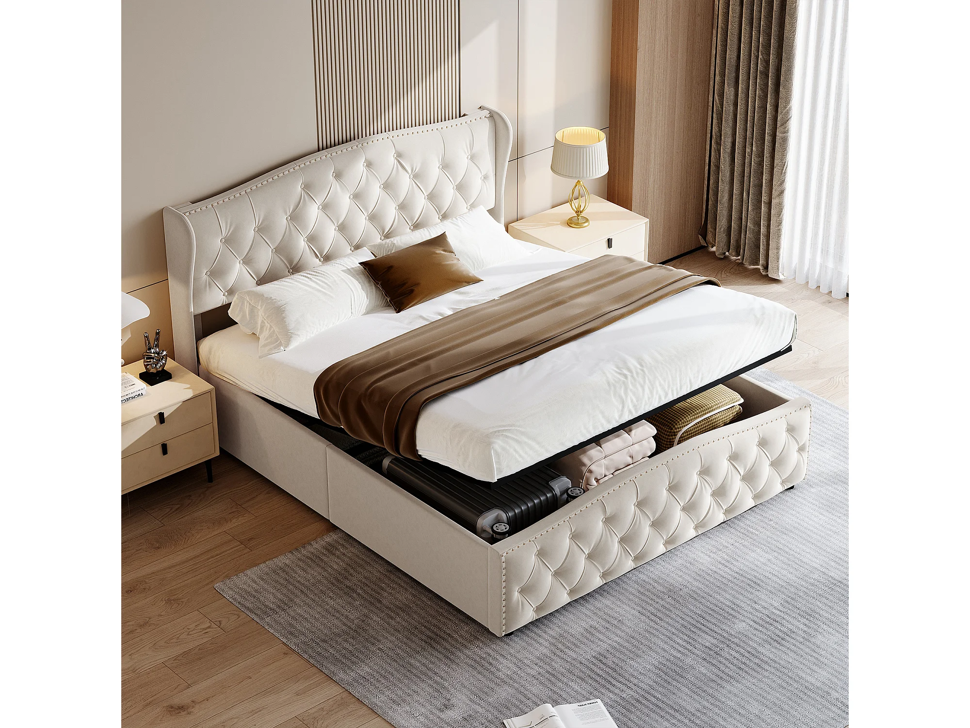Lit tapissé 140x200 cm, lit coffre hydraulique avec rangement et sommier à lattes, cadre de lit double avec tête de lit,velours, beige