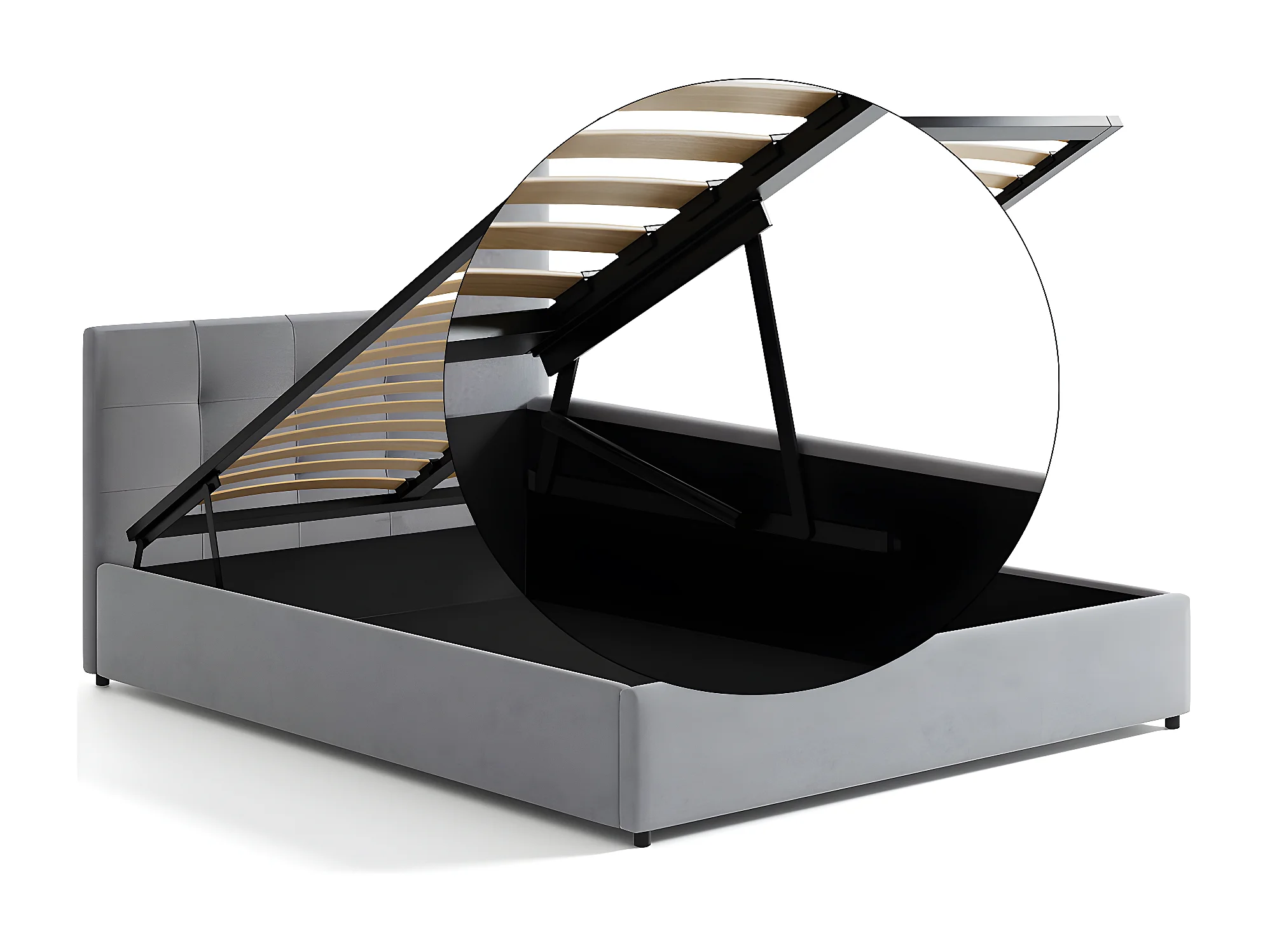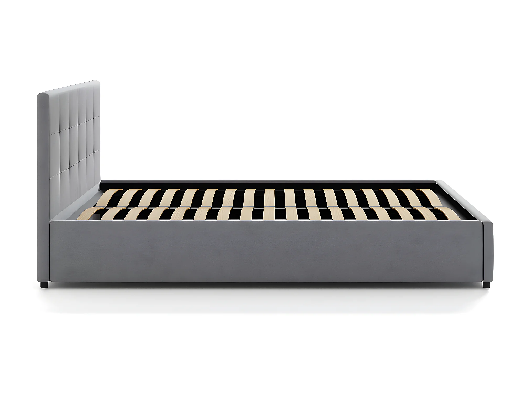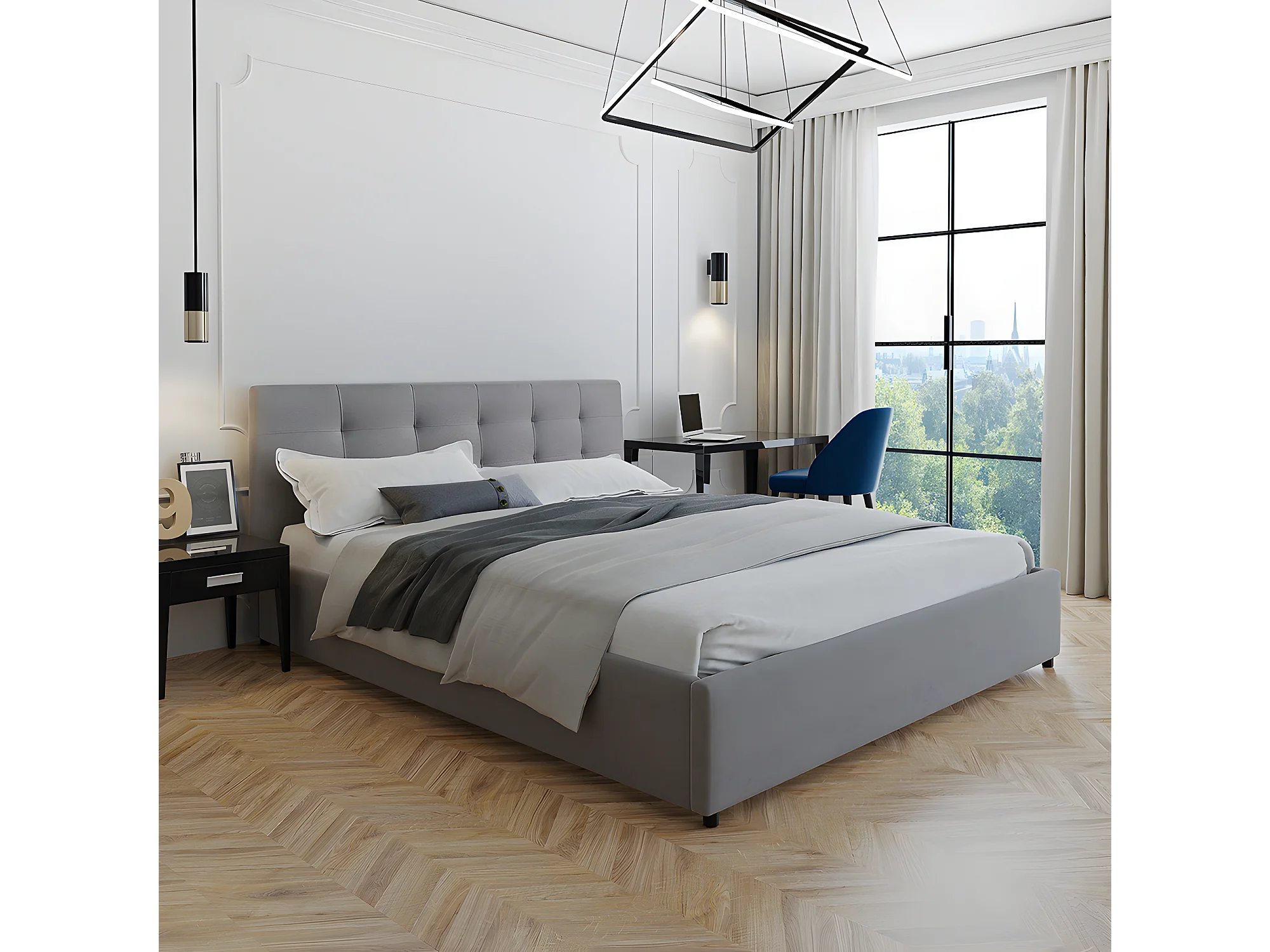 Lit tapissé 140x200 gris avec rangement et tête de lit