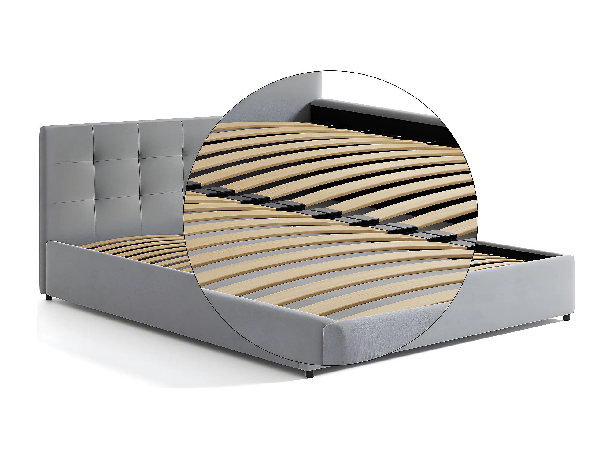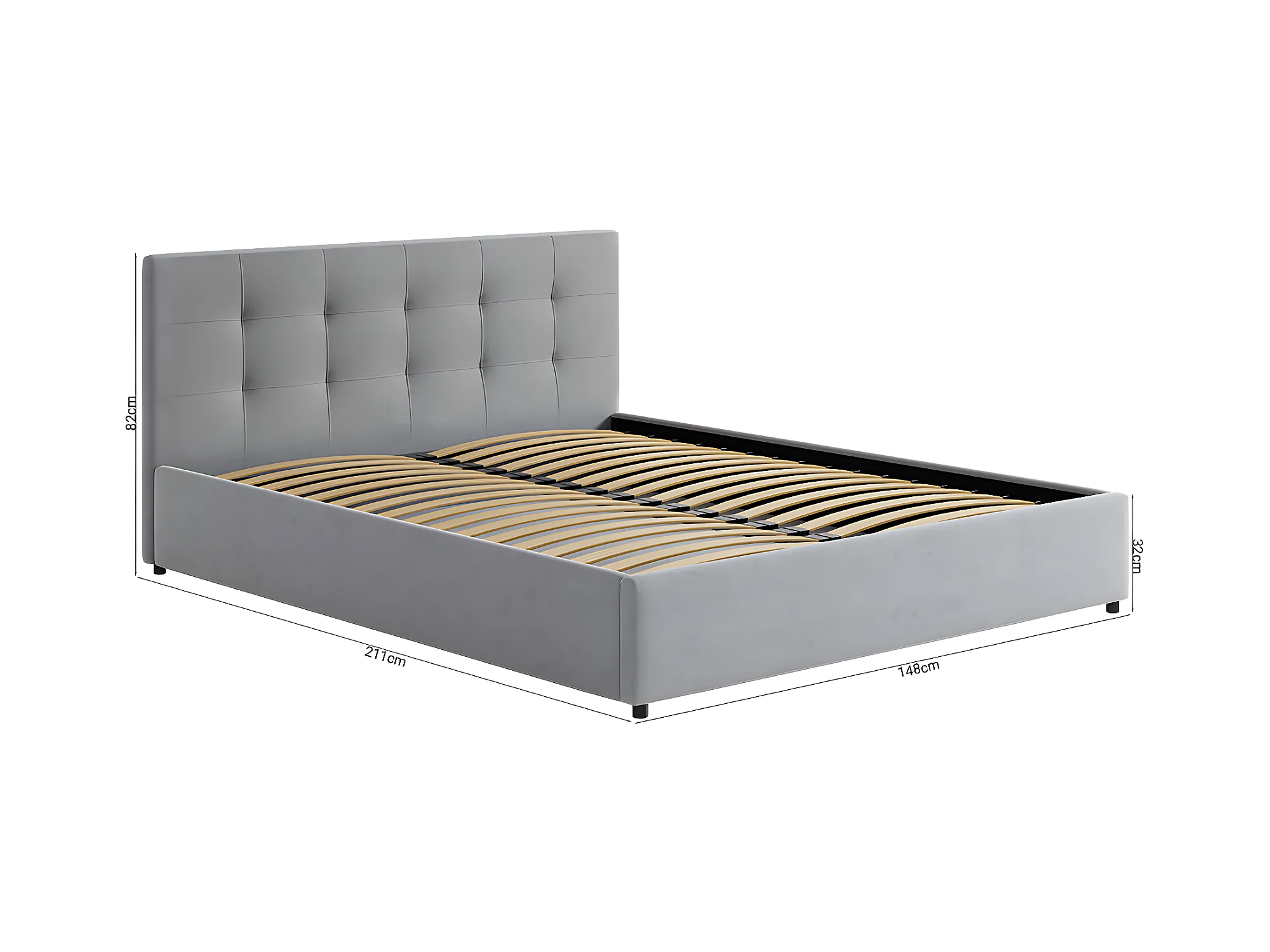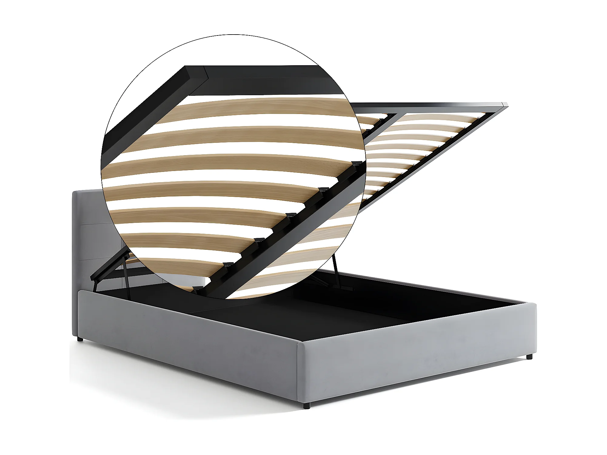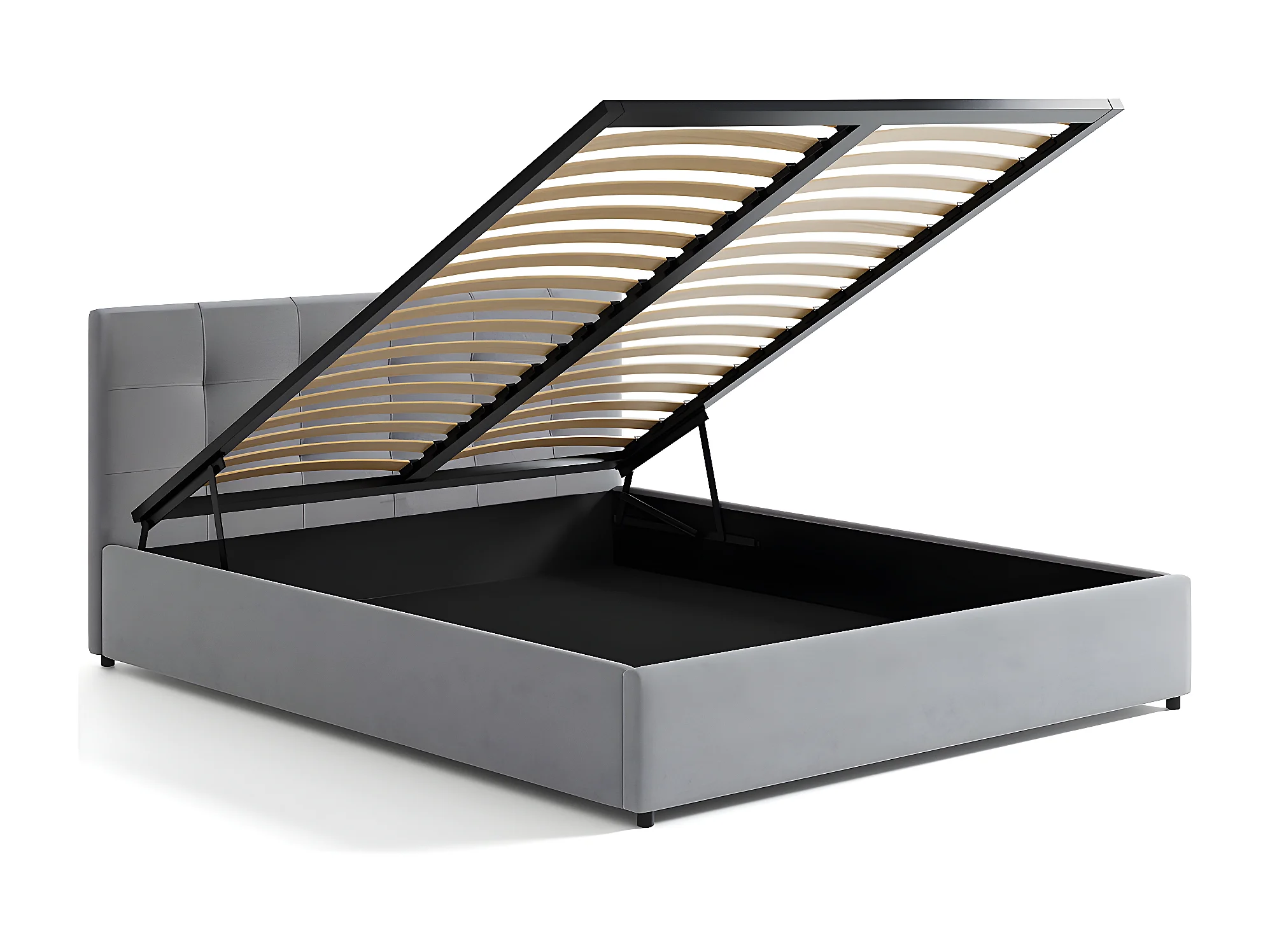 Lit tapissé 140x200 gris avec rangement et tête de lit