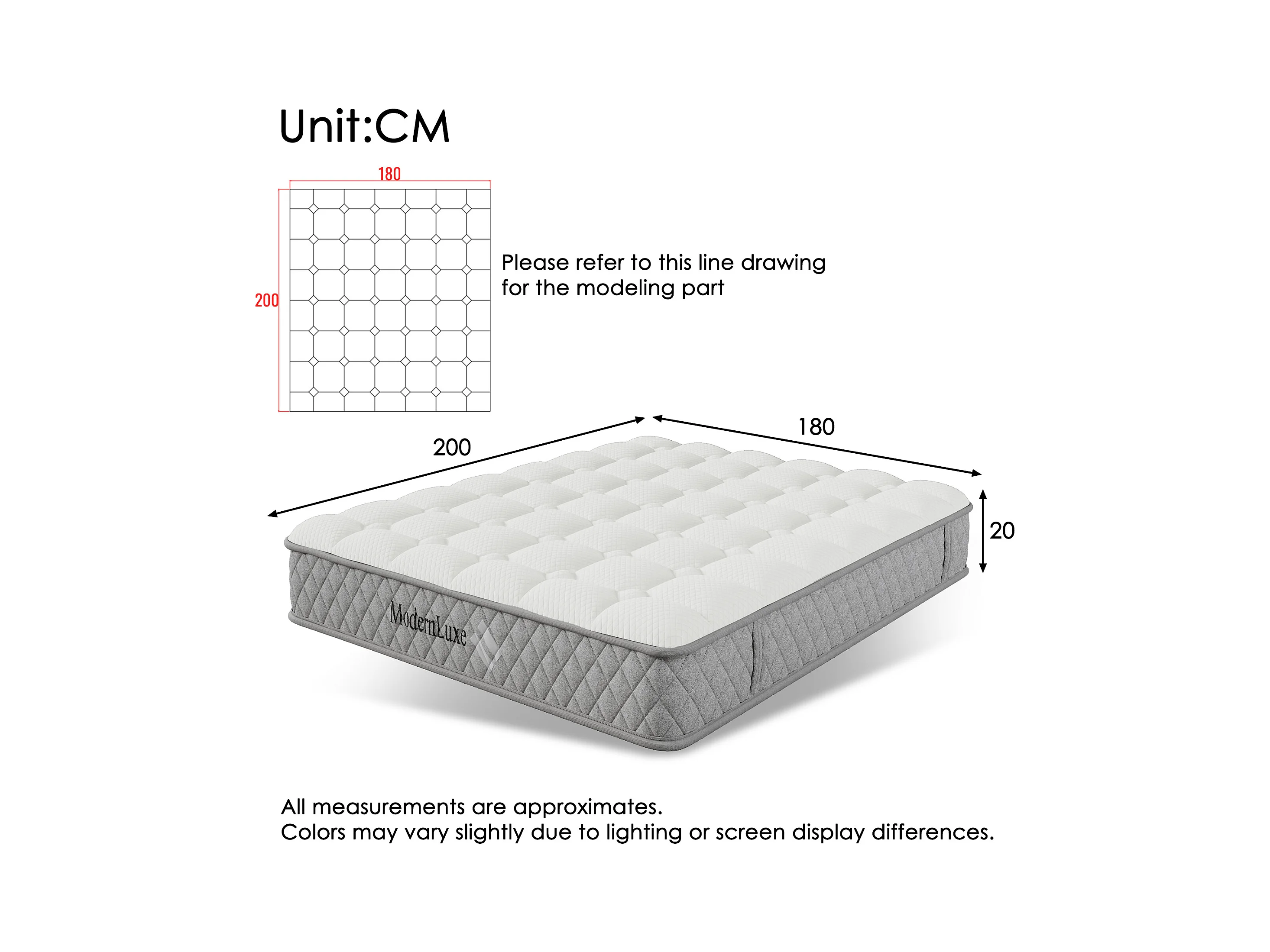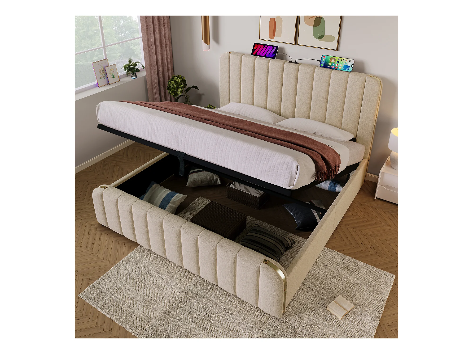 Lit tapissé 180x200 cm double, tête avec liseré doré, USB-C, hydraulique, tissu lin beige, charge 226 kg (Avec matelas)