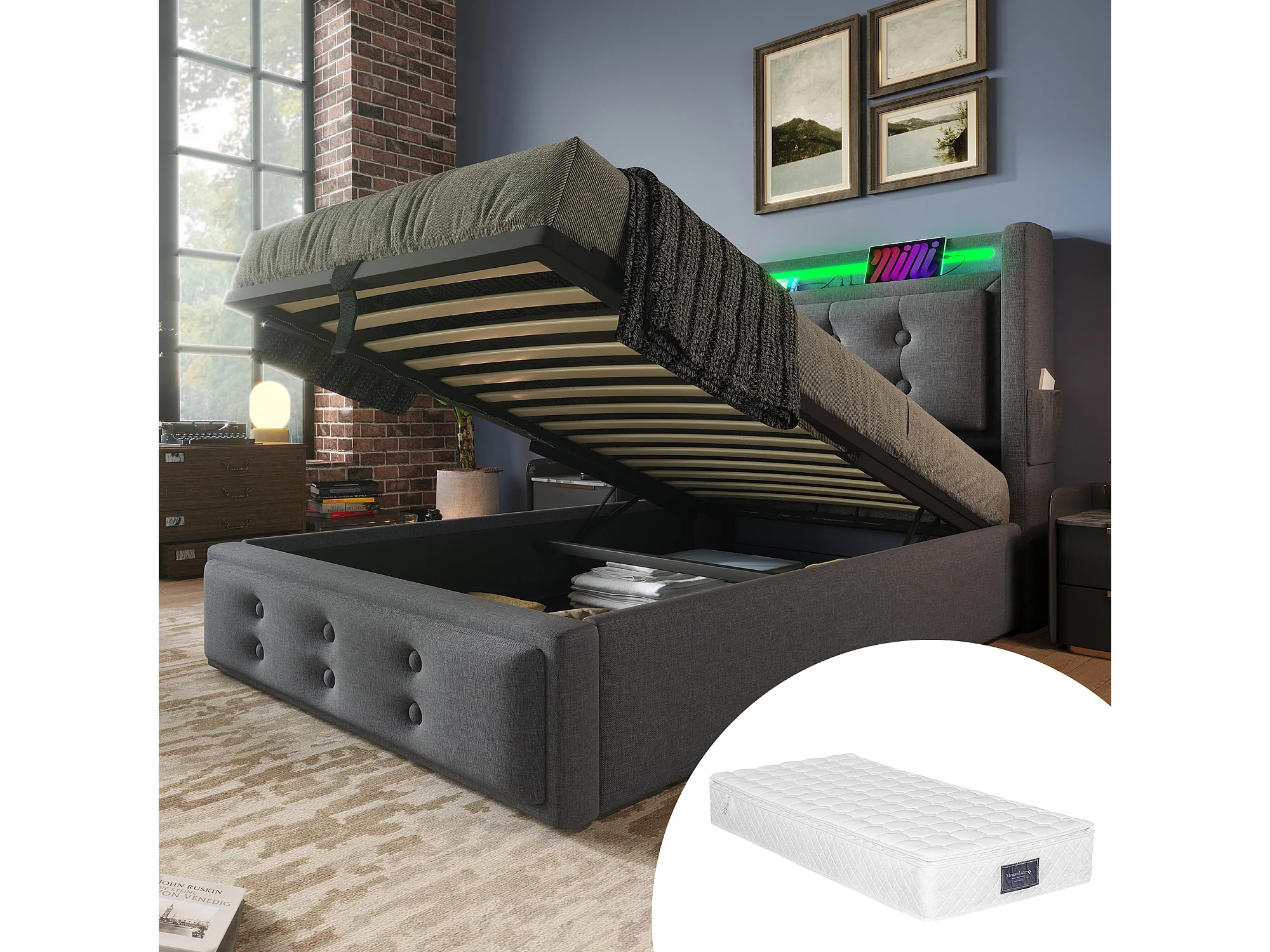 Lit tapissé 90x200 cm simple, LED tête, USB-C, hydraulique, cadre bois et métal, coton gris, charge 150 kg (Avec matelas)