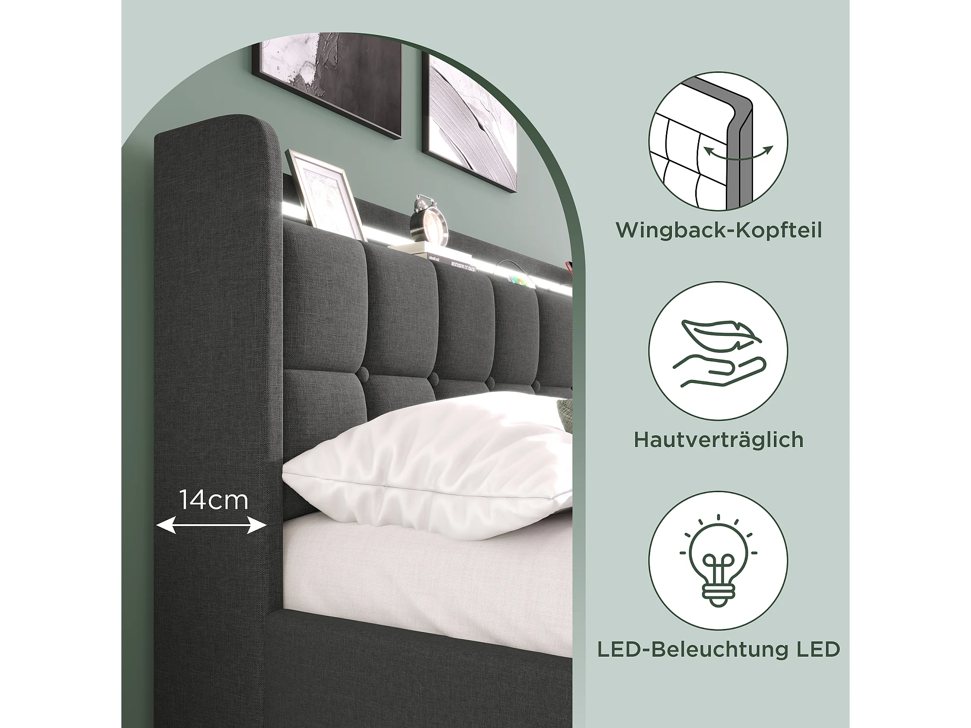 Lit tapissé LED avec recharge USB, 4 tiroirs, bois, gris (164.5x220x103.5cm)