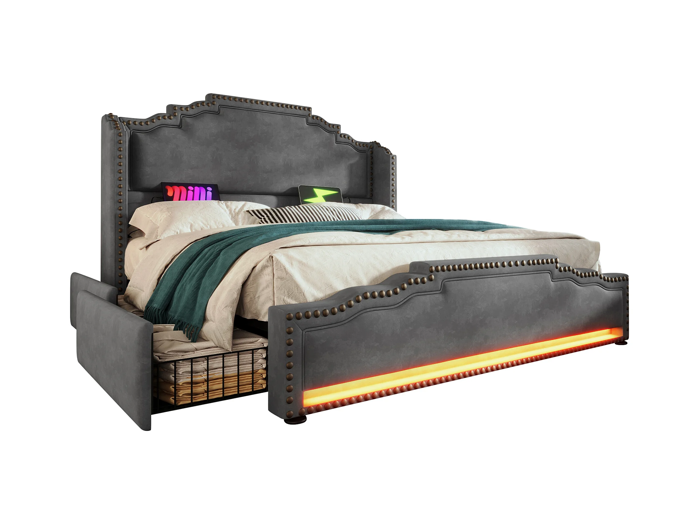 Lit tapissier double 140×200cm : 4 tiroirs, LED + prise USB-C, rangement + lit ado, lattes de support, velours, gris (sans matelas)