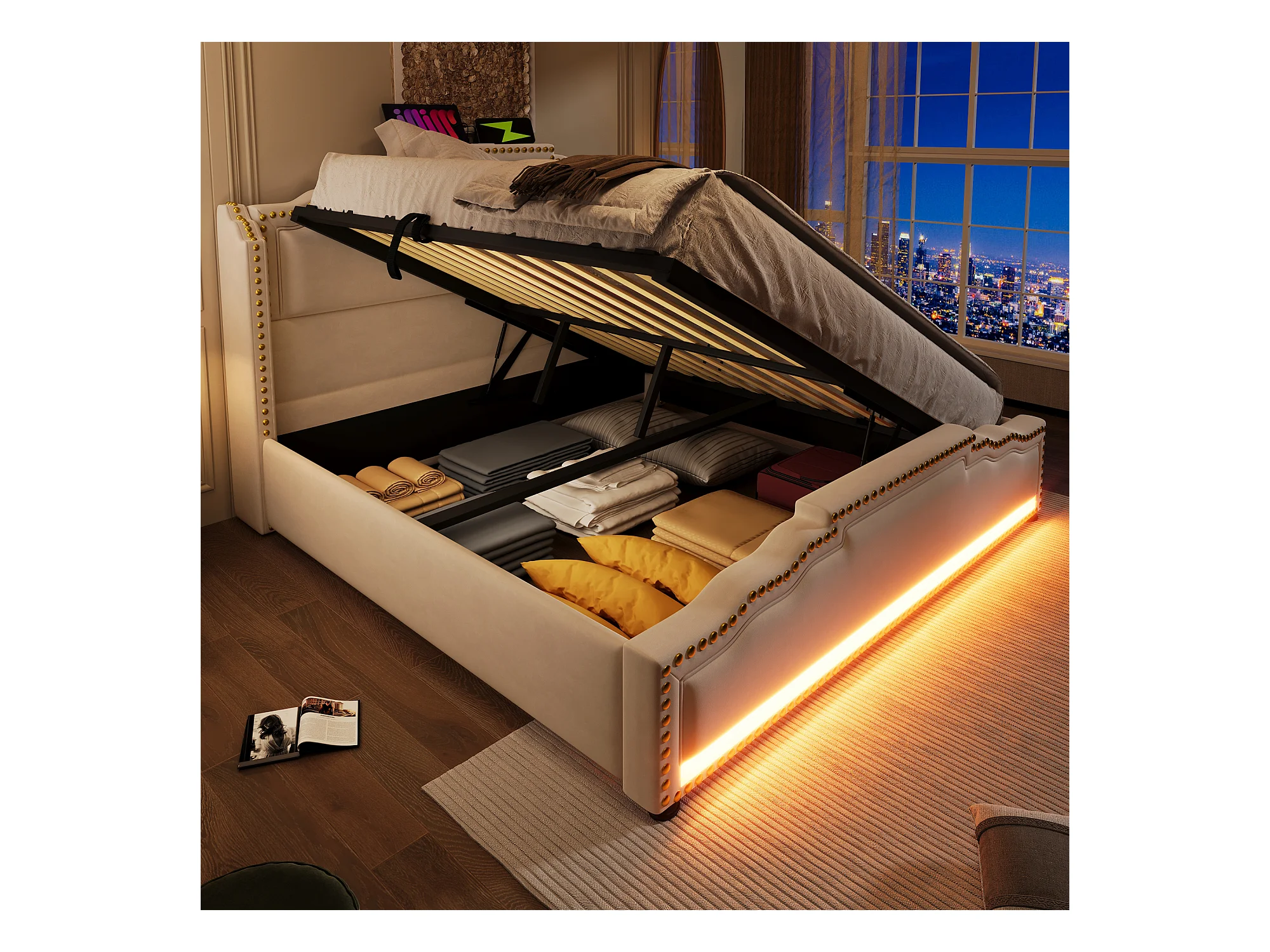 Lit tapissier double 160×200cm : rangement hydraulique, LED + prise USB-C, lit à rangement + lit ado, lattes de support, velours, beige (sans matelas)