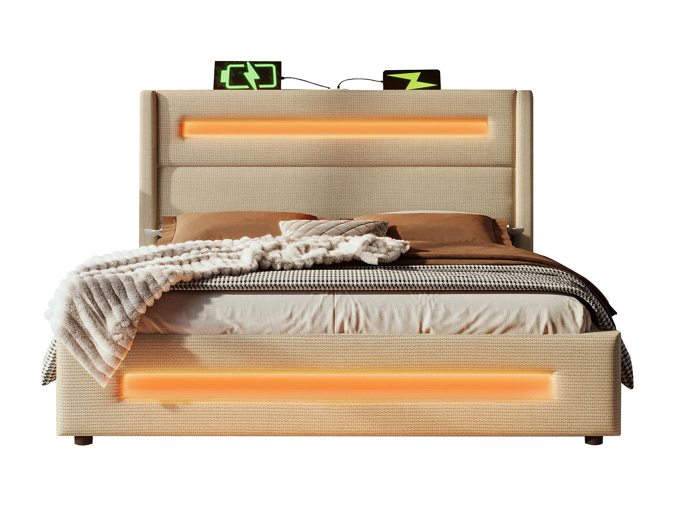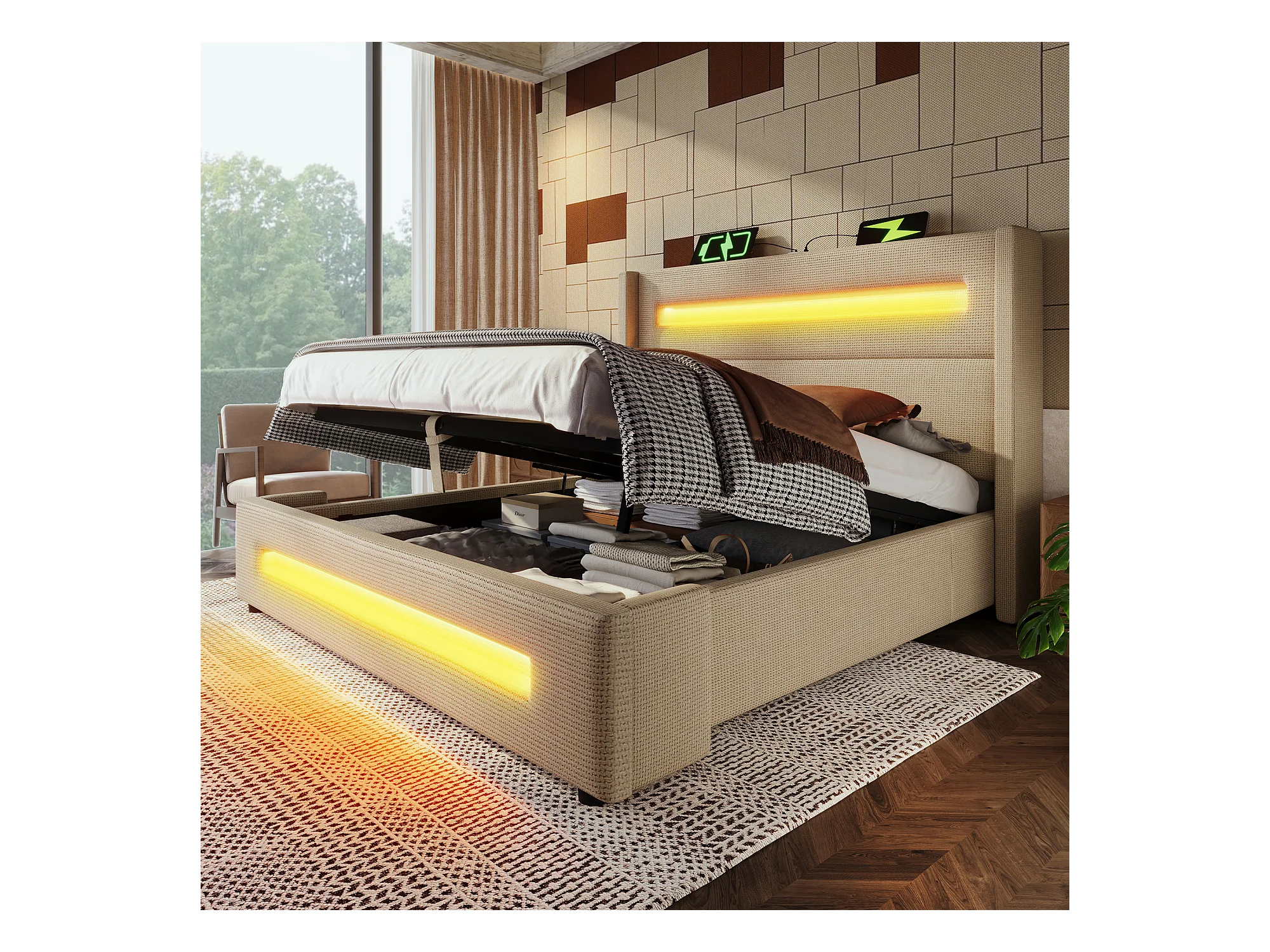 Lit tapissier double ado 140×200cm : LED, rangement hydraulique + USB Type-C, cadre métal + lattes bois, beige, lin (sans matelas)