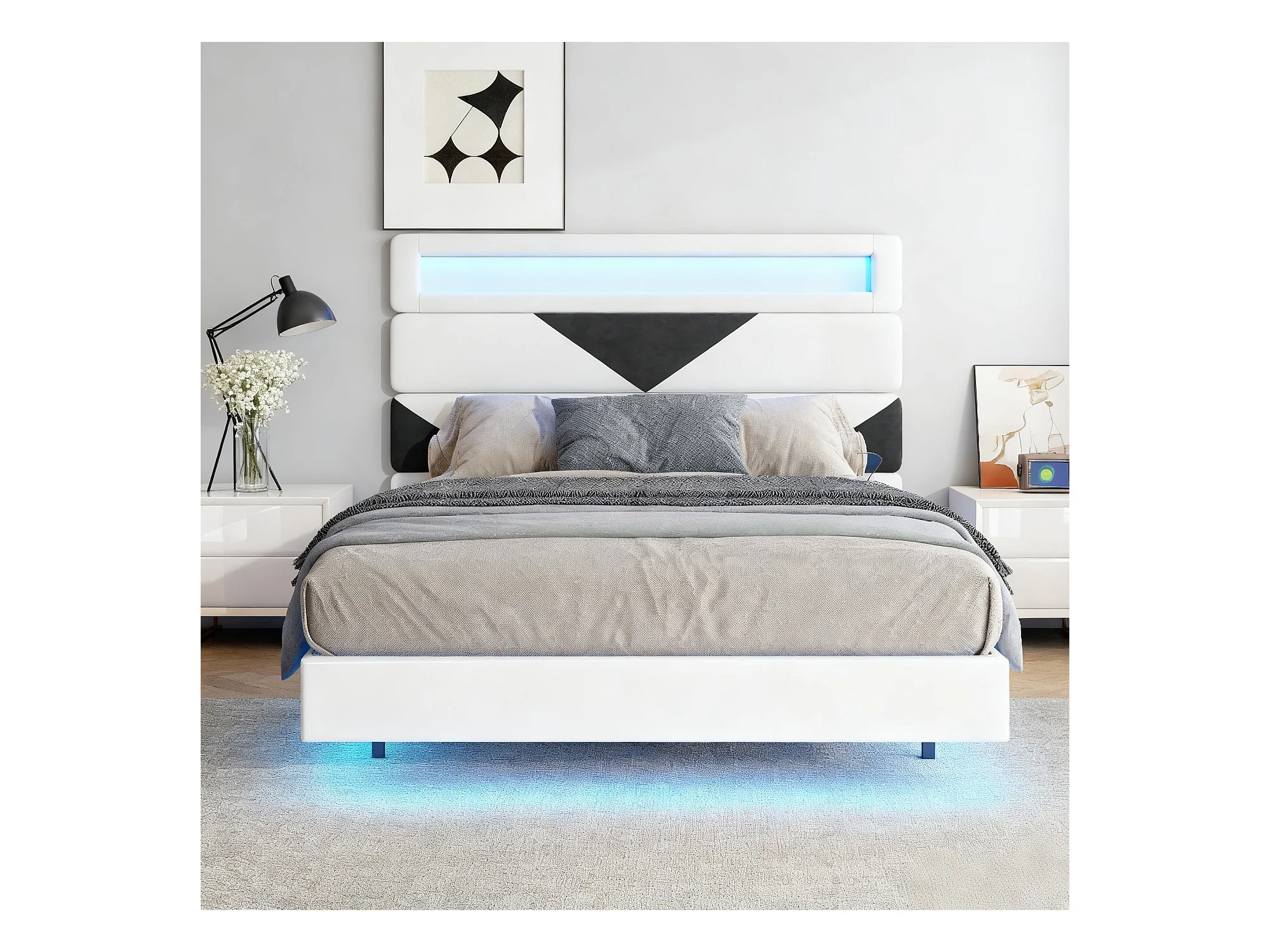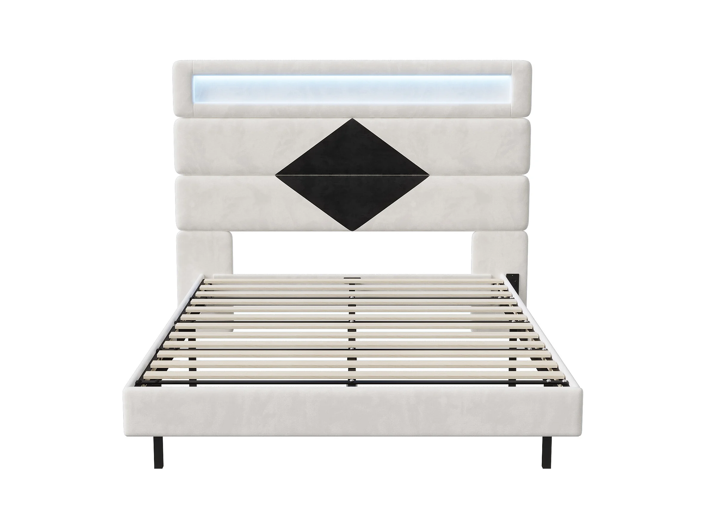 Lit triangle 160x200 cm avec LED et USB - lit adulte 160x200 cm - cadre de lit double 160x200 cm avec sommier à lattes - tissu en  velours - blanc cassé et noir