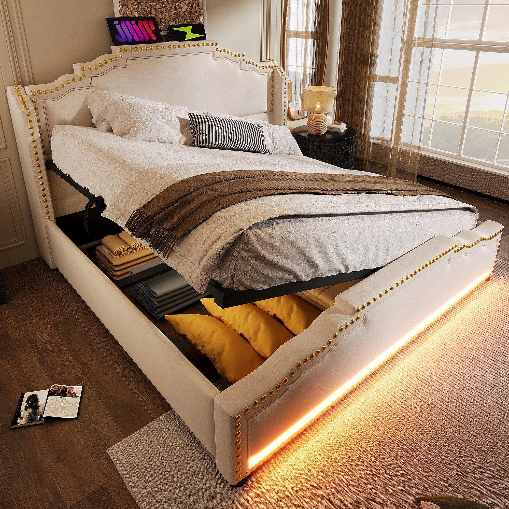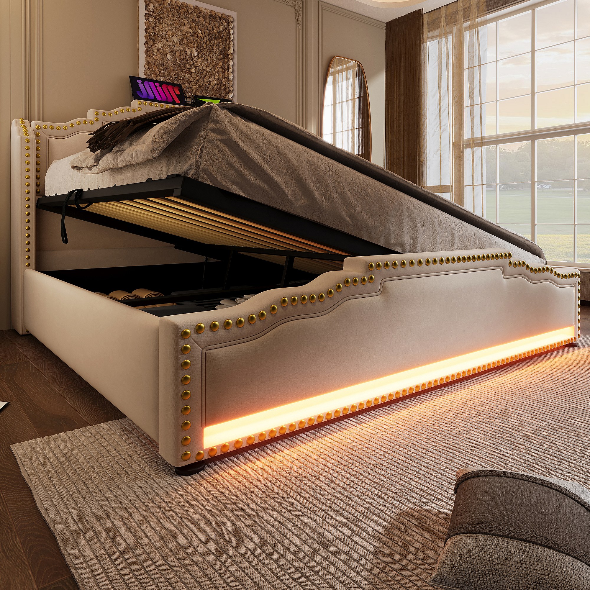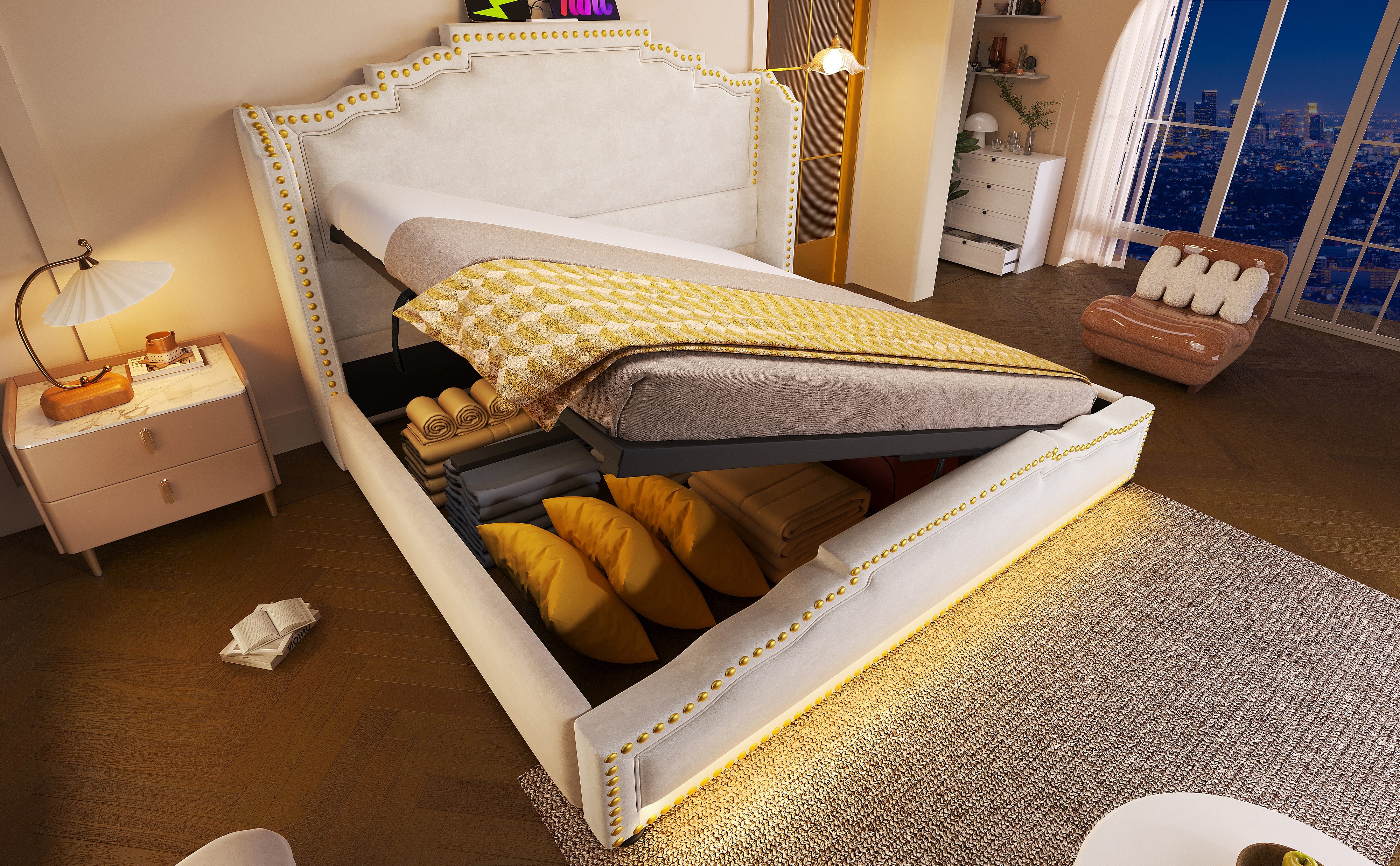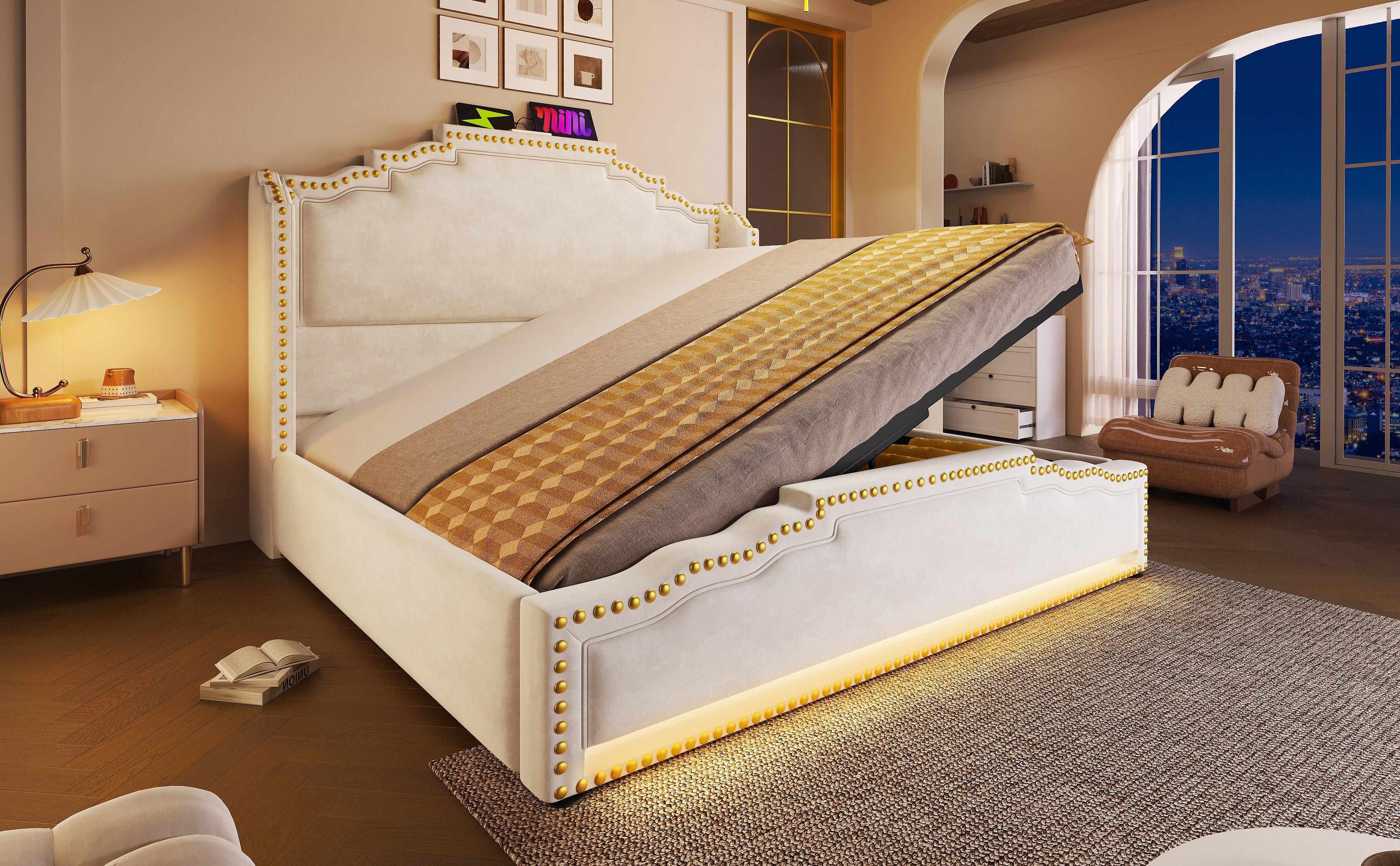 Lit vintage 160x200 cm en velours beige avec rangement hydraulique et éclairage LED