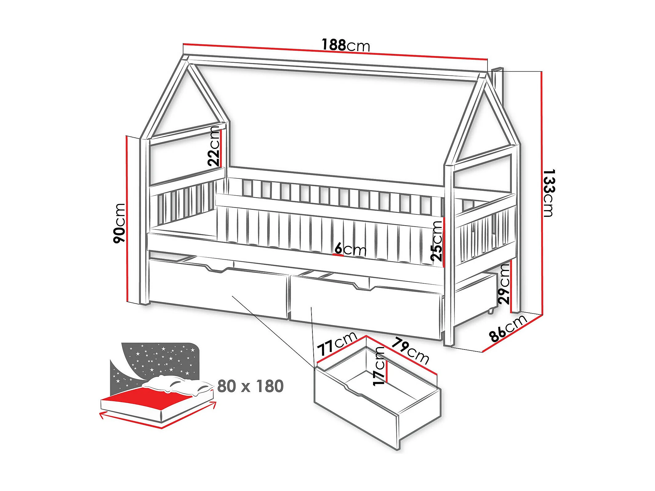 Lit Vista 116, Unique, Blanc, 80x180, Bois, Disponible, 86x188x133cm