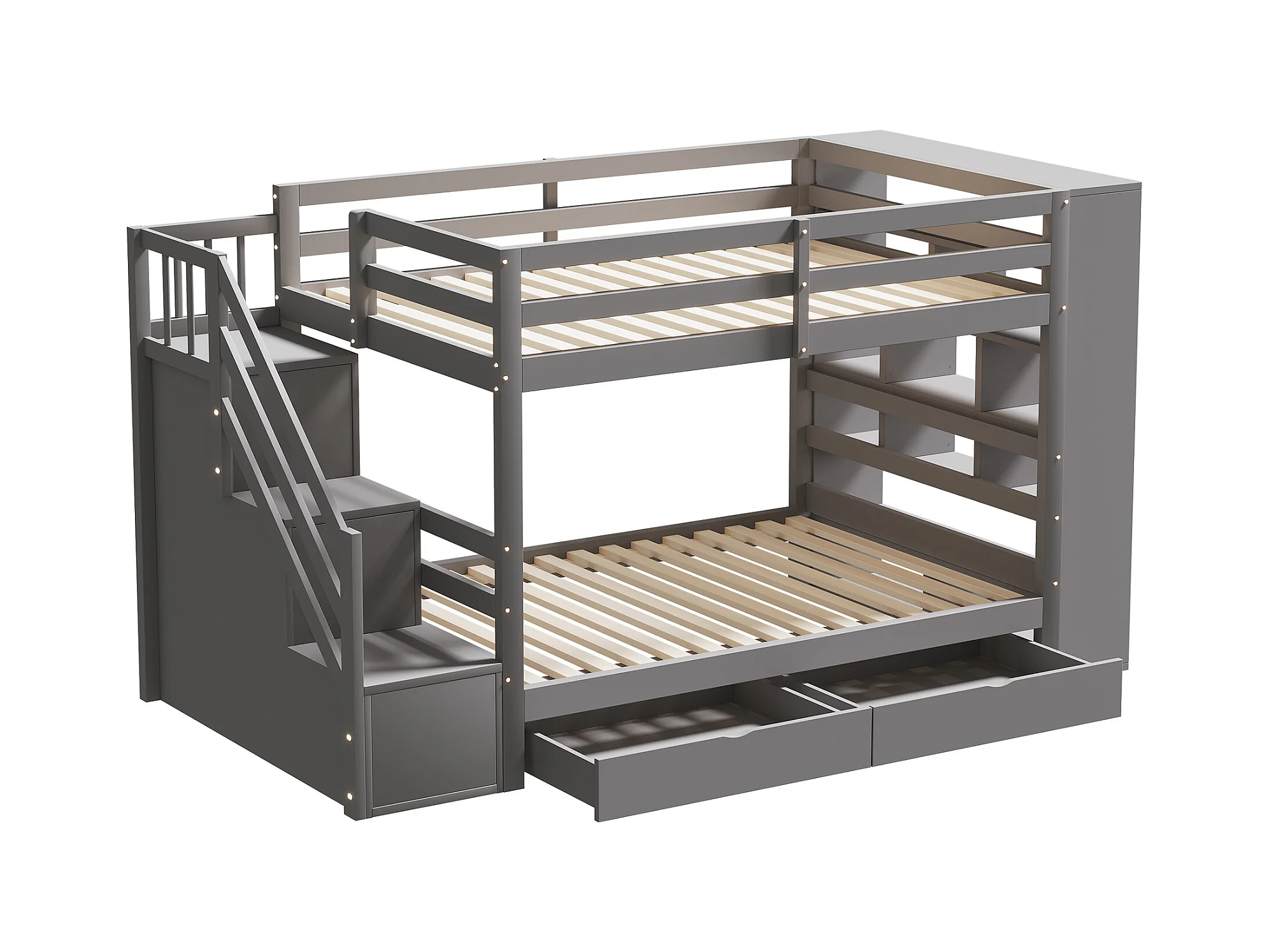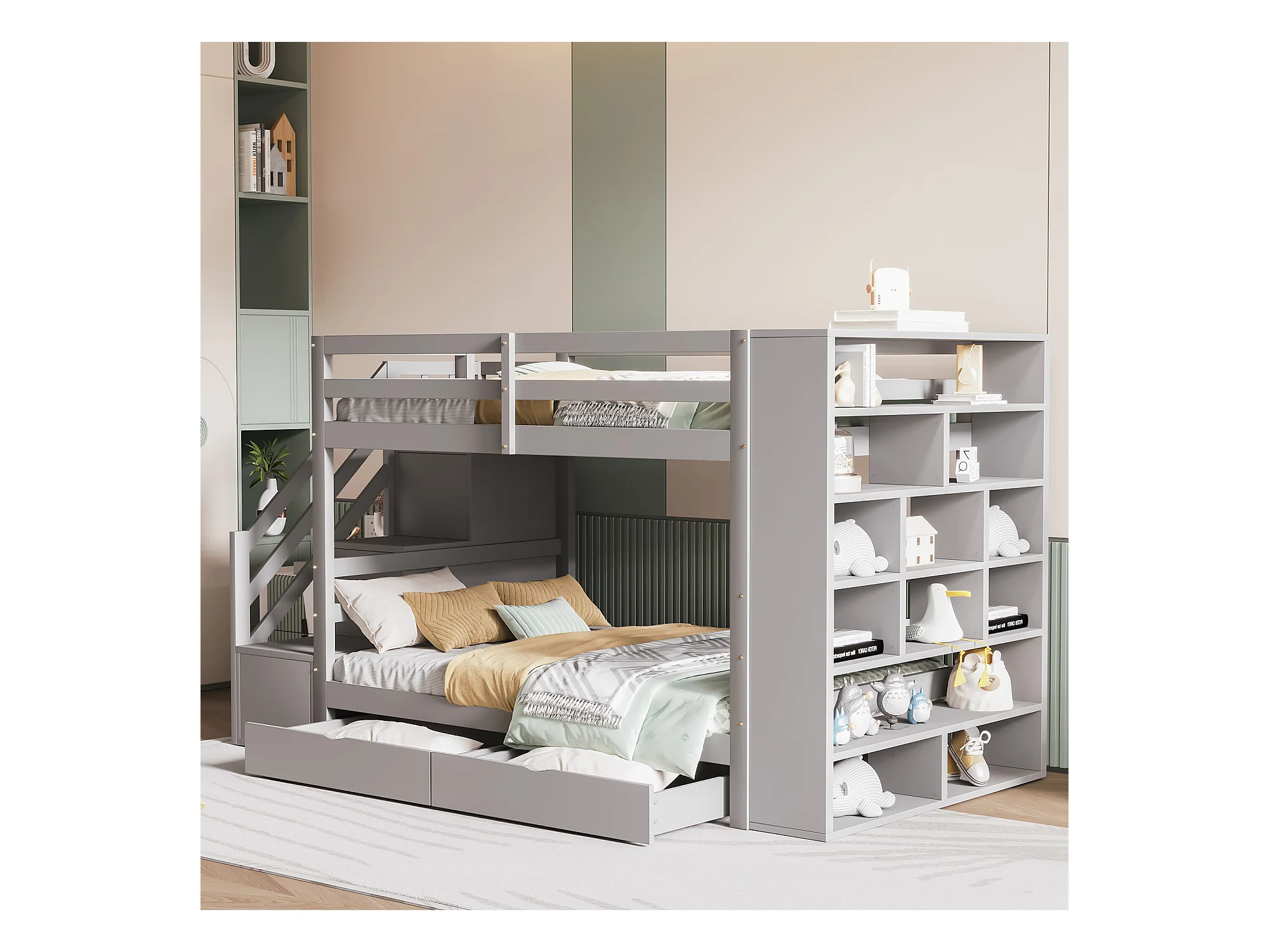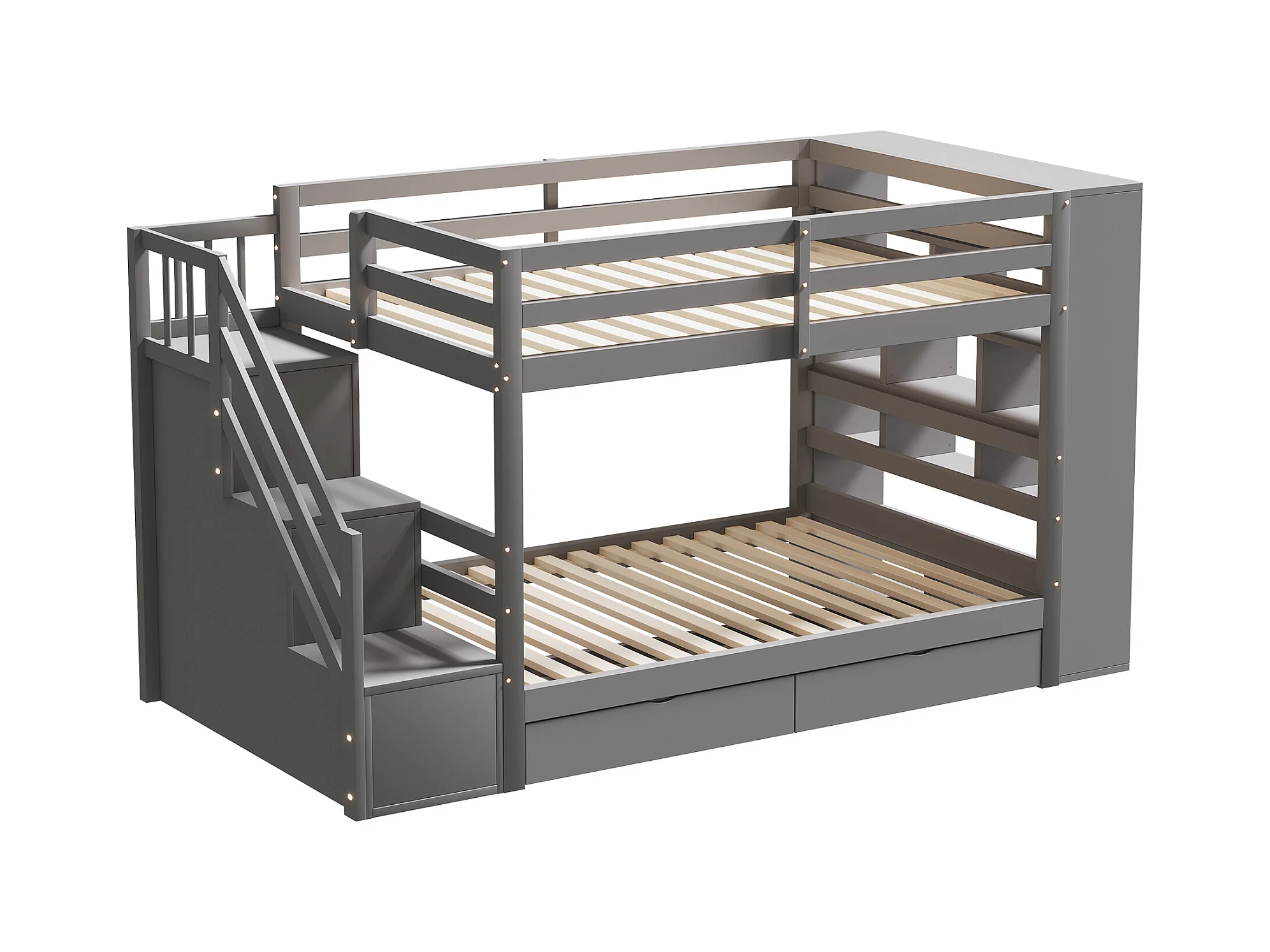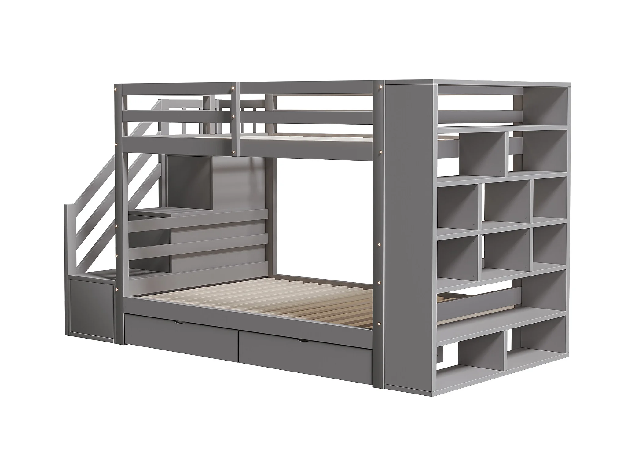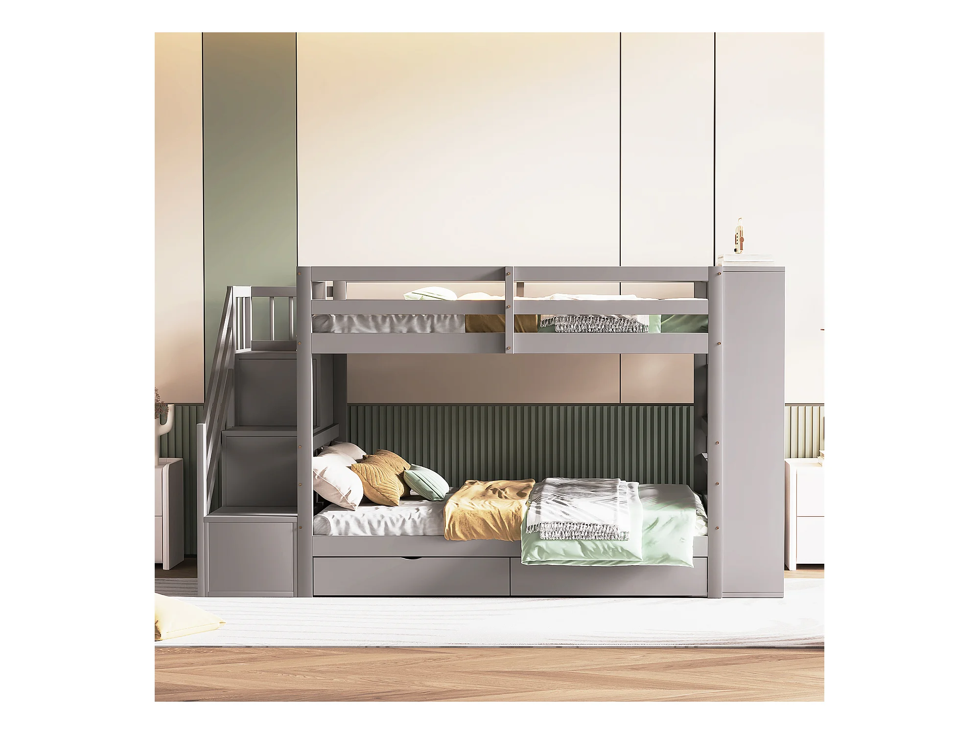 Lits superposés 2 x 90 x 200 cm avec 2 tiroirs et grands casiers & escalier - bois de pin + MDF - gris (sans matelas)