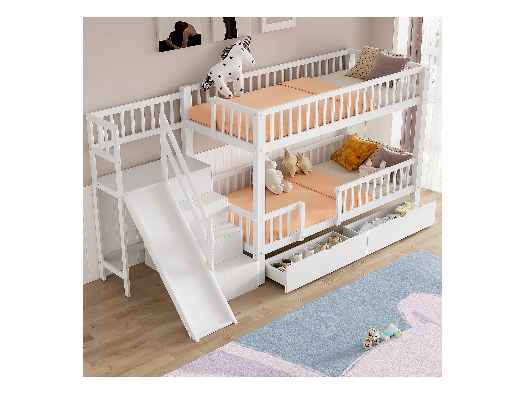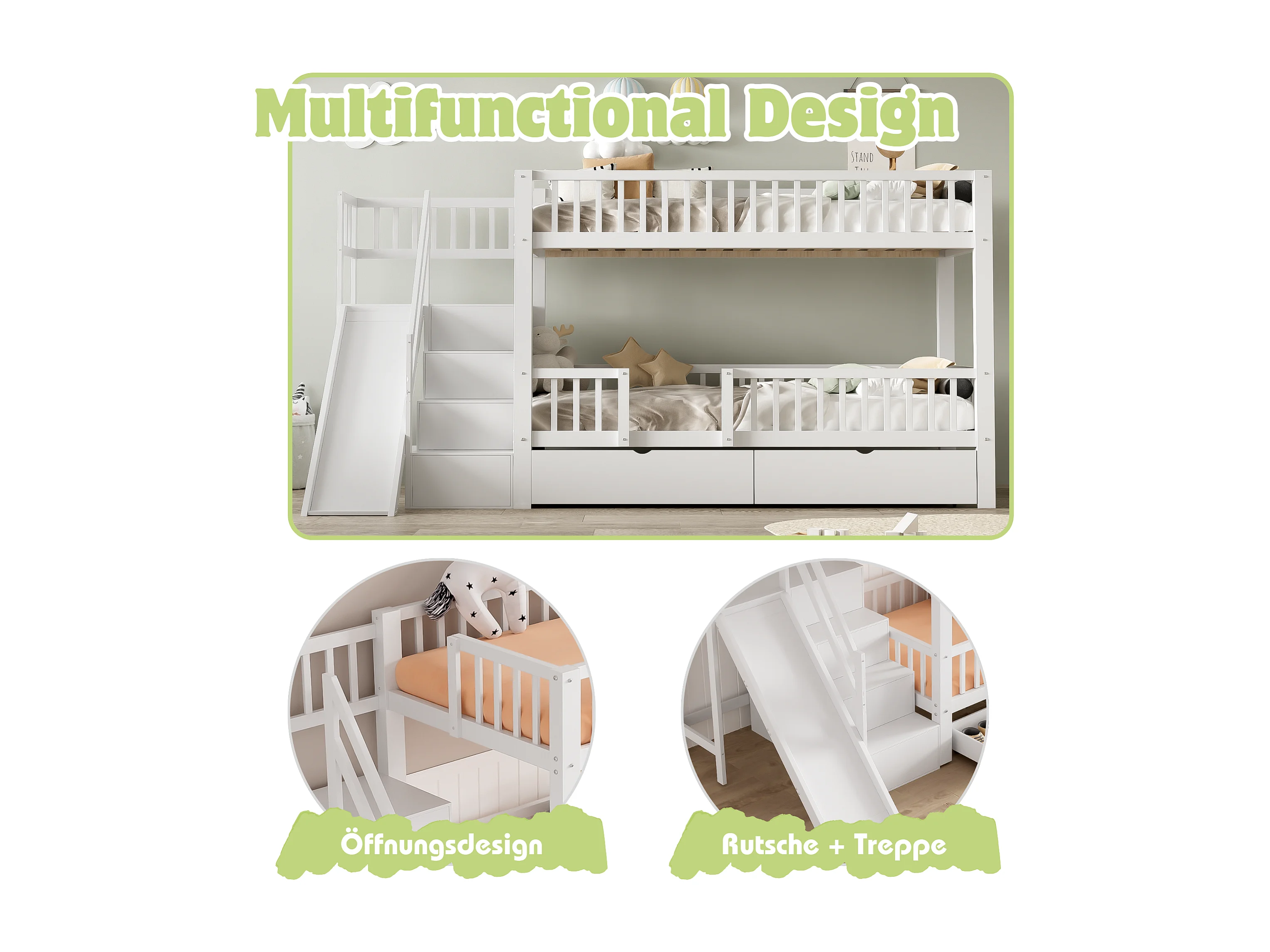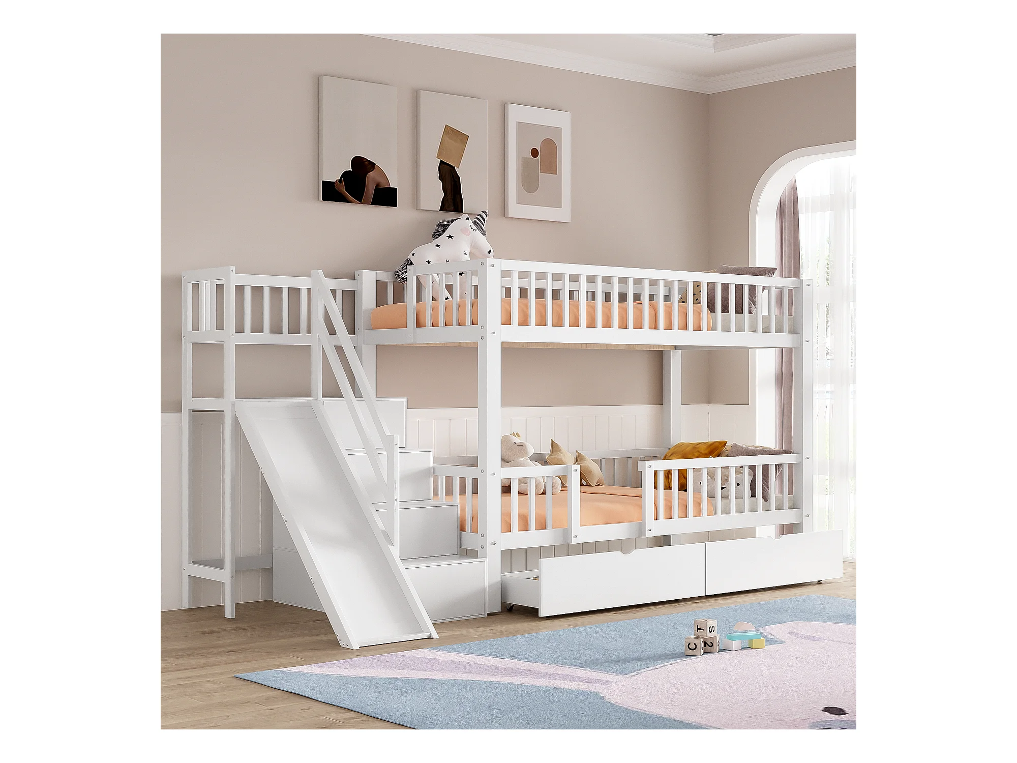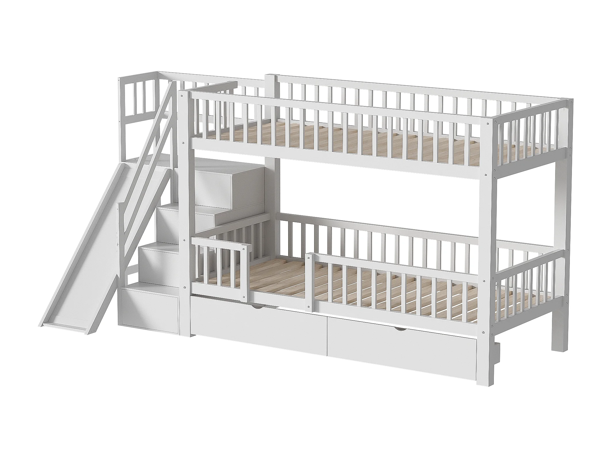 Lits superposés 2 x 90 x 200 cm avec 2 tiroirs et toboggan - bois massif - blanc