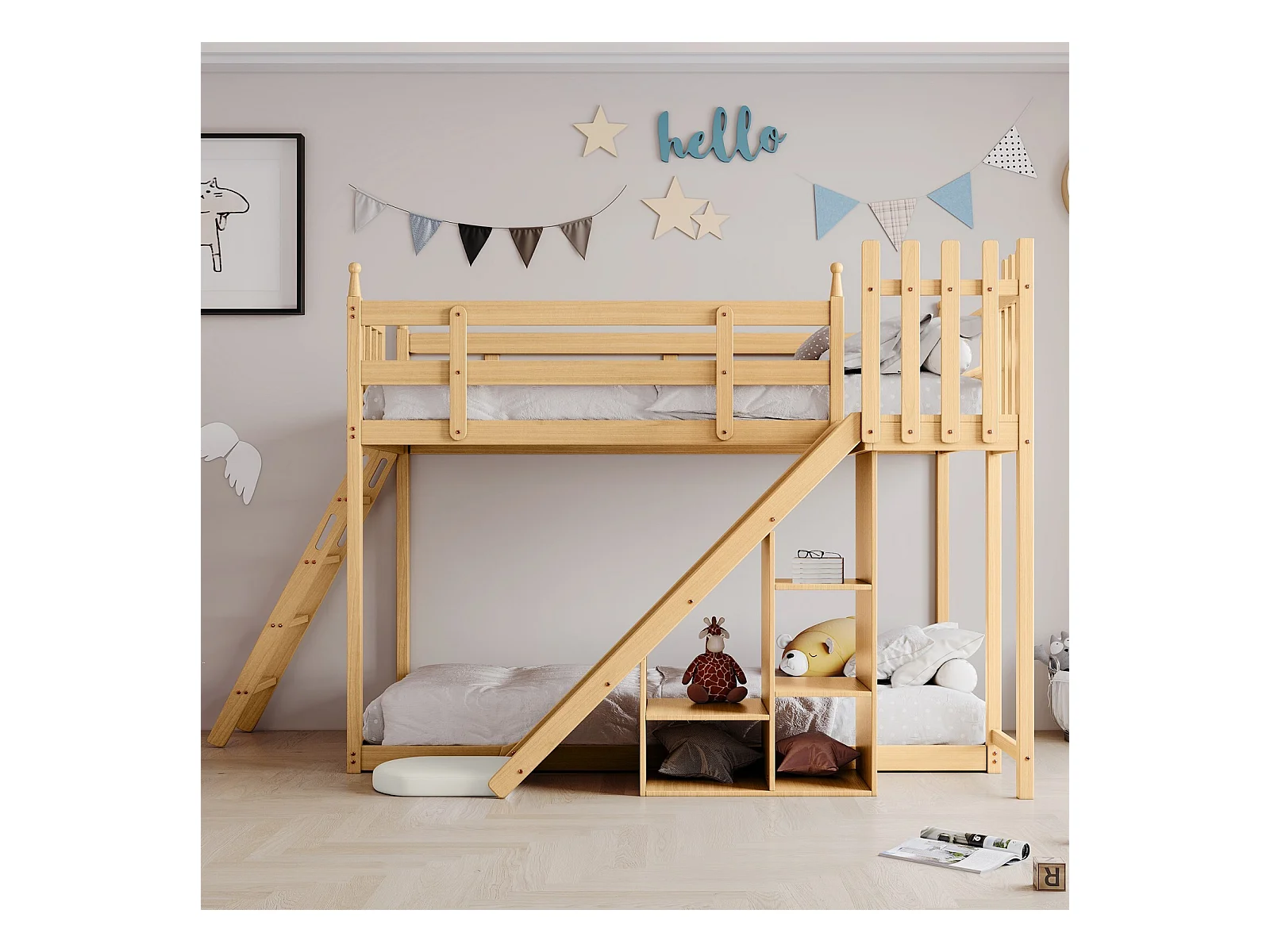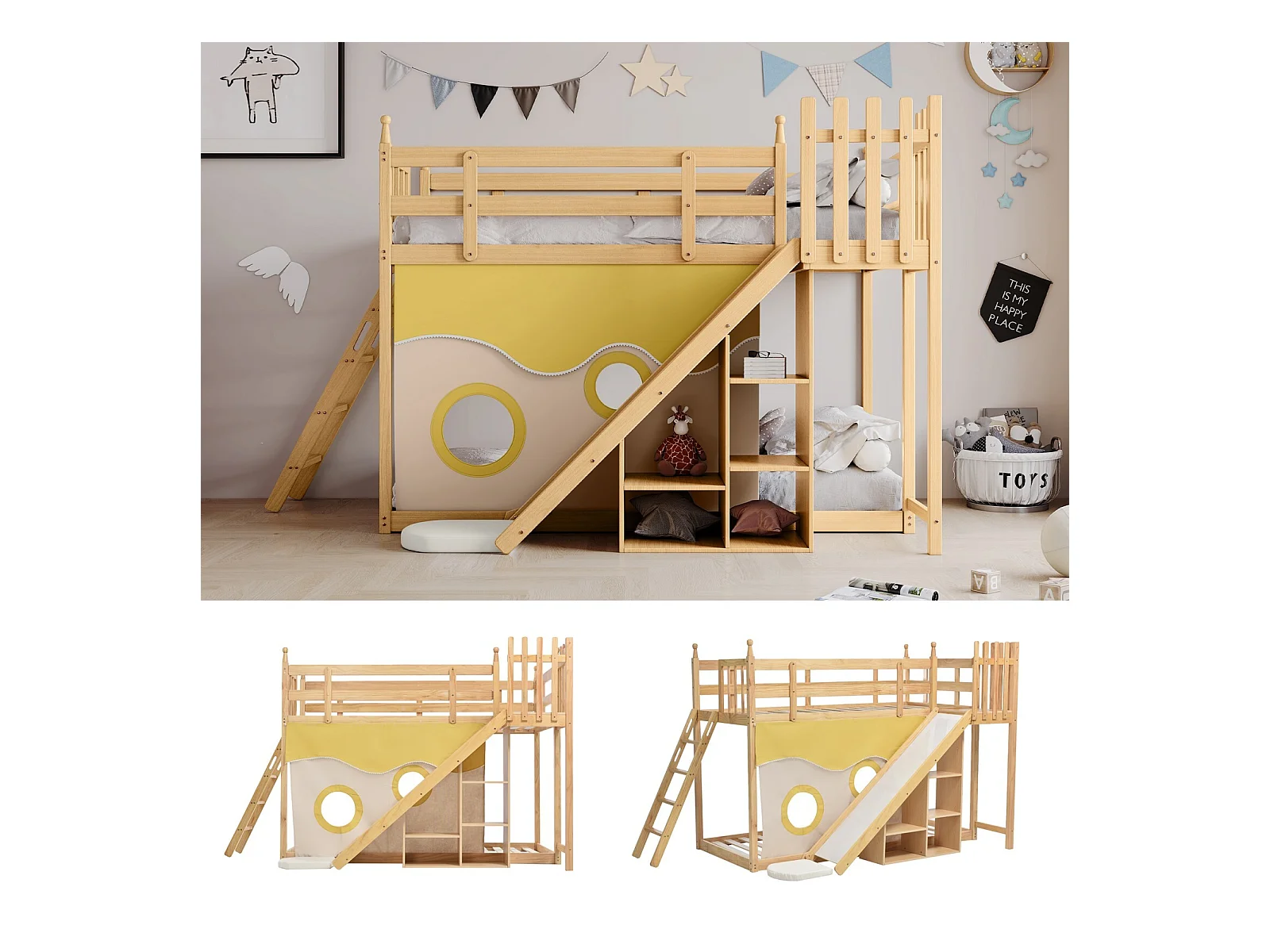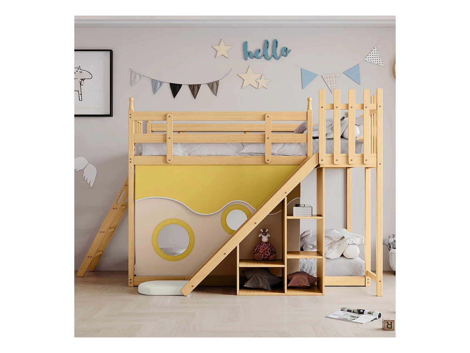Lits superposés 2 x 90 x 200 cm avec rangements, escaliers, clôtures, rideau, toboggan - cadre en pin - Naturel et blanc