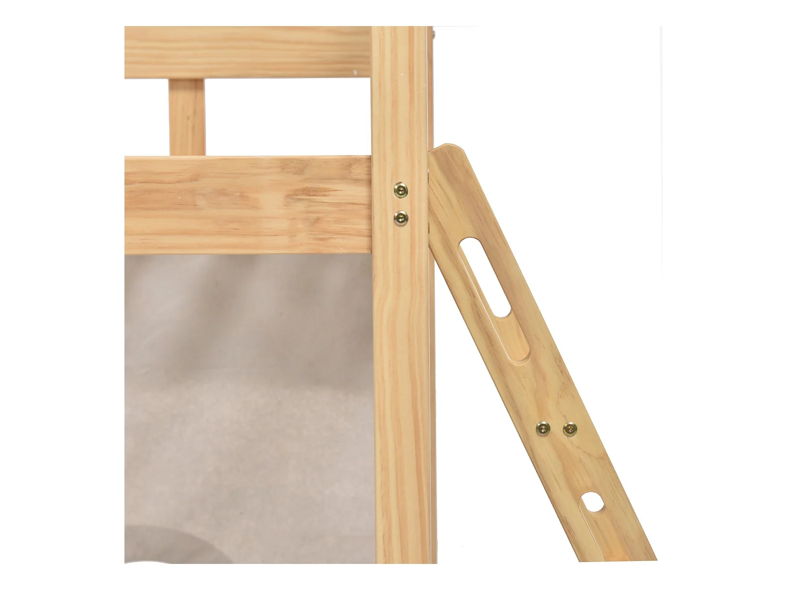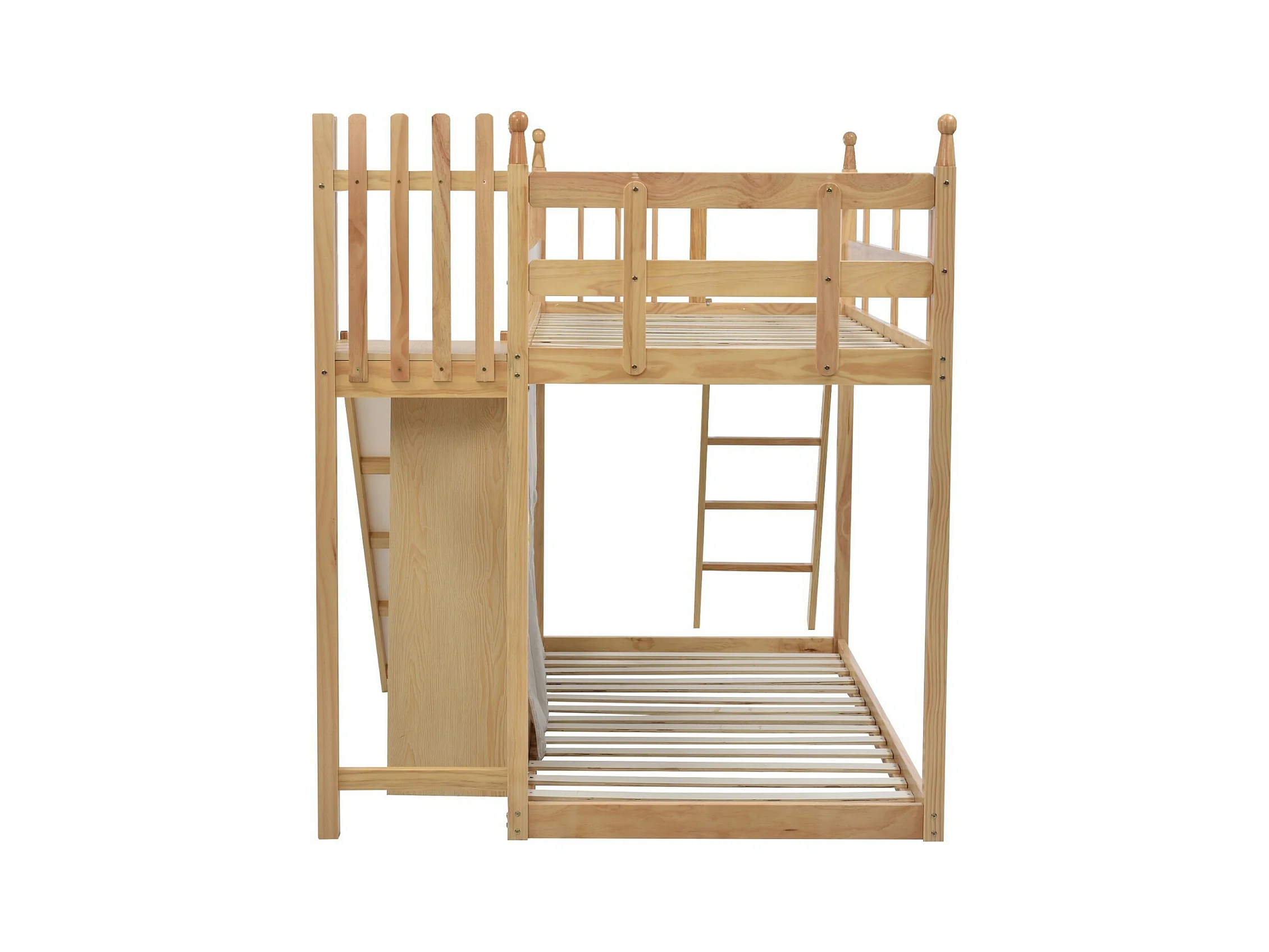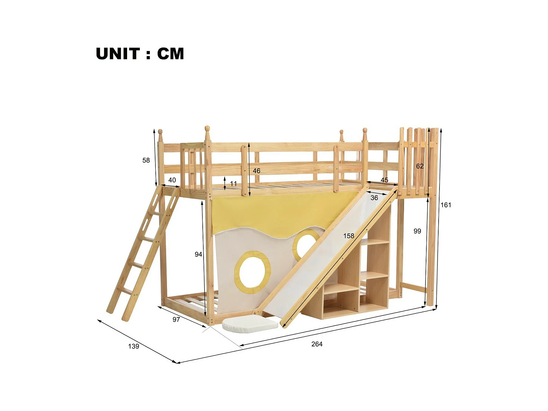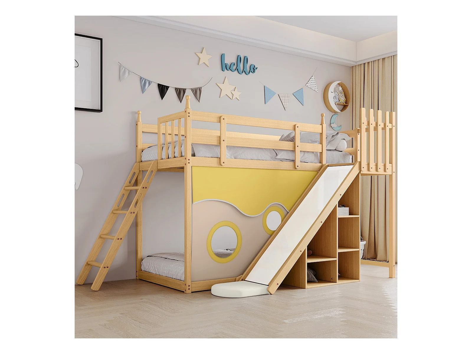 Lits superposés 2 x 90 x 200 cm avec rangements, escaliers, clôtures, rideau, toboggan - cadre en pin - Naturel et blanc