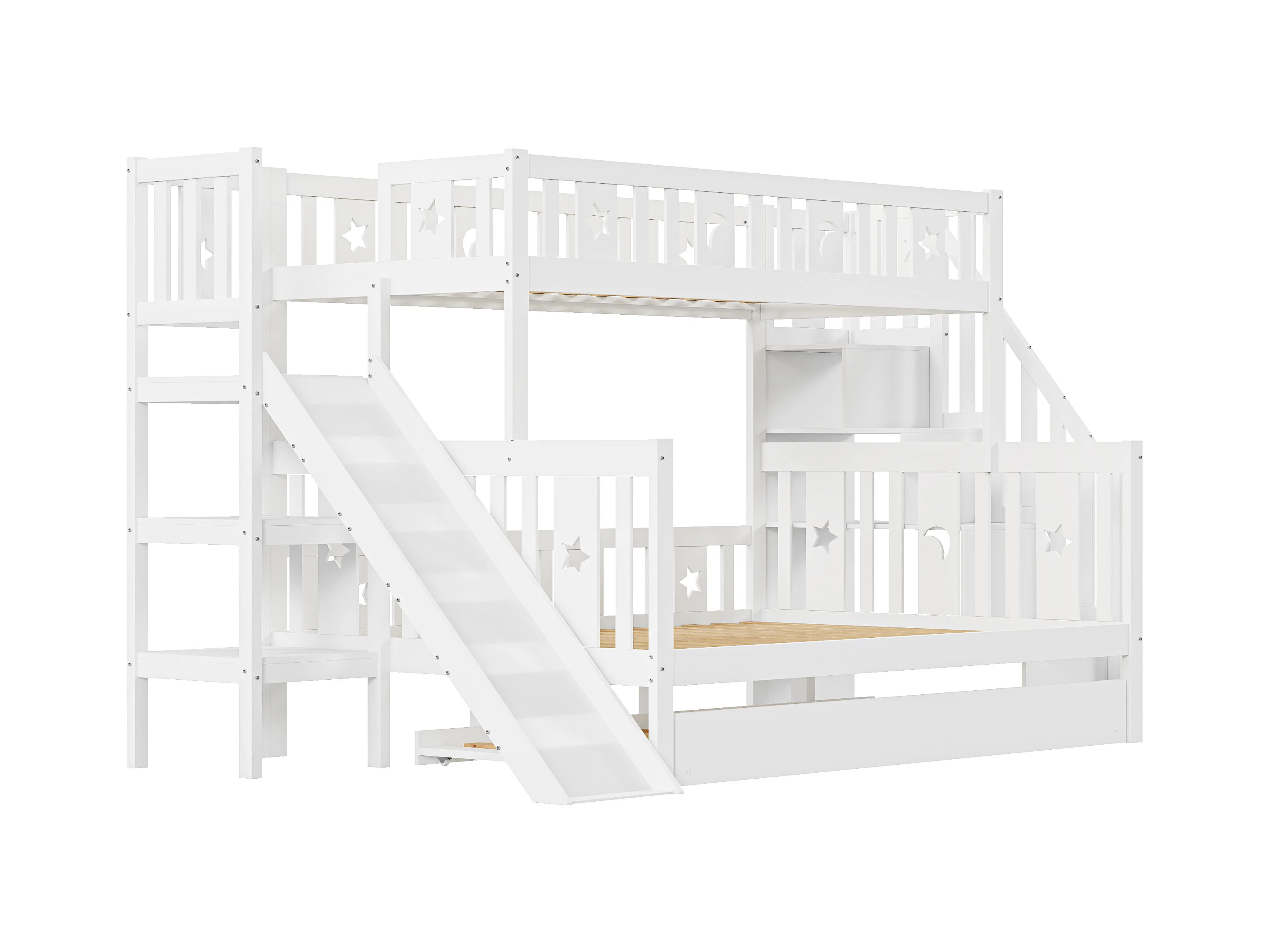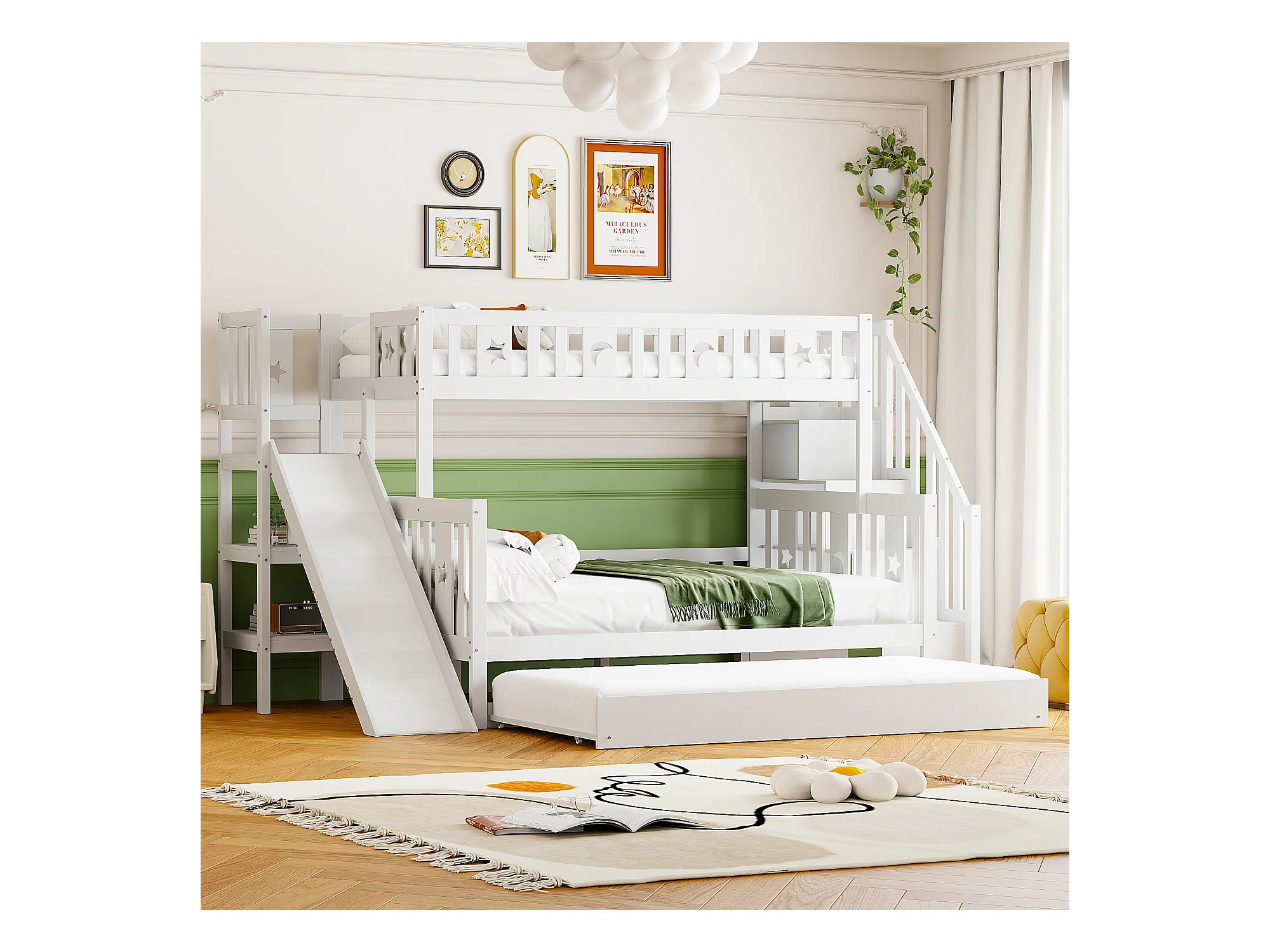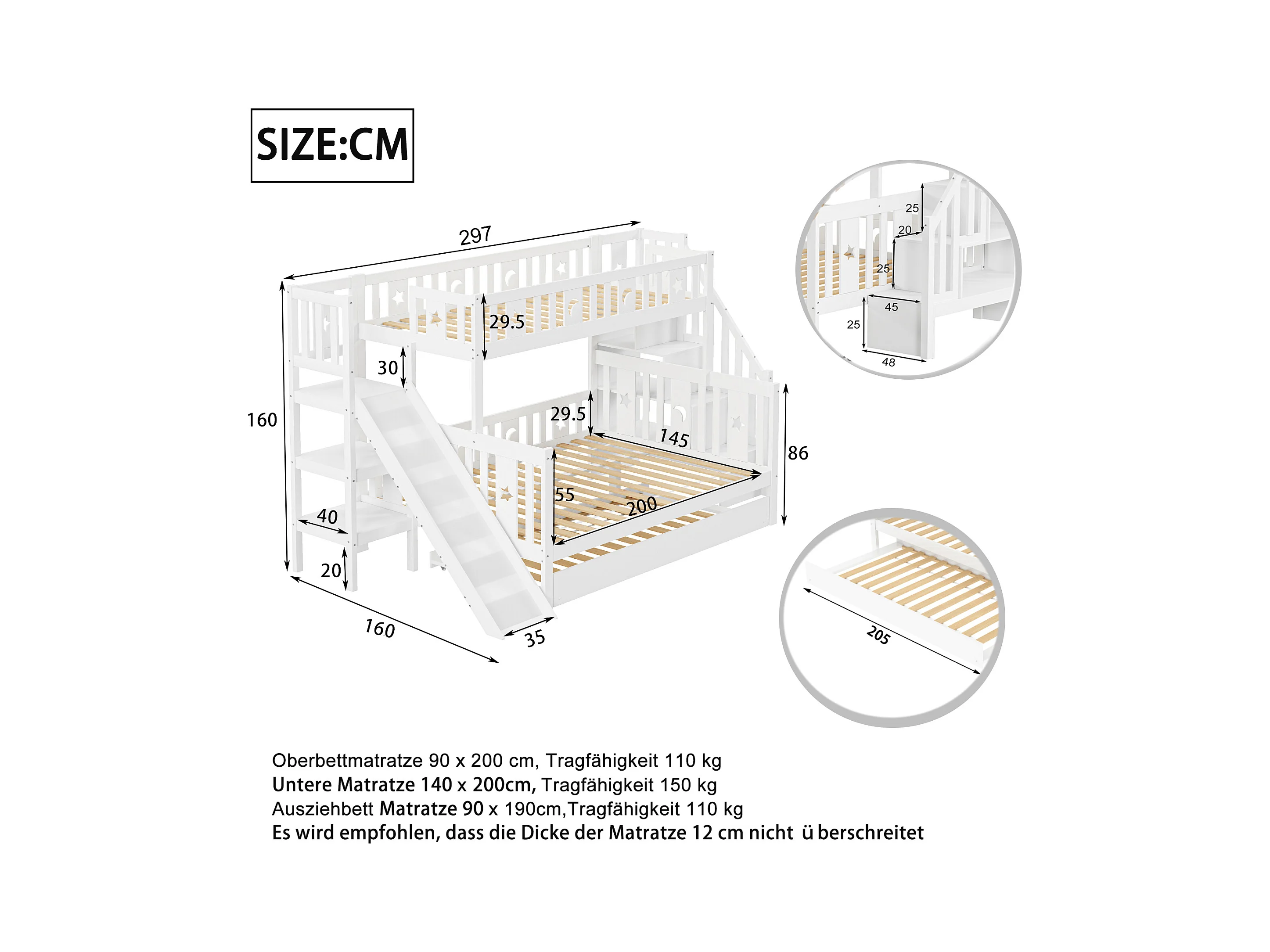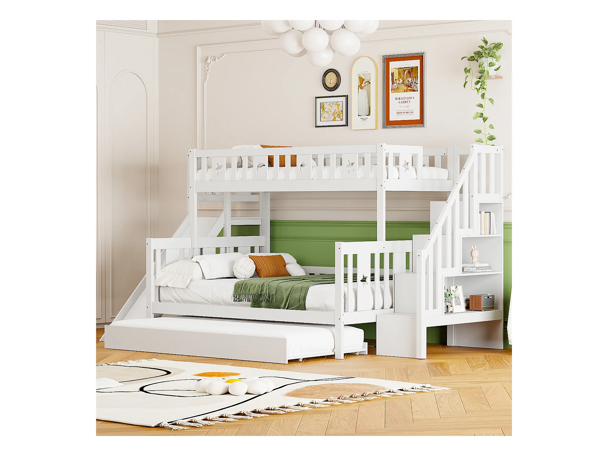 Lits superposés avec toboggan et étagères, lit gigogne - 2 x 90 x 200 cm + 140 x 200 cm - Blanc - ANTHONY
