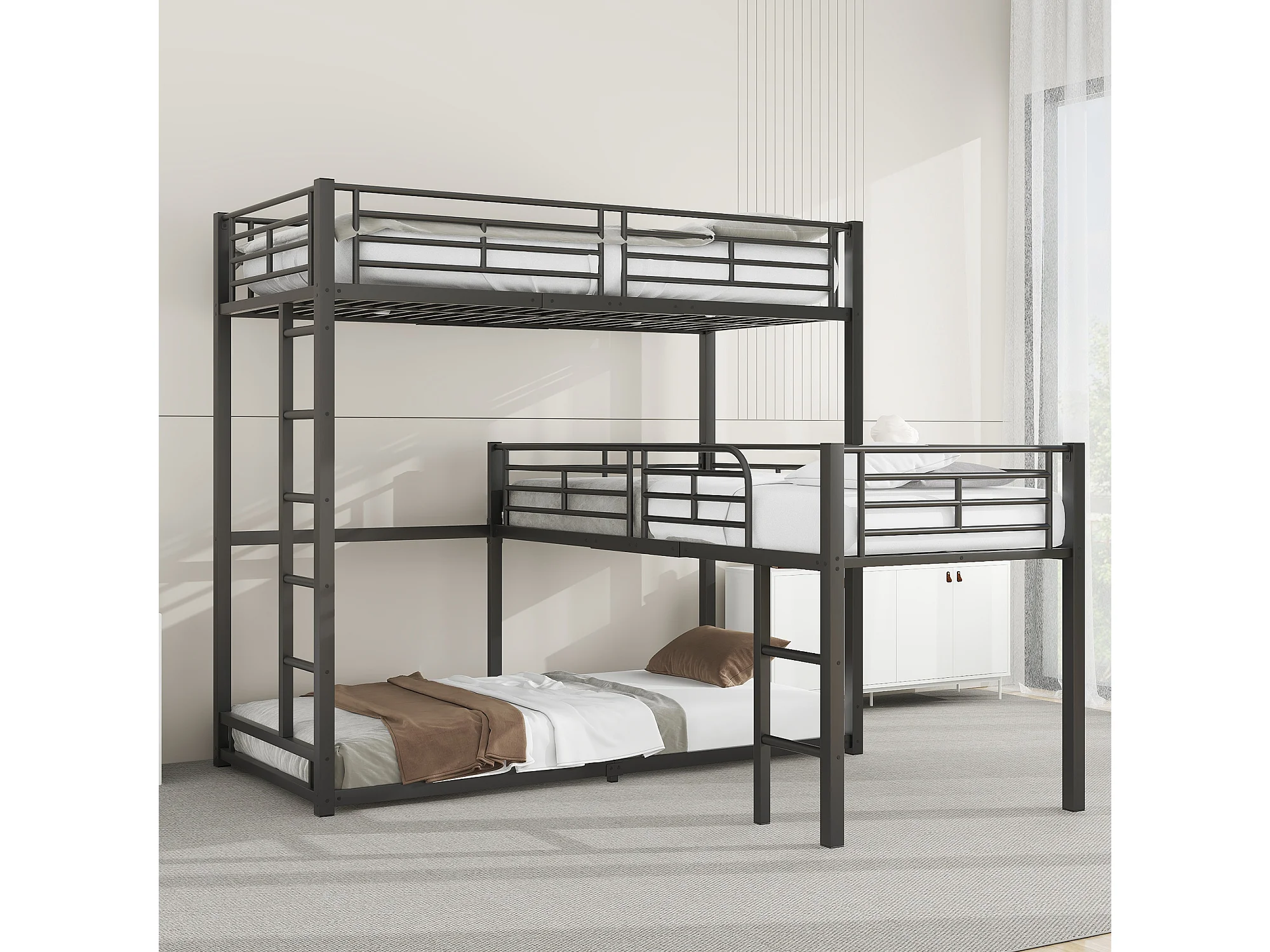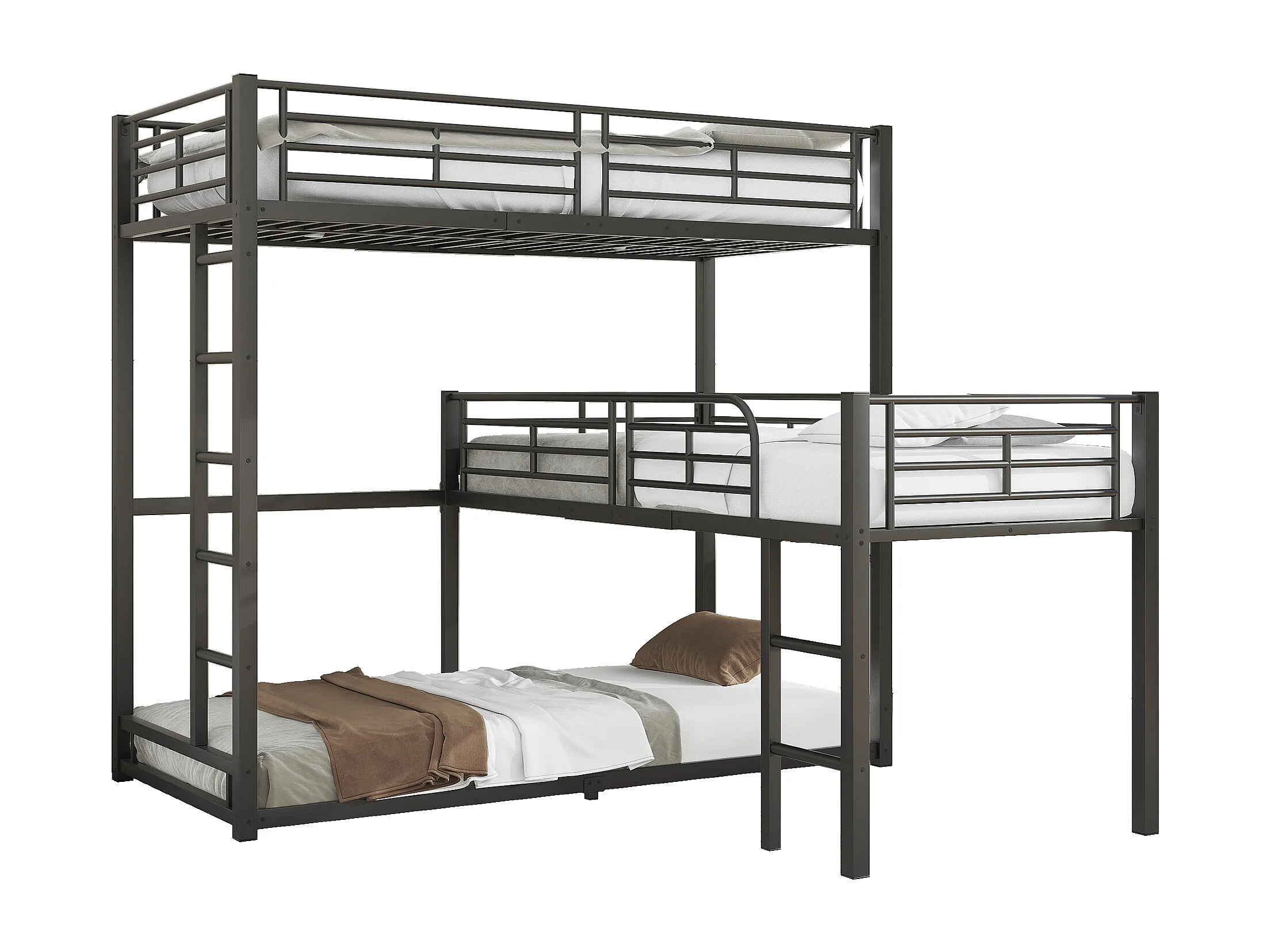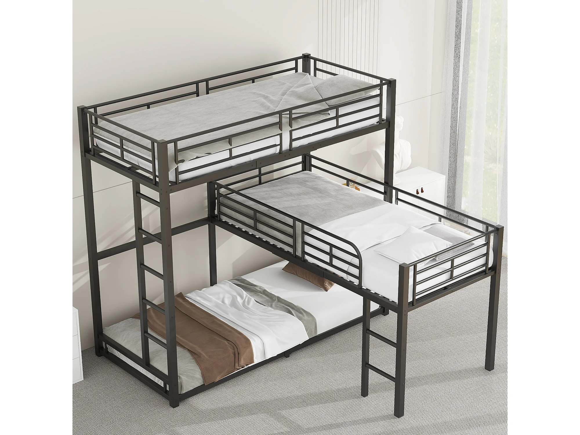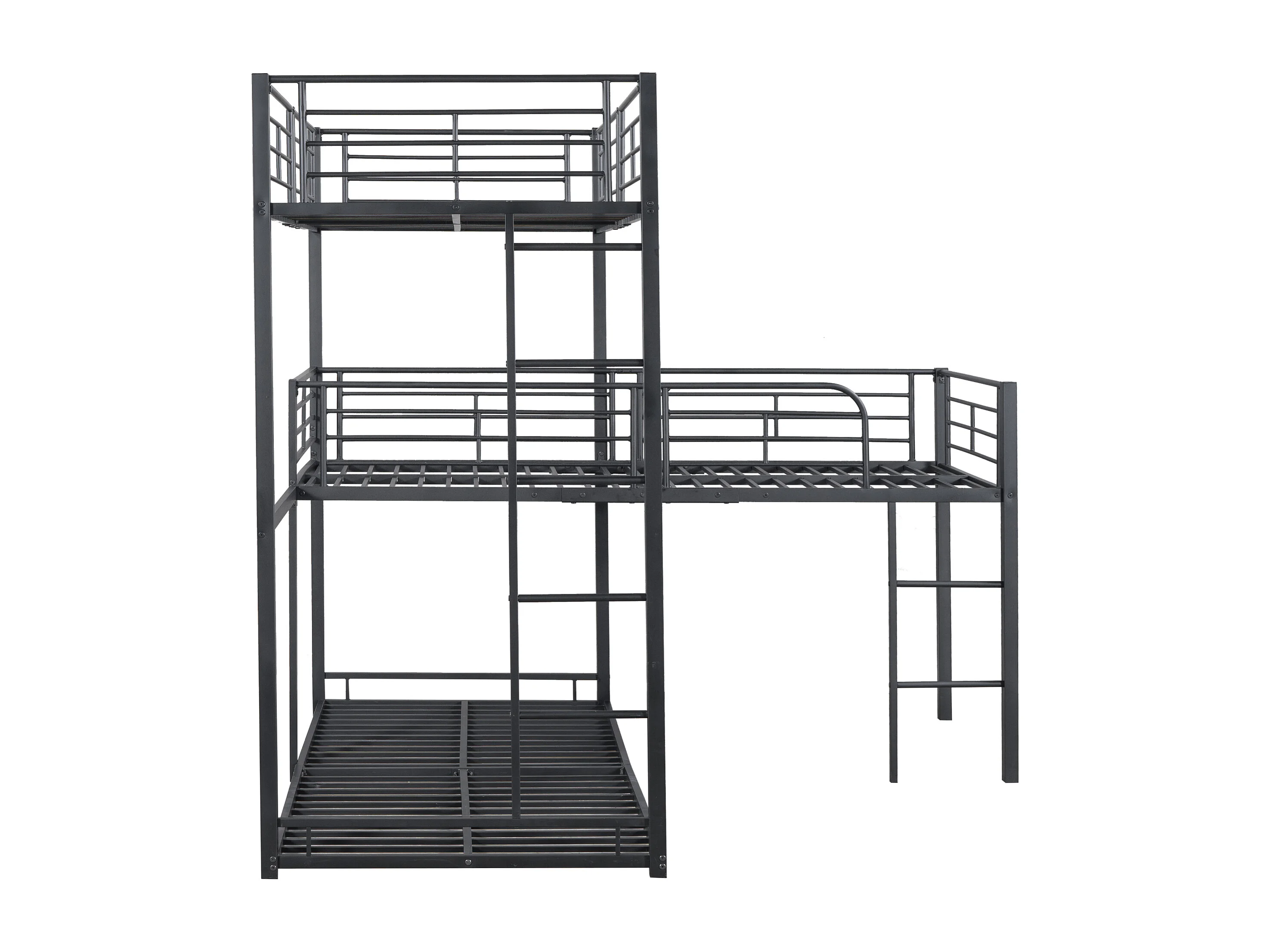 Lits superposés triples 90 x 200 cm - Garde-corps haut et échelle - Métal - Noir