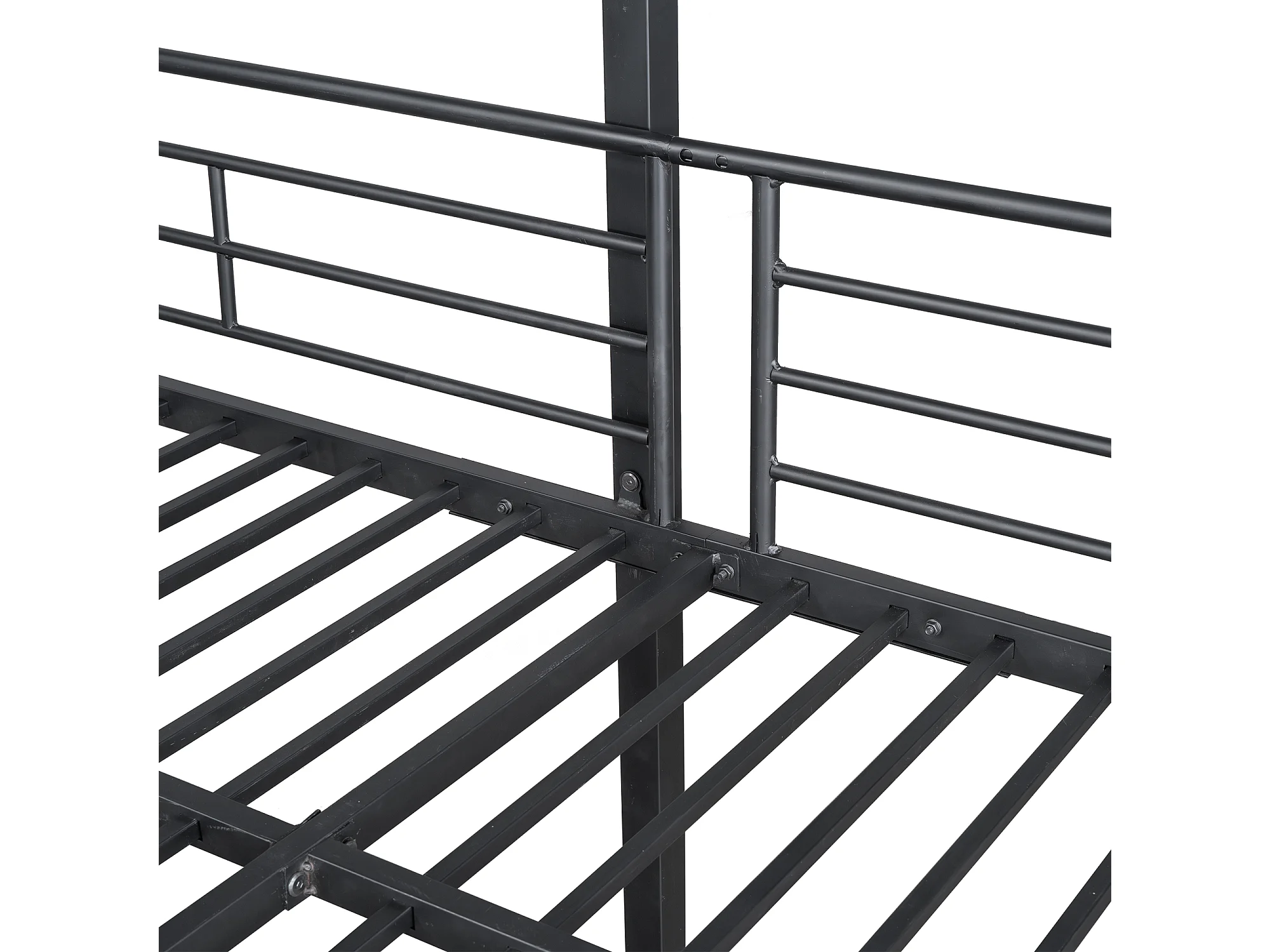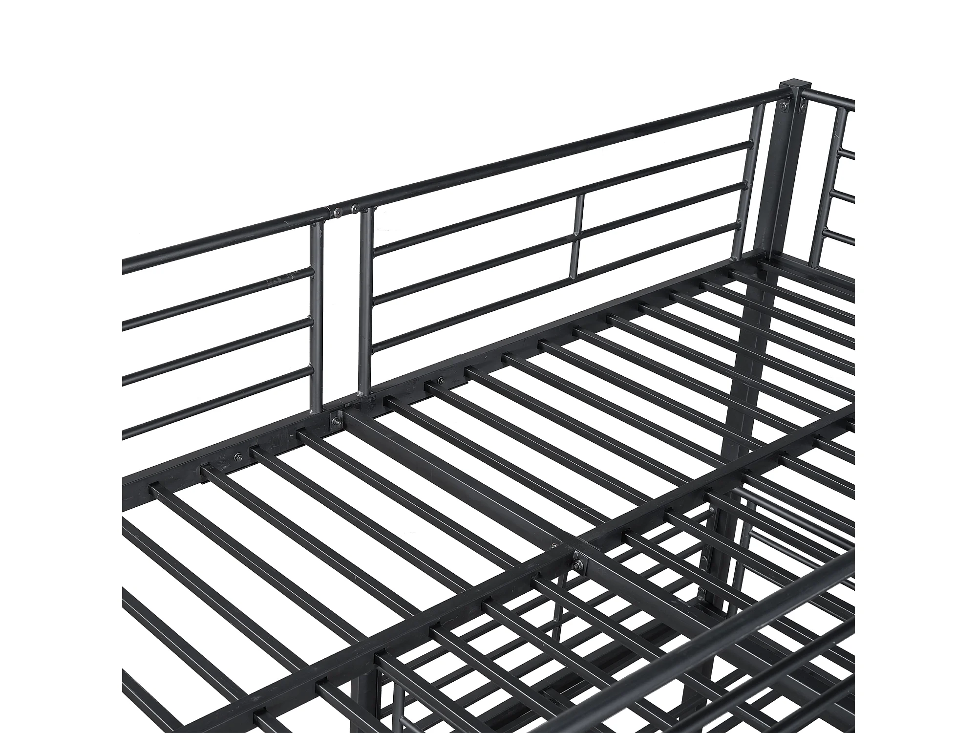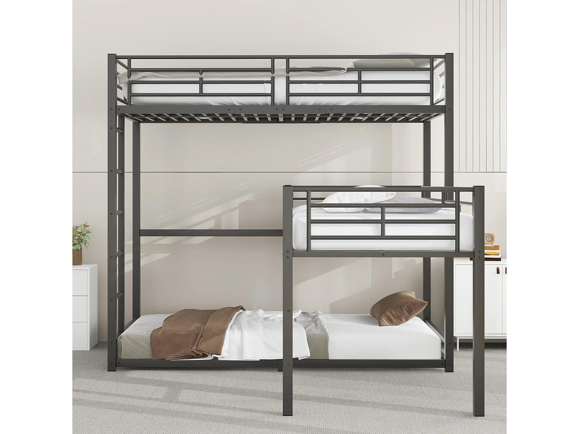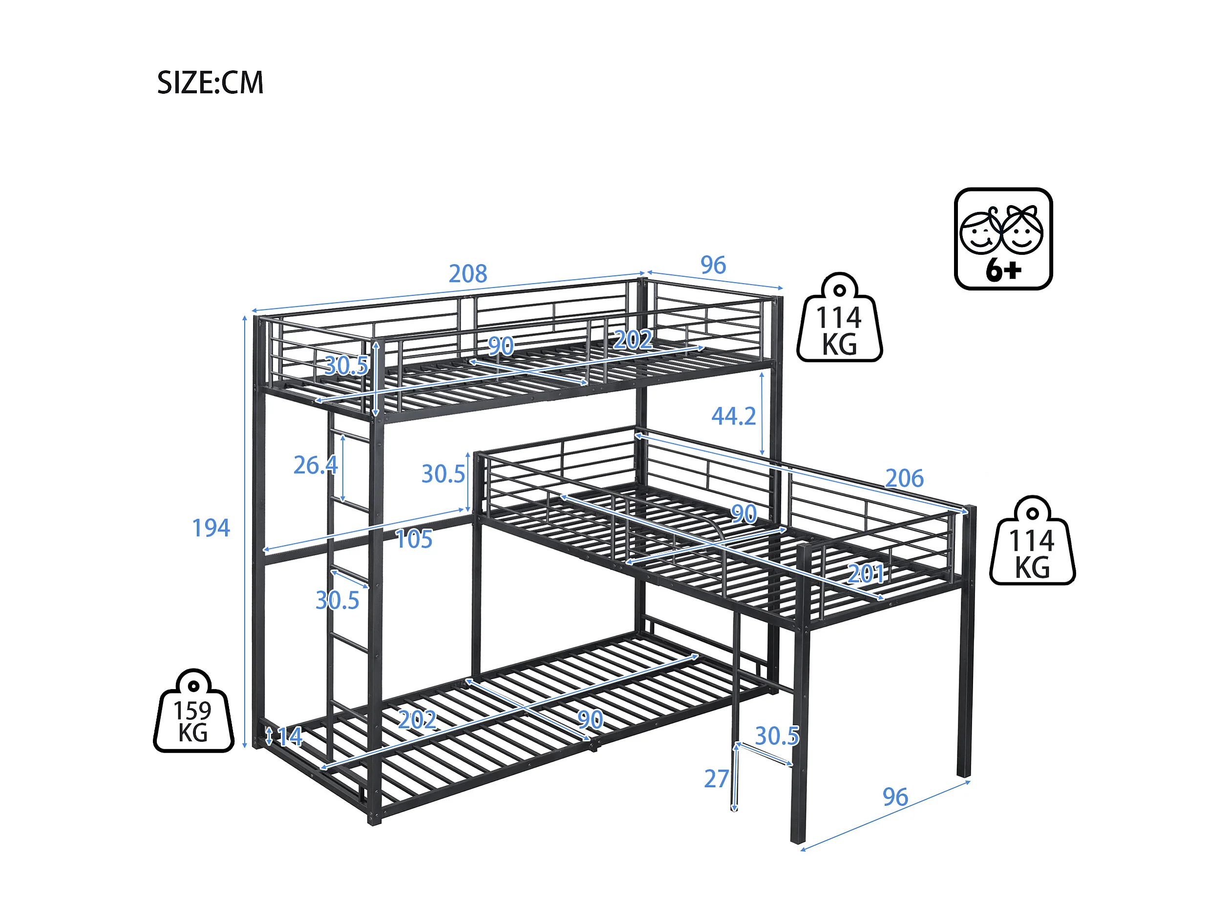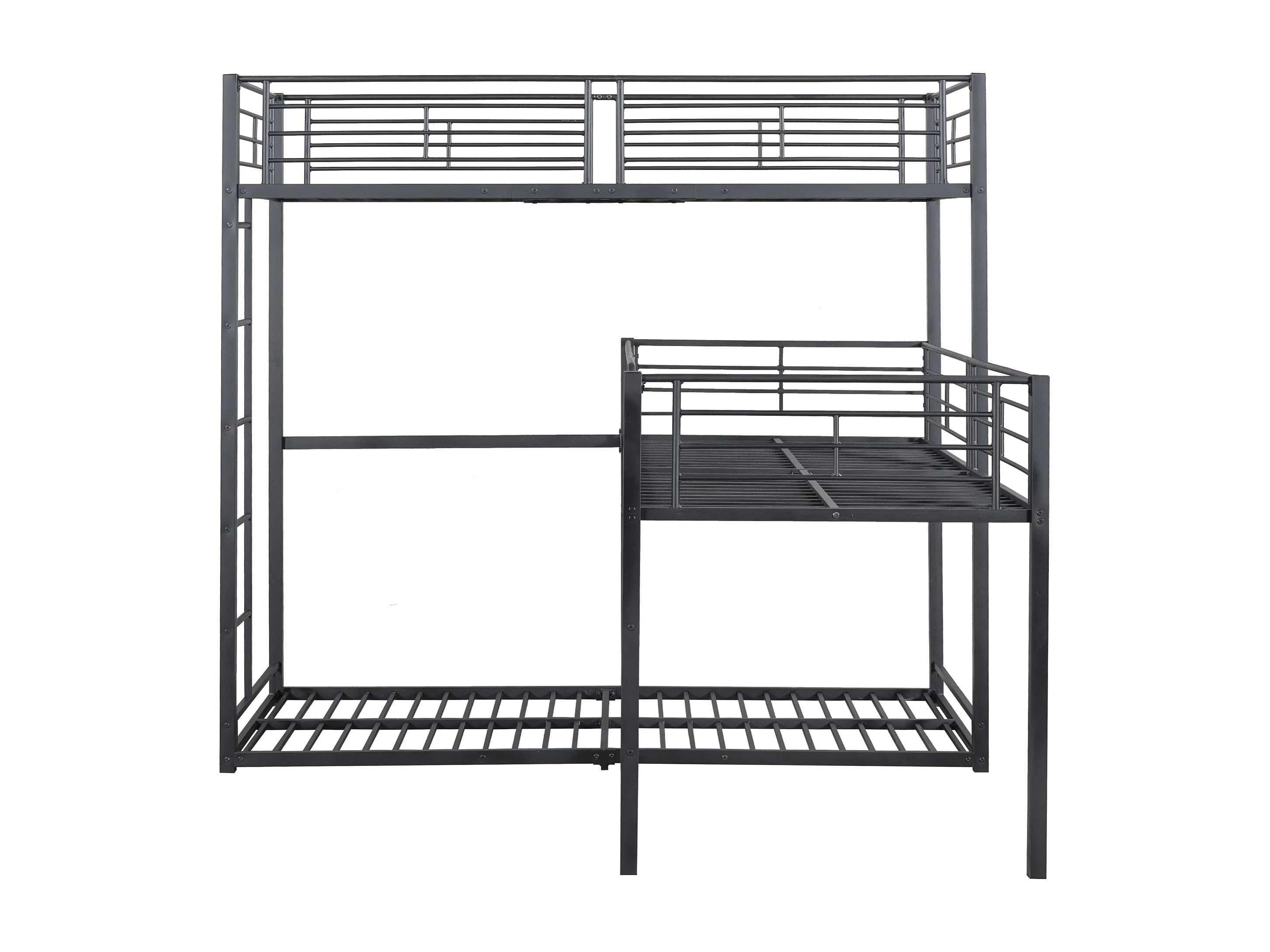 Lits superposés triples 90 x 200 cm - Garde-corps haut et échelle - Métal - Noir