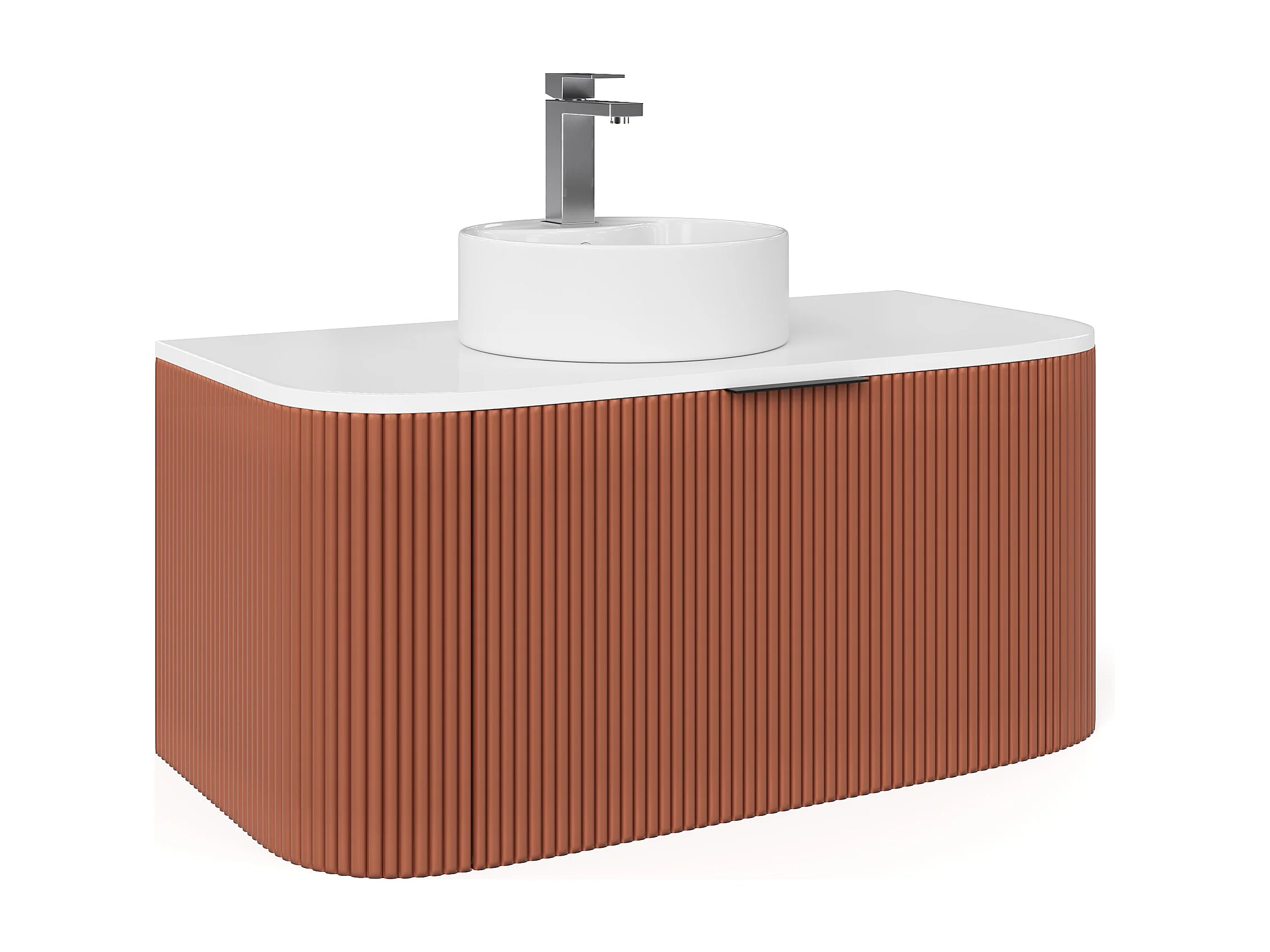Meuble de salle de bain suspendu strié avec vasque à poser ronde et robinet - Terracotta mat - 100 cm - LOMERI